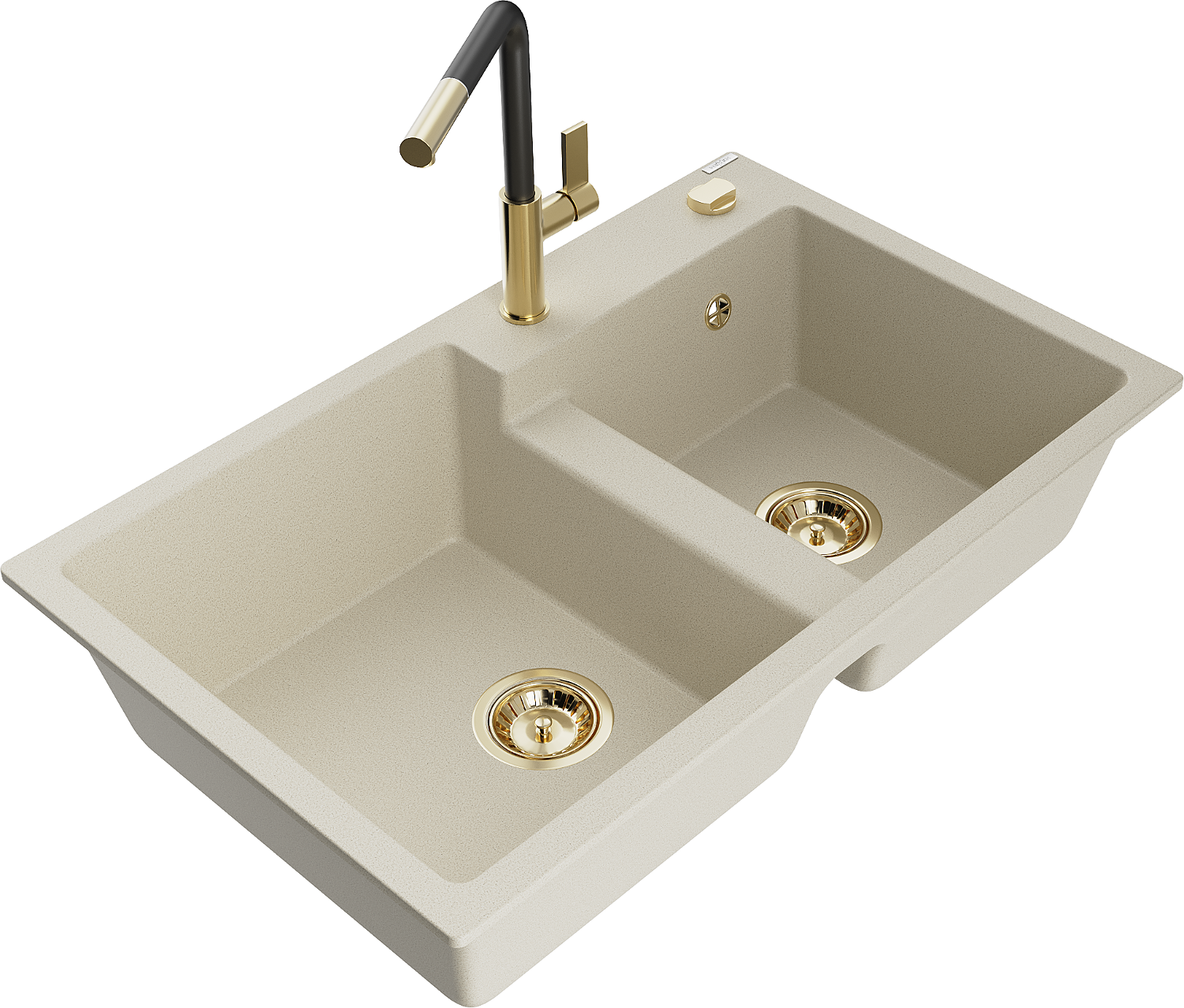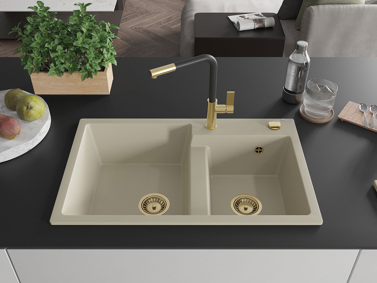 Mexen Tomas évier en granit 2 bacs avec robinet de cuisine Flora, beige - 6516-69-670401-57-G