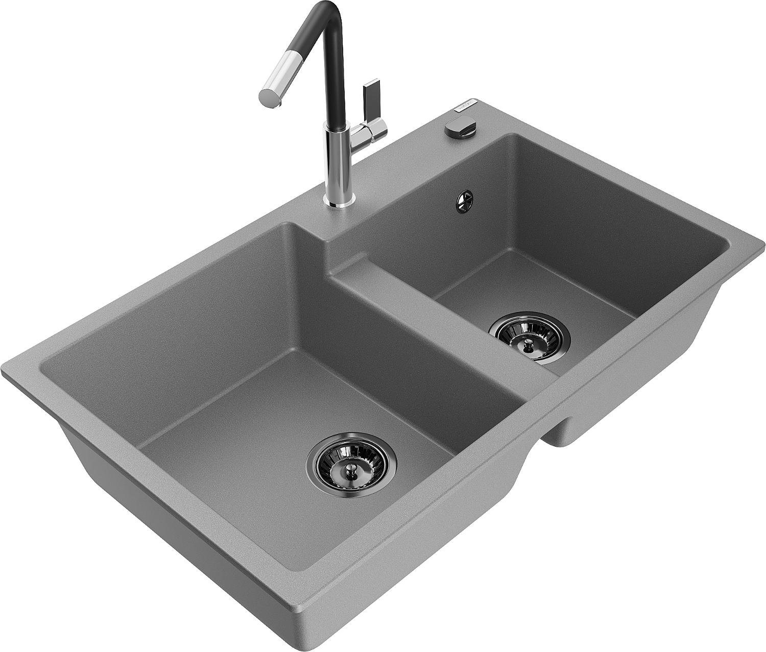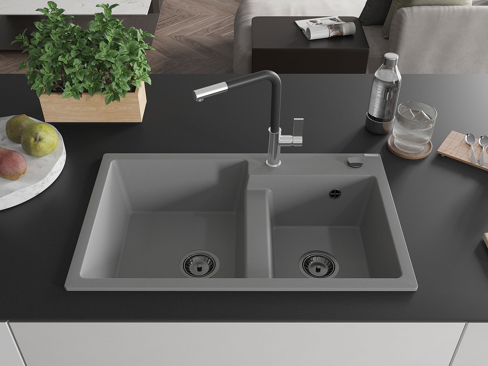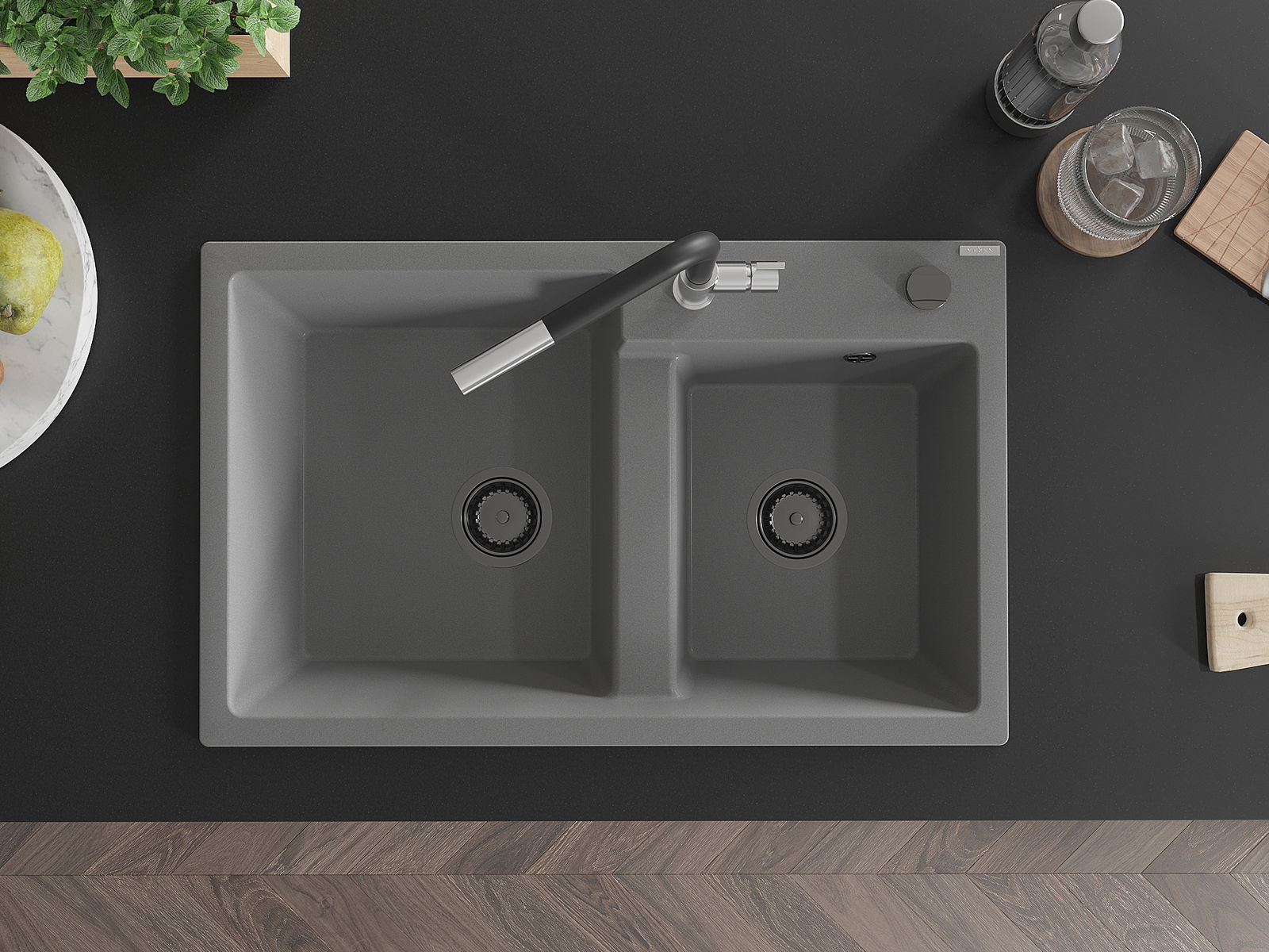 Mexen Tomas évier en granit 2 bacs avec robinet de cuisine Flora, gris - 6516-71-670401-07-B