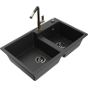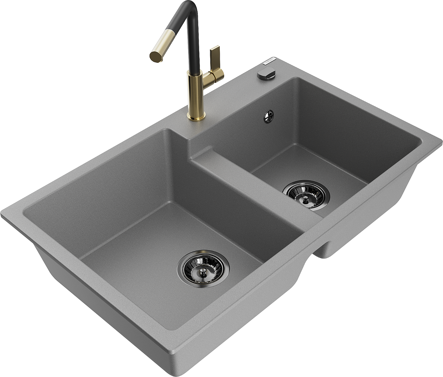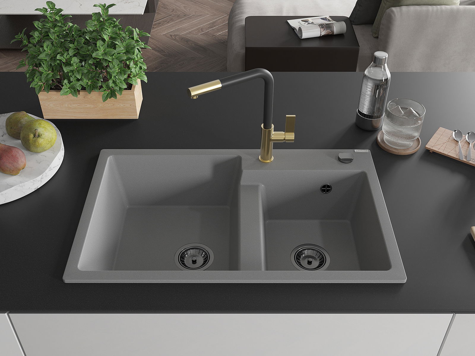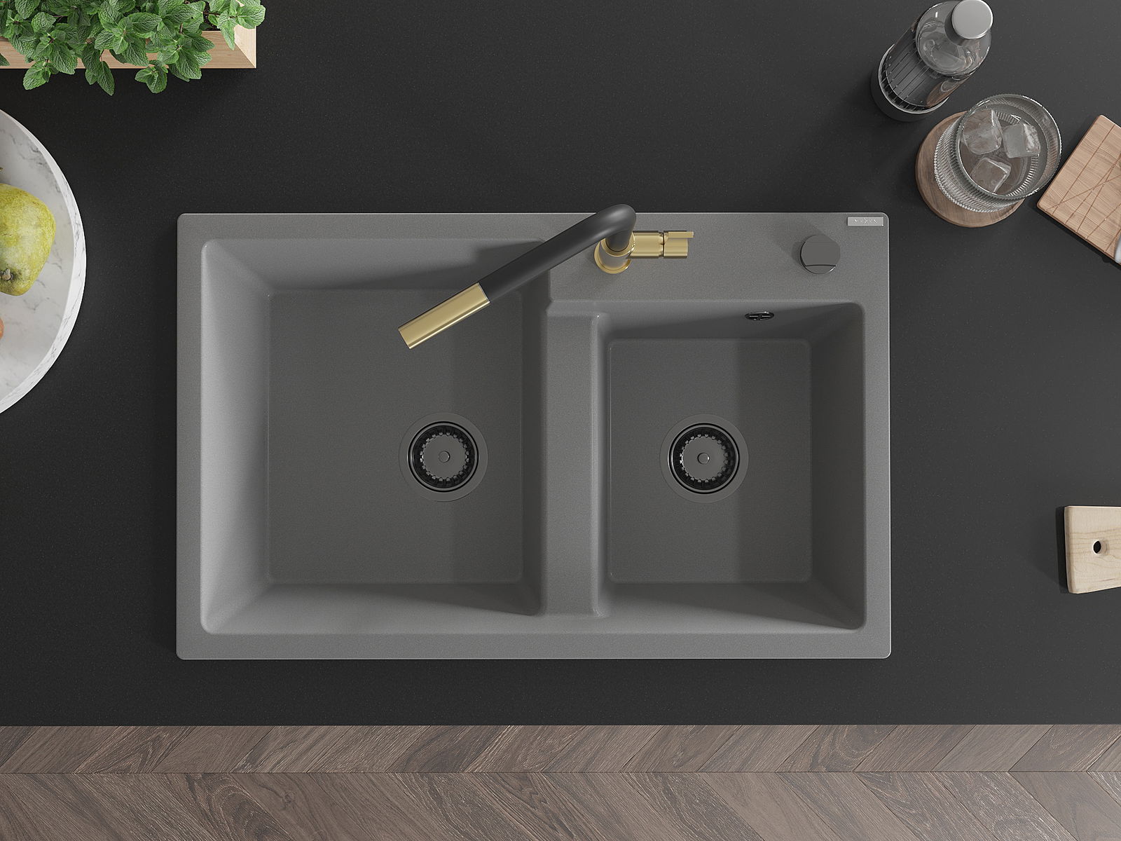 Mexen Tomas évier en granit 2 bacs avec robinet de cuisine Flora, gris - 6516-71-670401-57-B