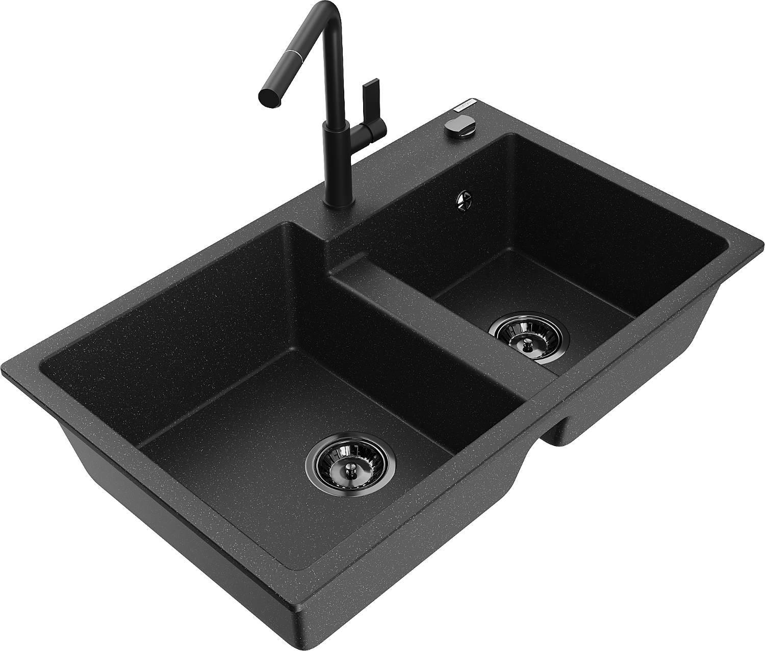 Mexen Tomas évier en granit 2 bacs avec robinet de cuisine Flora, noir/argent métallisé - 6516-73-670401-70-B