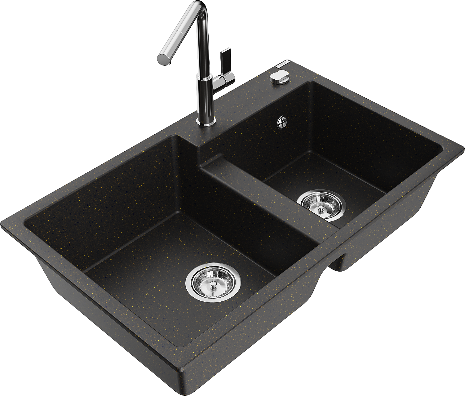 Mexen Tomas évier en granit à 2 bacs avec robinet de cuisine Flora, noir/or métallique - 6516-75-670401-00