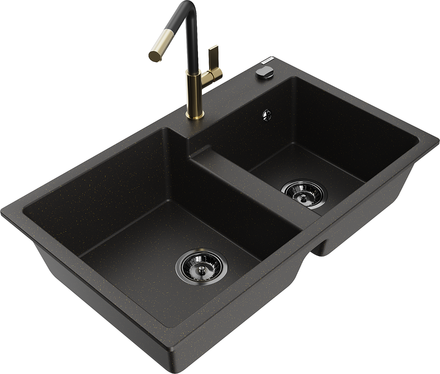 Mexen Tomas évier en granit 2 bacs avec robinet de cuisine Flora, noir/or métallique - 6516-75-670401-57-B
