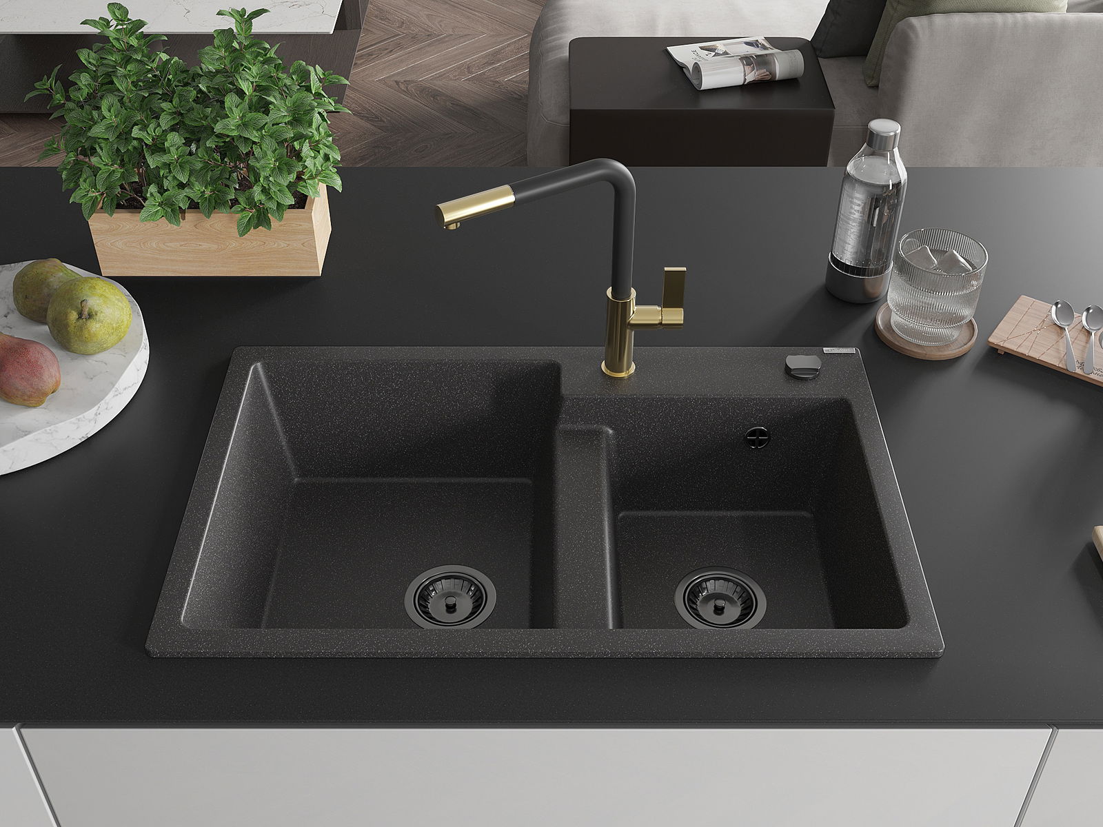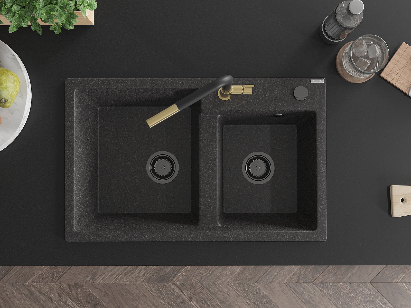 Mexen Tomas évier en granit 2 bacs avec robinet de cuisine Flora, noir moucheté - 6516-76-670401-57-B