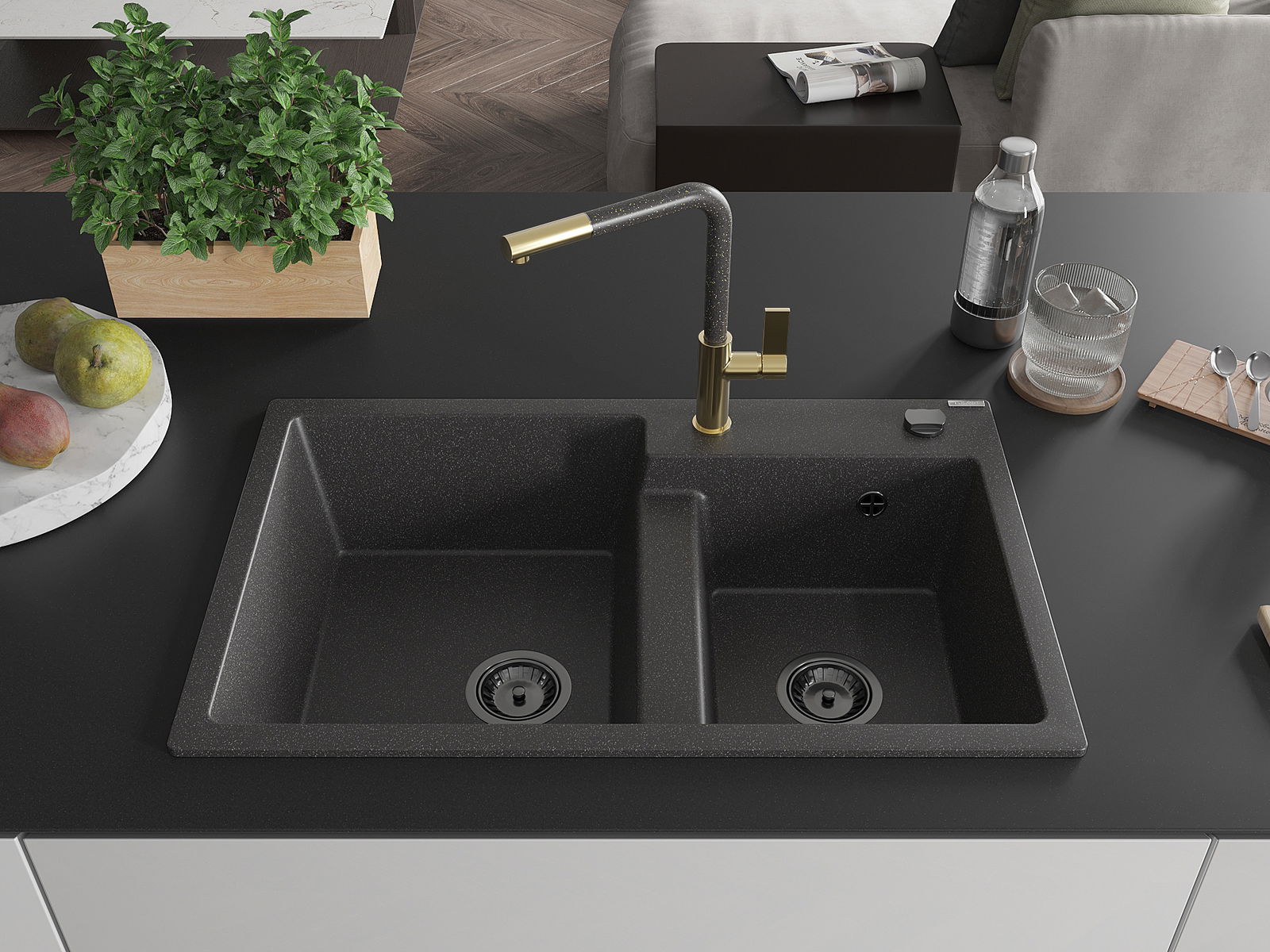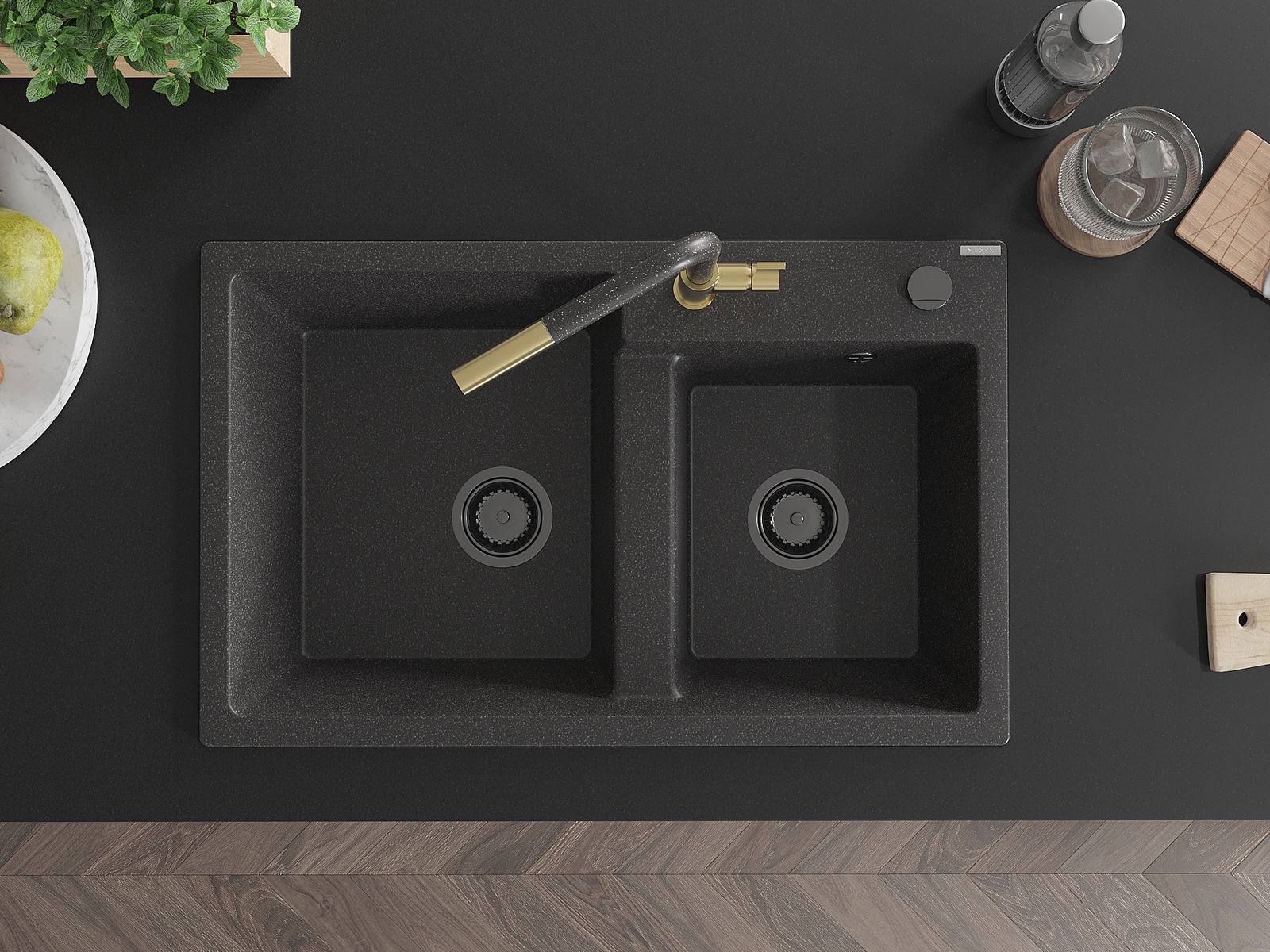 Mexen Tomas évier en granit 2-bacs avec robinetterie de cuisine Flora, noir moucheté - 6516-76-670401-75-B