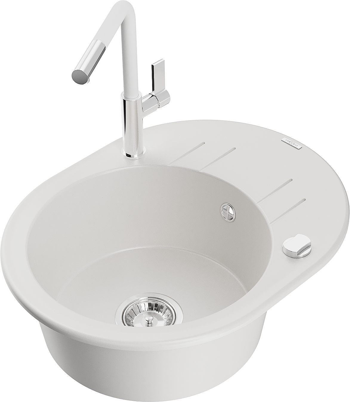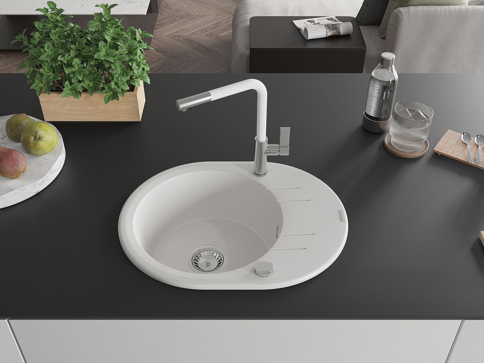 Mexen Kevin évier en granit à 1 bac avec égouttoir et mitigeur de cuisine Flora, blanc - 6517-20-670401-02