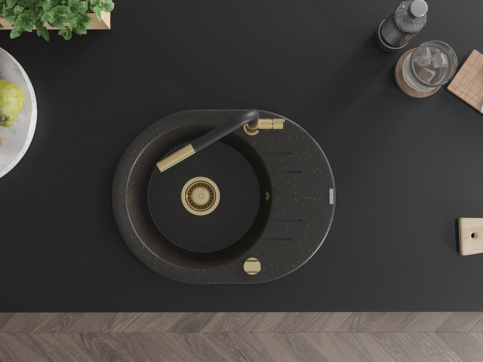 Mexen Kevin évier en granit 1 bac avec égouttoir et robinet de cuisine Flora, noir/or métallisé - 6517-75-670401-57-G