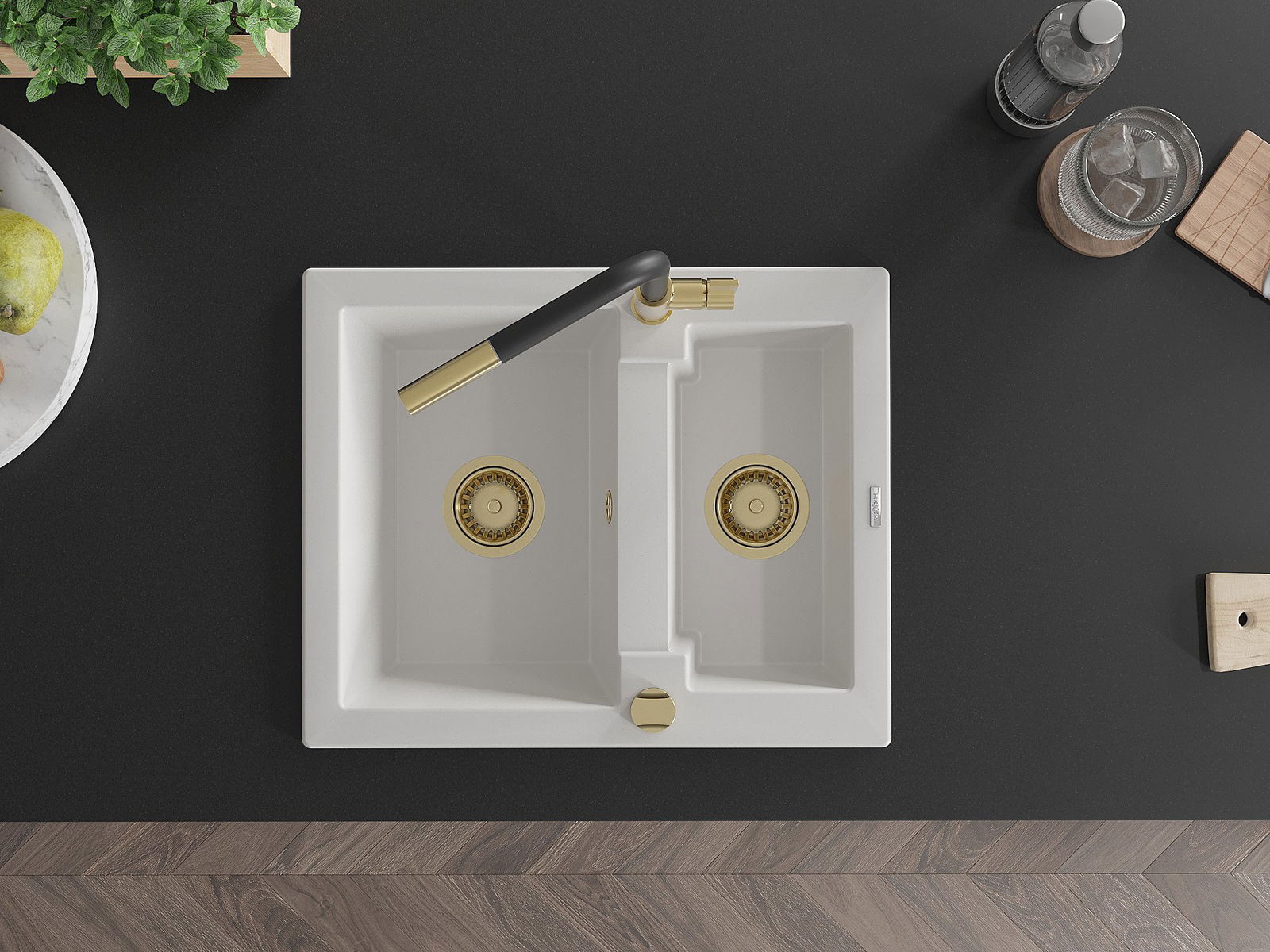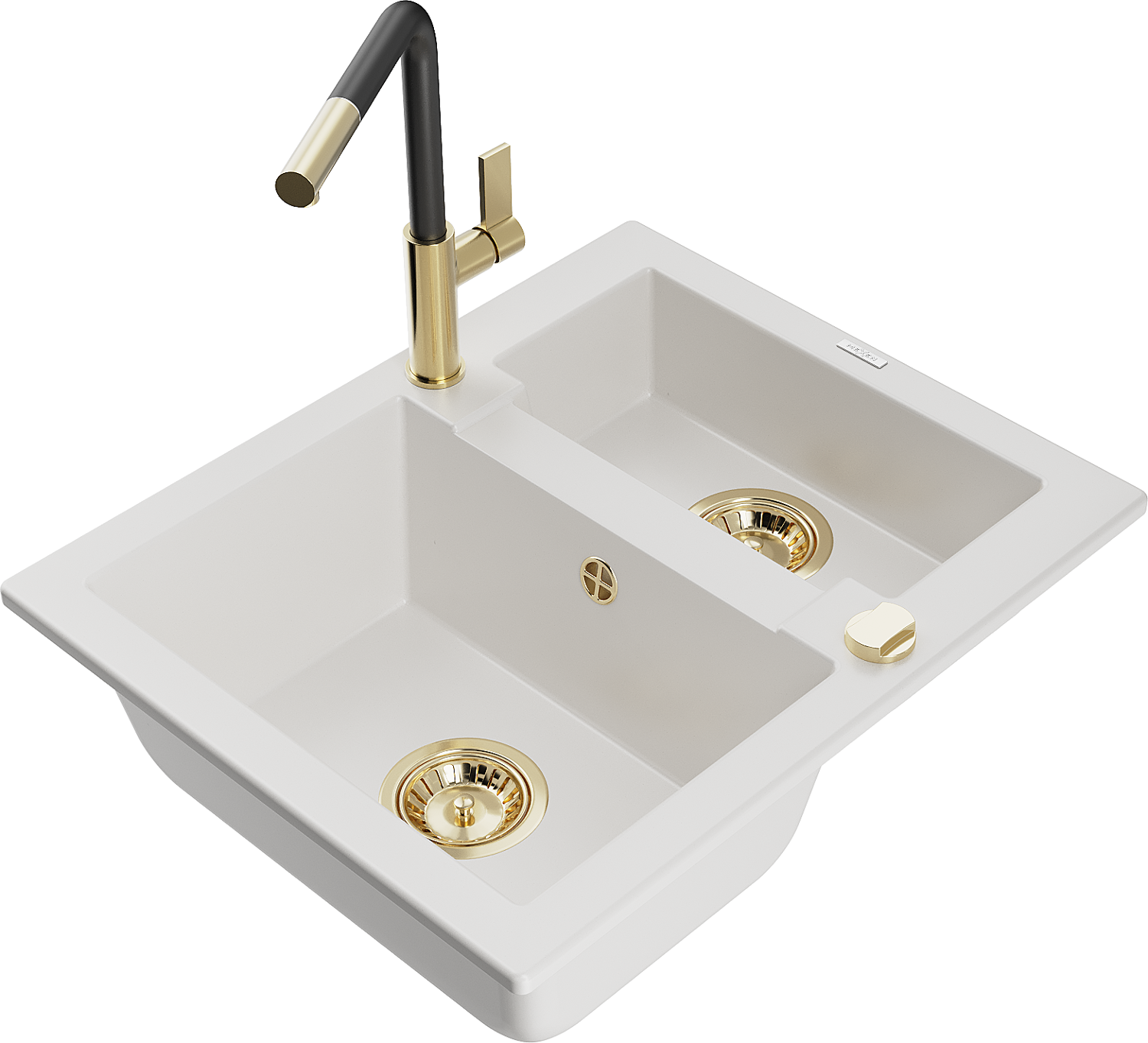 Mexen Carlos évier en granit 1,5 bac avec robinet de cuisine Flora, blanc - 6518-20-670401-57-G