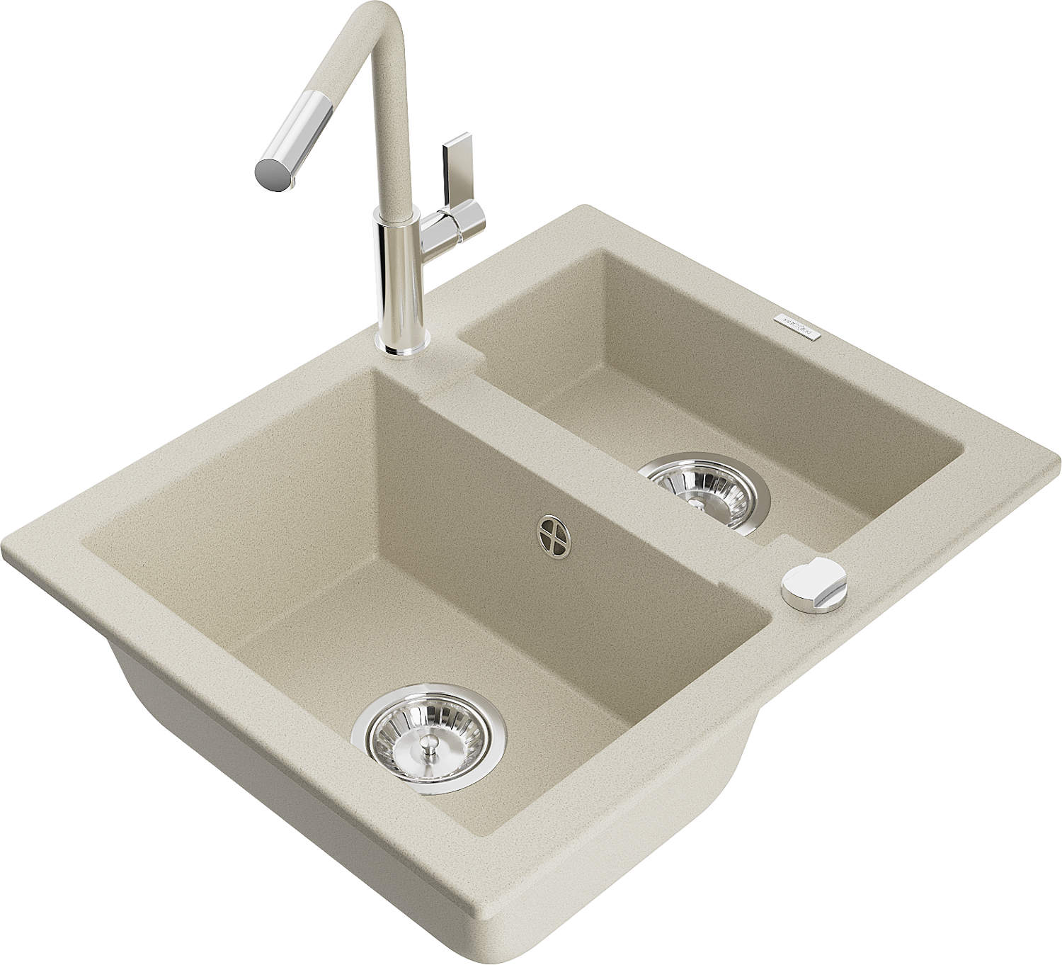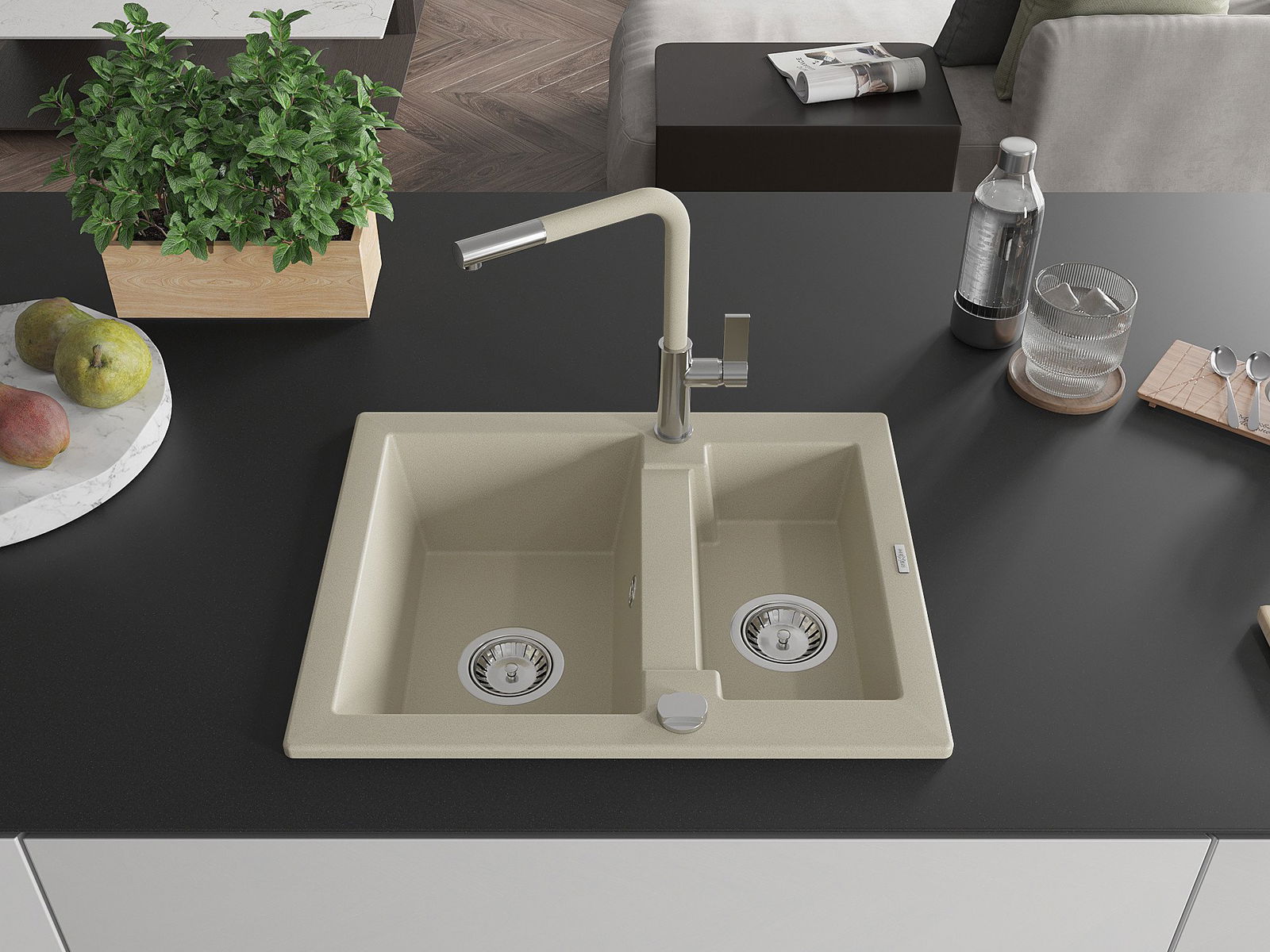 Mexen Carlos évier en granit 1,5 bac avec robinet de cuisine Flora, beige - 6518-69-670401-09