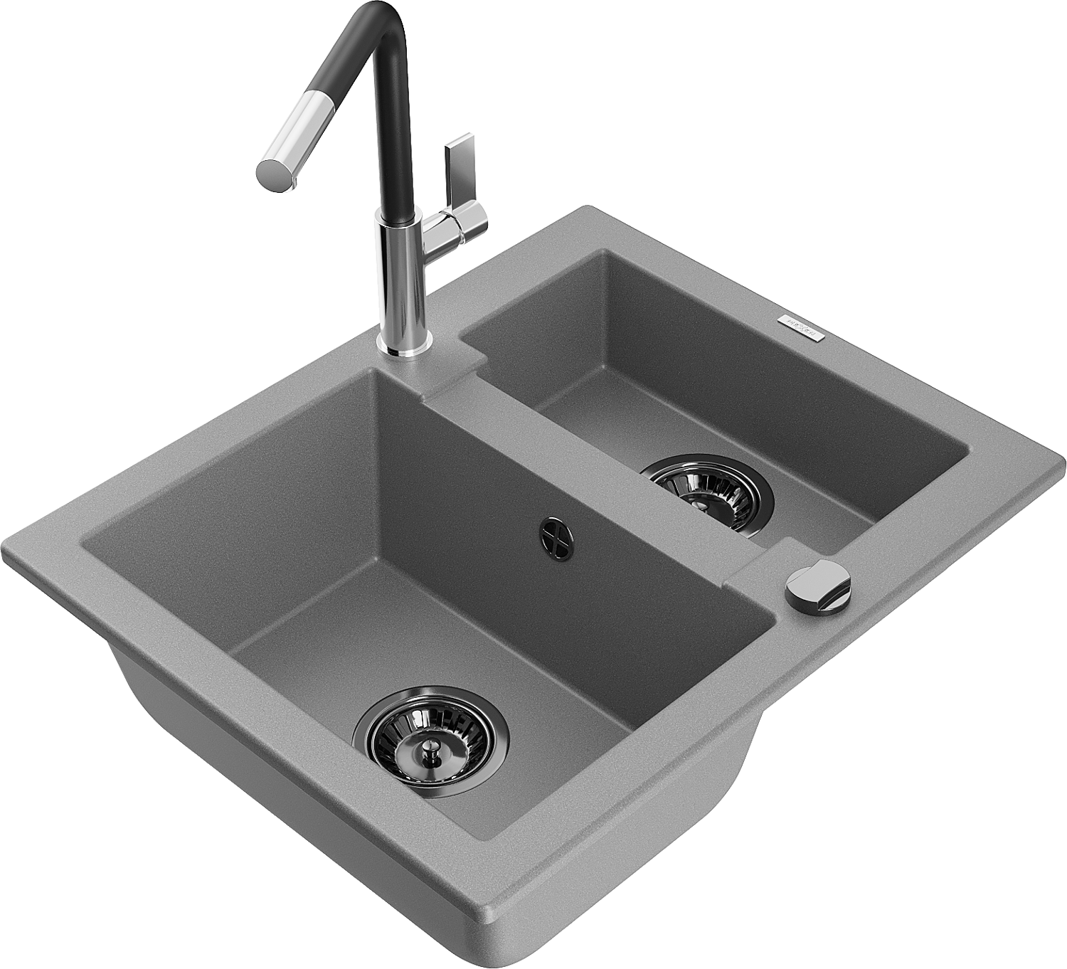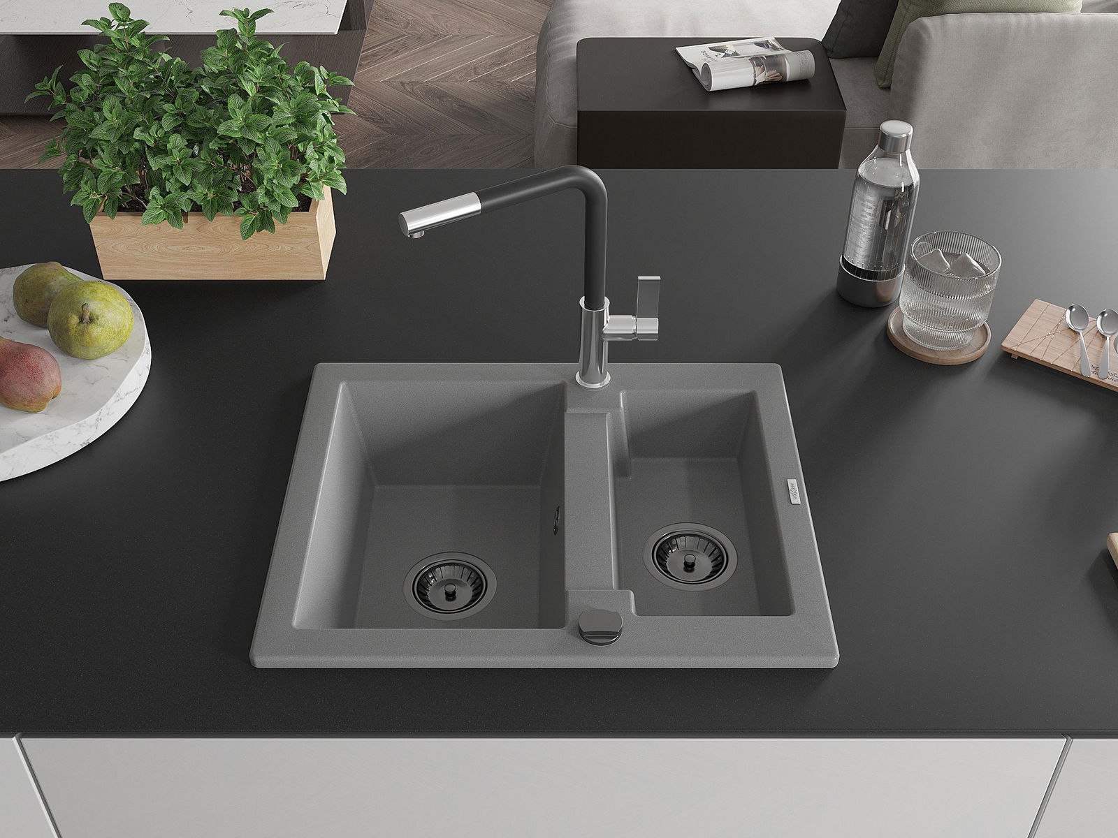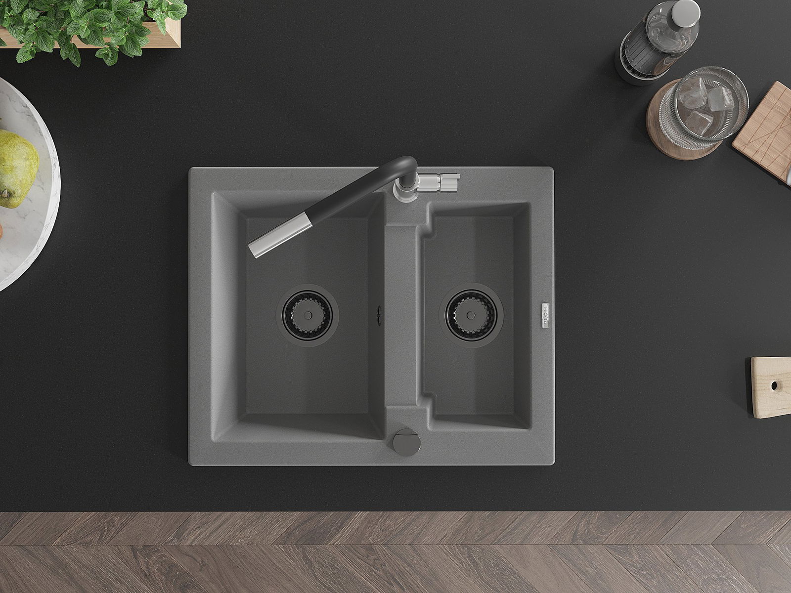 Mexen Carlos évier en granit 1,5 bac avec robinet de cuisine Flora, gris - 6518-71-670401-07-B