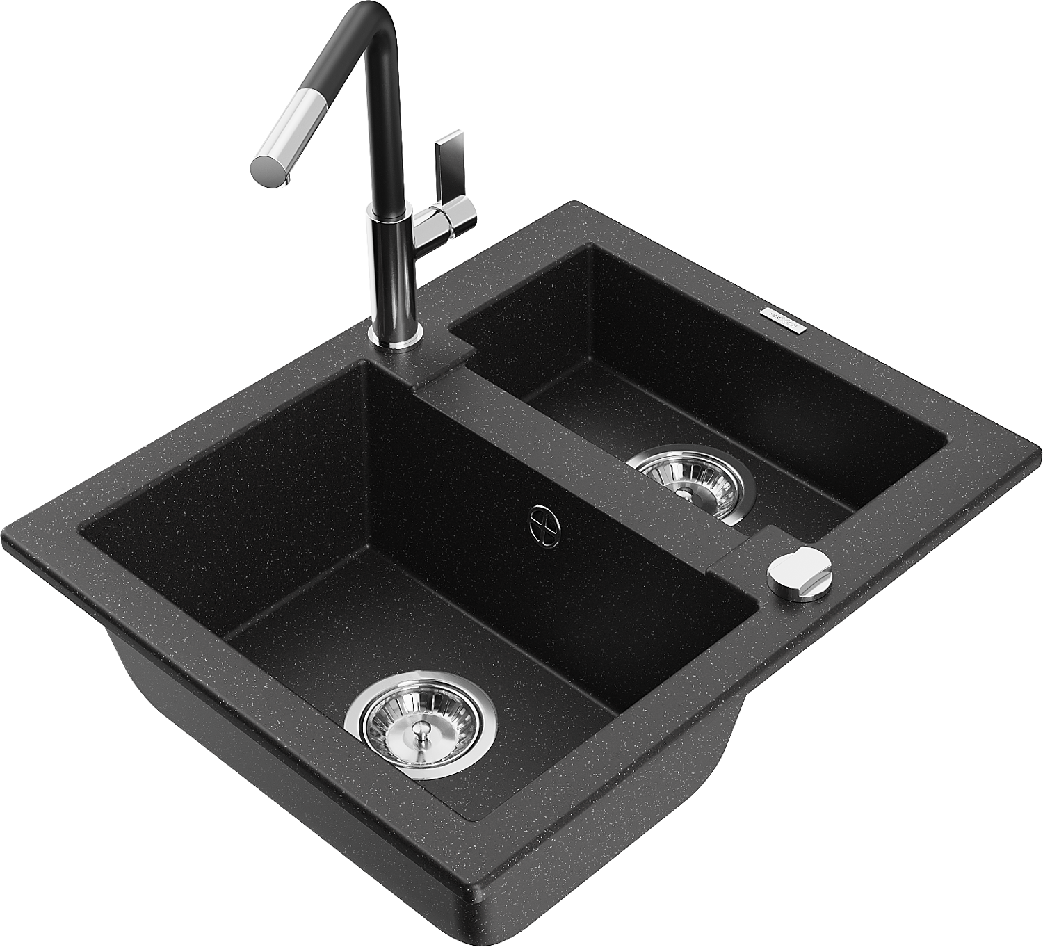 Mexen Carlos évier en granit 1,5 bac avec robinet de cuisine Flora, noir/métallisé argent - 6518-73-670401-07