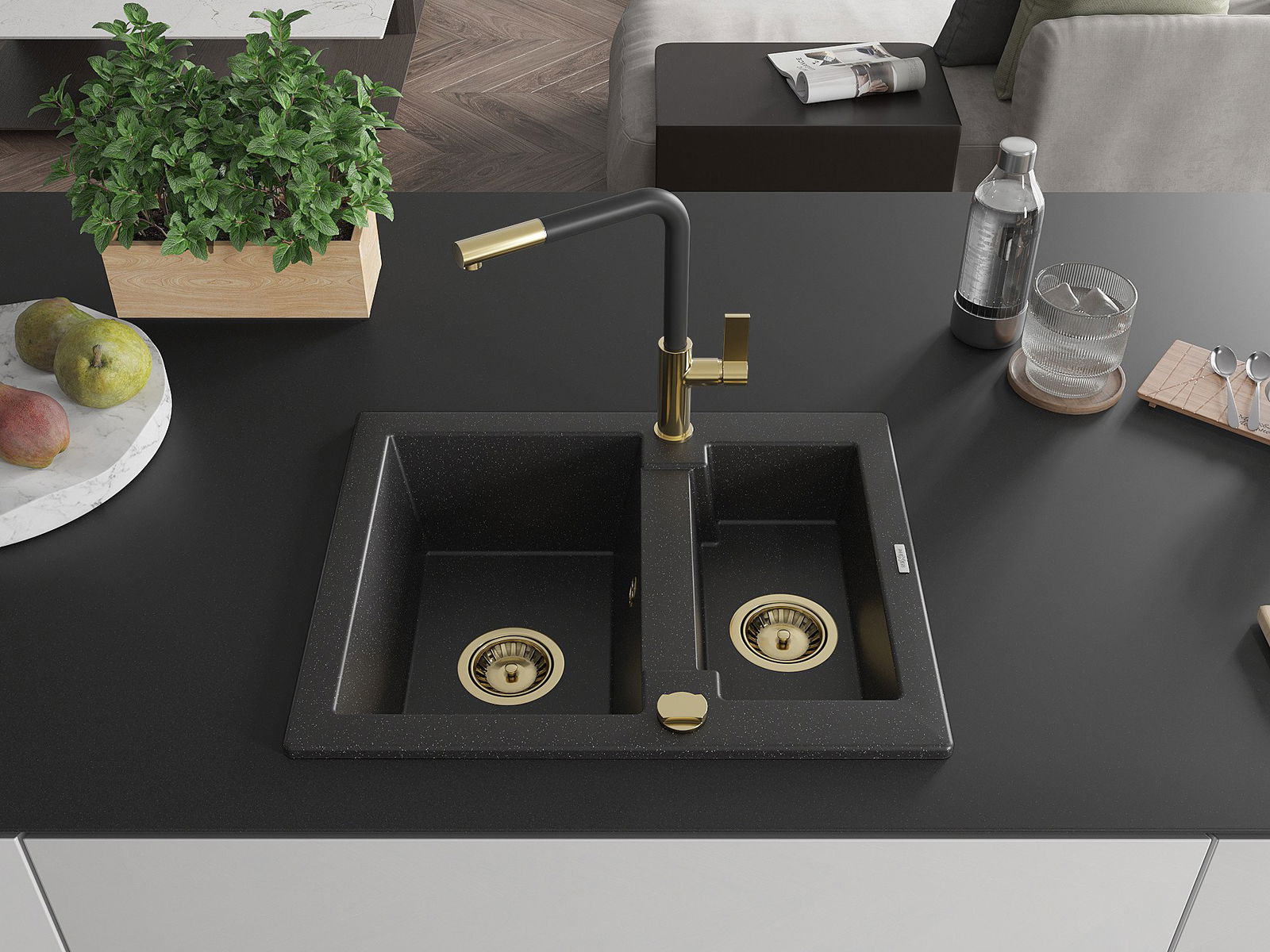 Mexen Carlos évier en granit 1,5 bac avec robinet de cuisine Flora, noir/métallisé argenté - 6518-73-670401-57-G