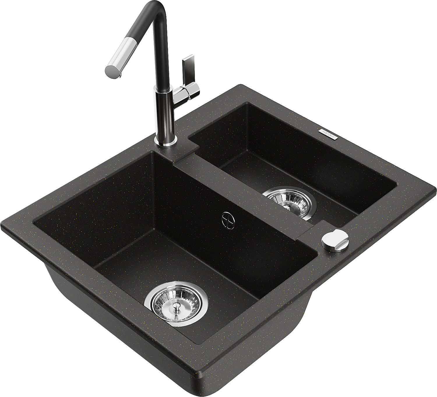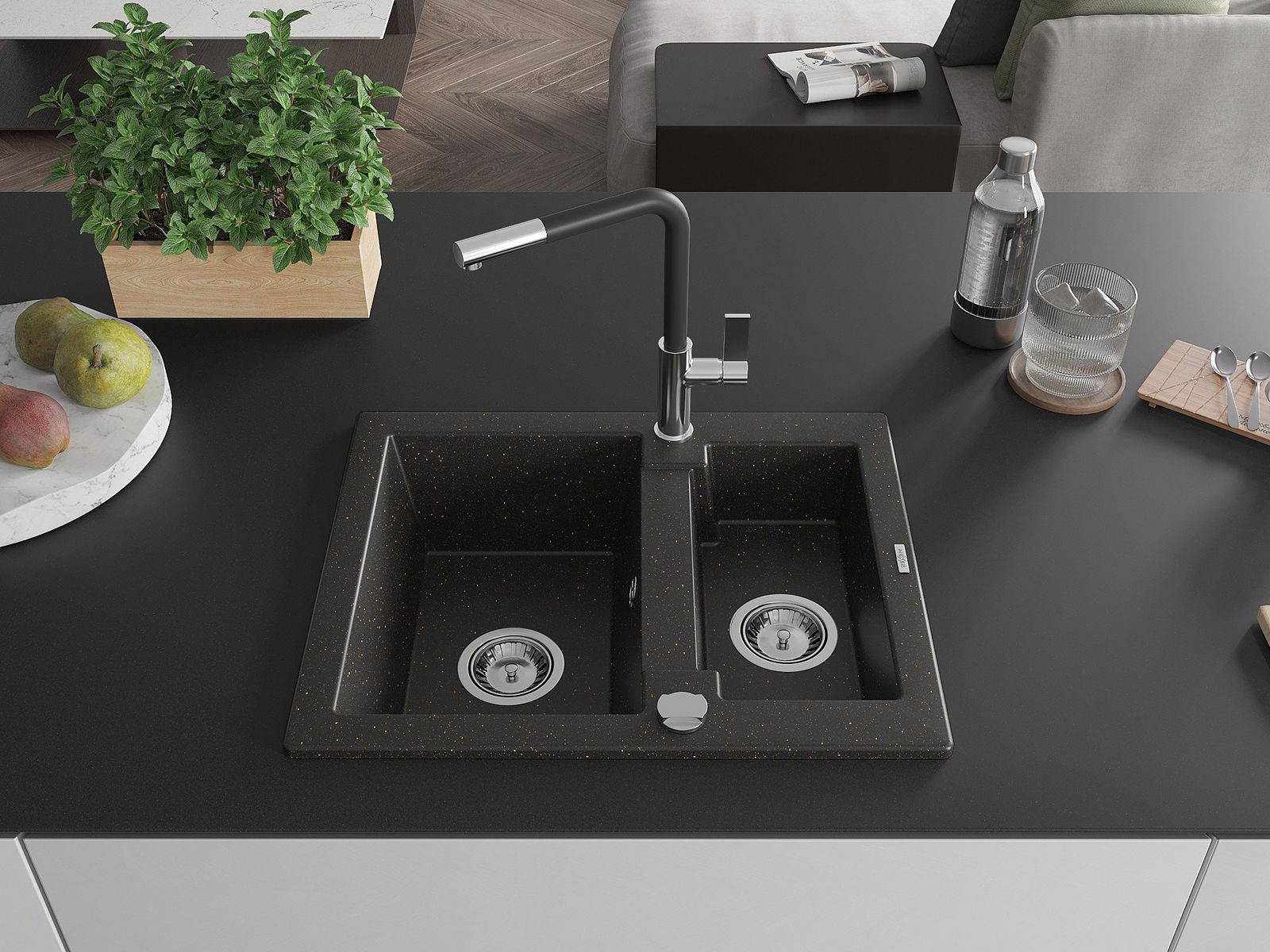 Mexen Carlos évier en granit 1,5-bac avec robinet de cuisine Flora, noir/métallisé doré - 6518-75-670401-07