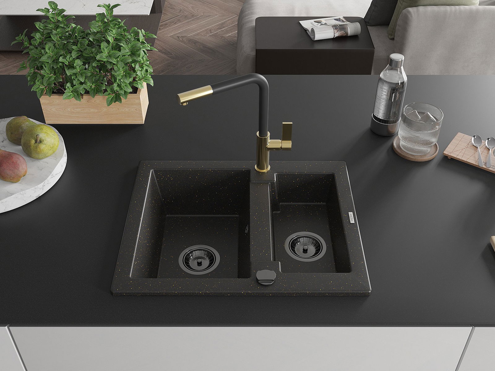 Mexen Carlos évier en granit 1,5 bac avec robinet de cuisine Flora, noir/doré métallique - 6518-75-670401-57-B