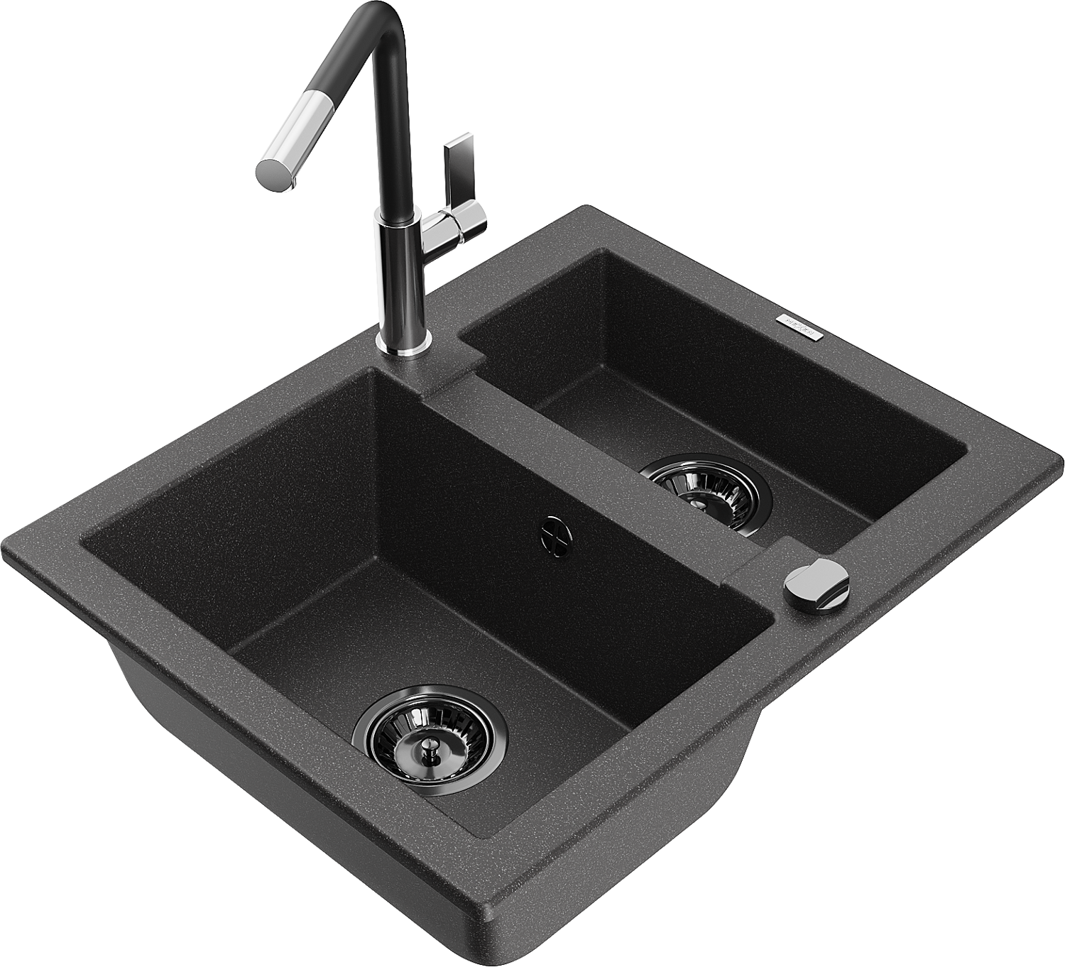 Mexen Carlos évier en granit 1,5 bac avec robinet de cuisine Flora, noir moucheté - 6518-76-670401-07-B