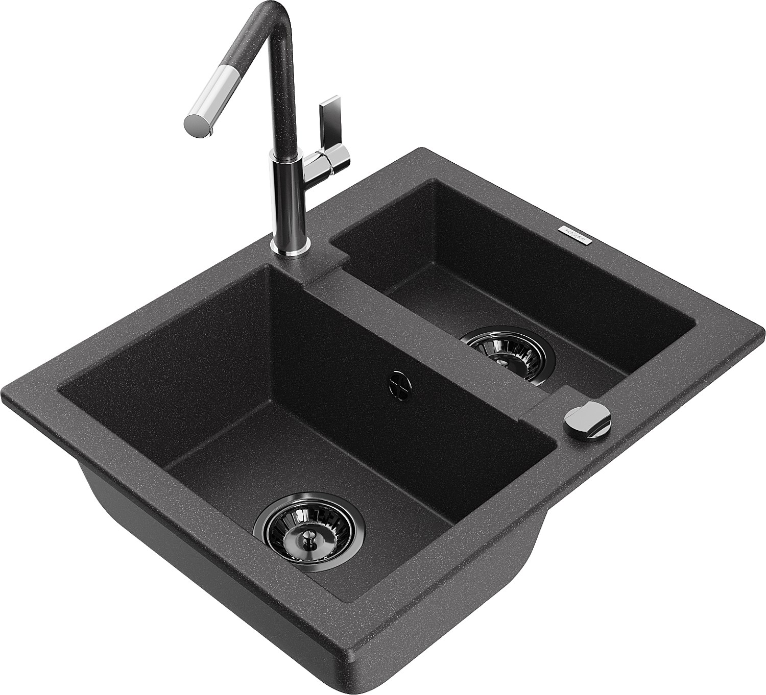 Mexen Carlos évier en granit 1,5 bac avec robinet de cuisine Flora, noir moucheté - 6518-76-670401-08-B
