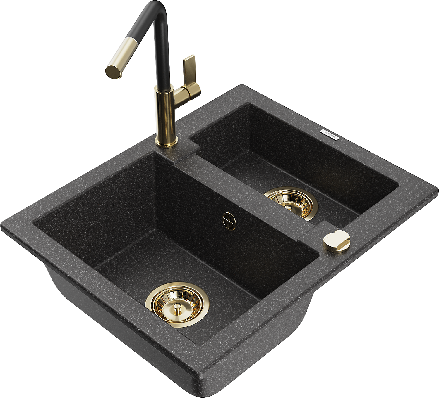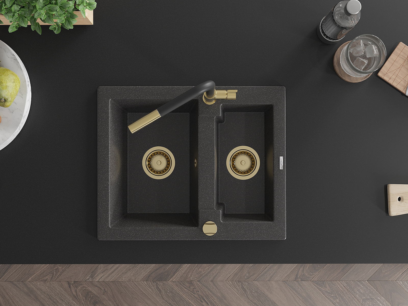 Mexen Carlos évier en granit 1,5 bac avec robinet de cuisine Flora, noir moucheté - 6518-76-670401-57-G