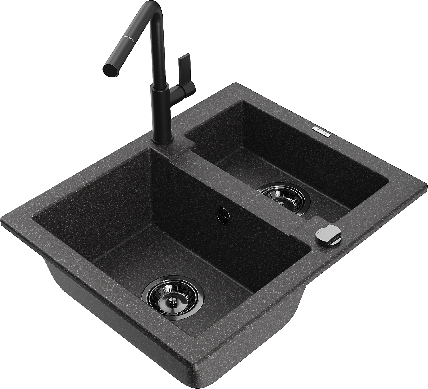 Mexen Carlos évier en granit 1,5 bac avec robinet de cuisine Flora, noir moucheté - 6518-76-670401-70-B