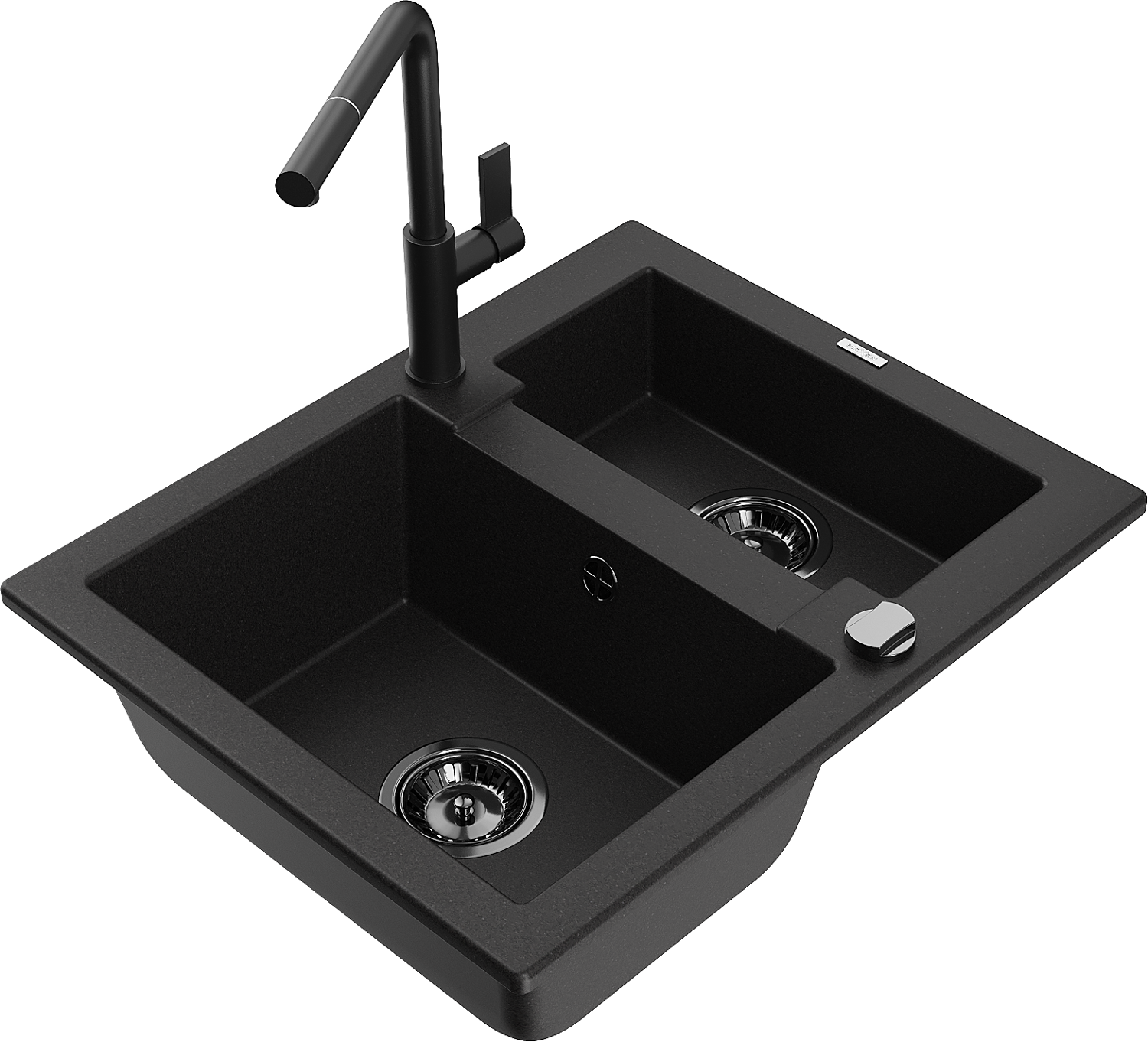 Mexen Carlos évier granit 1,5 cuves avec robinet de cuisine Flora, noir - 6518-77-670401-70-B