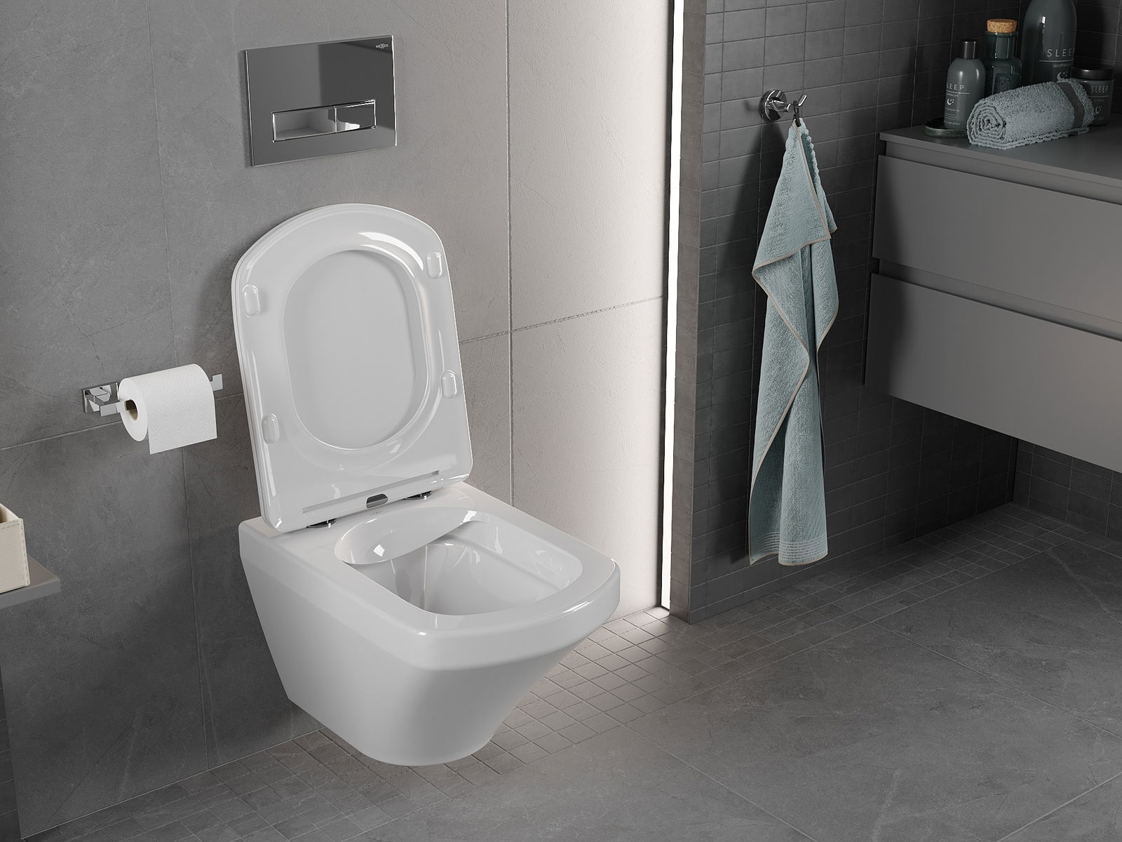 Système moderne dans lequel tous les éléments de montage ont été cachés. C'est non seulement esthétique, mais aussi une solution très pratique. Cela facilite le maintien de la salle de bain propre et assure un aspect soigné de la salle de bain.