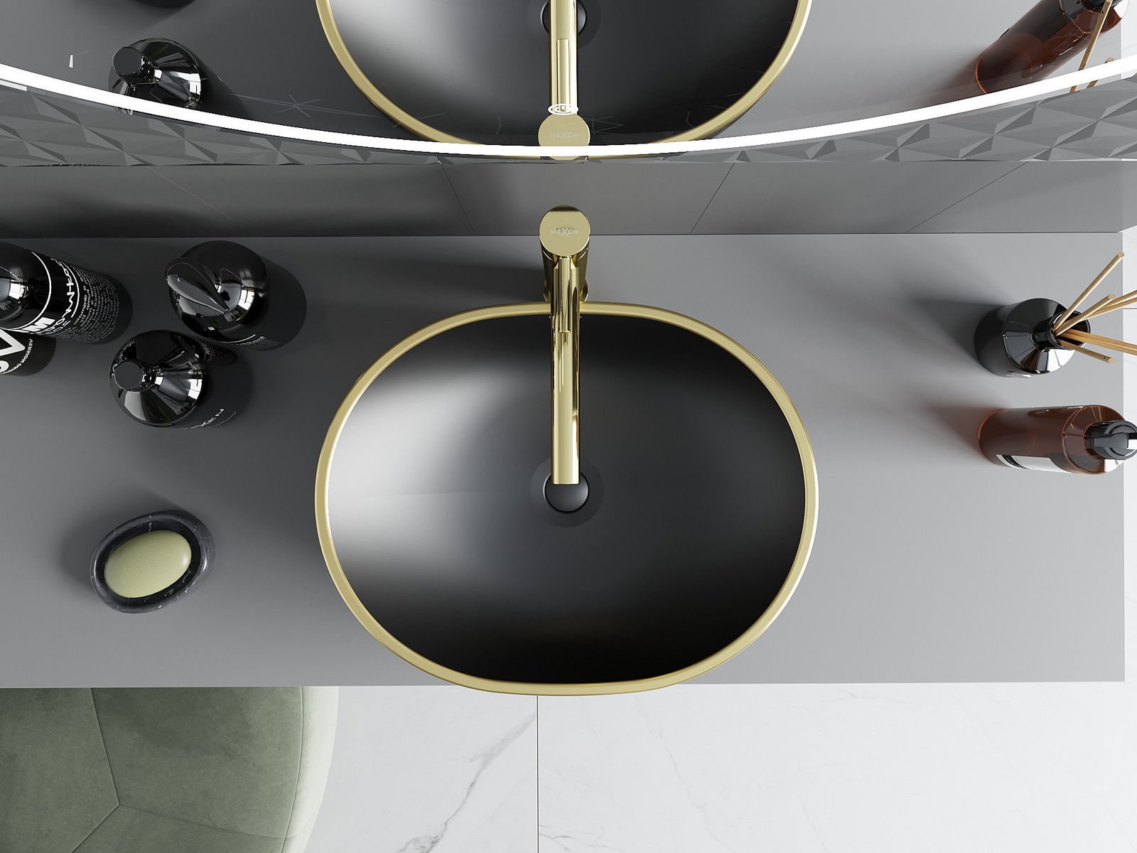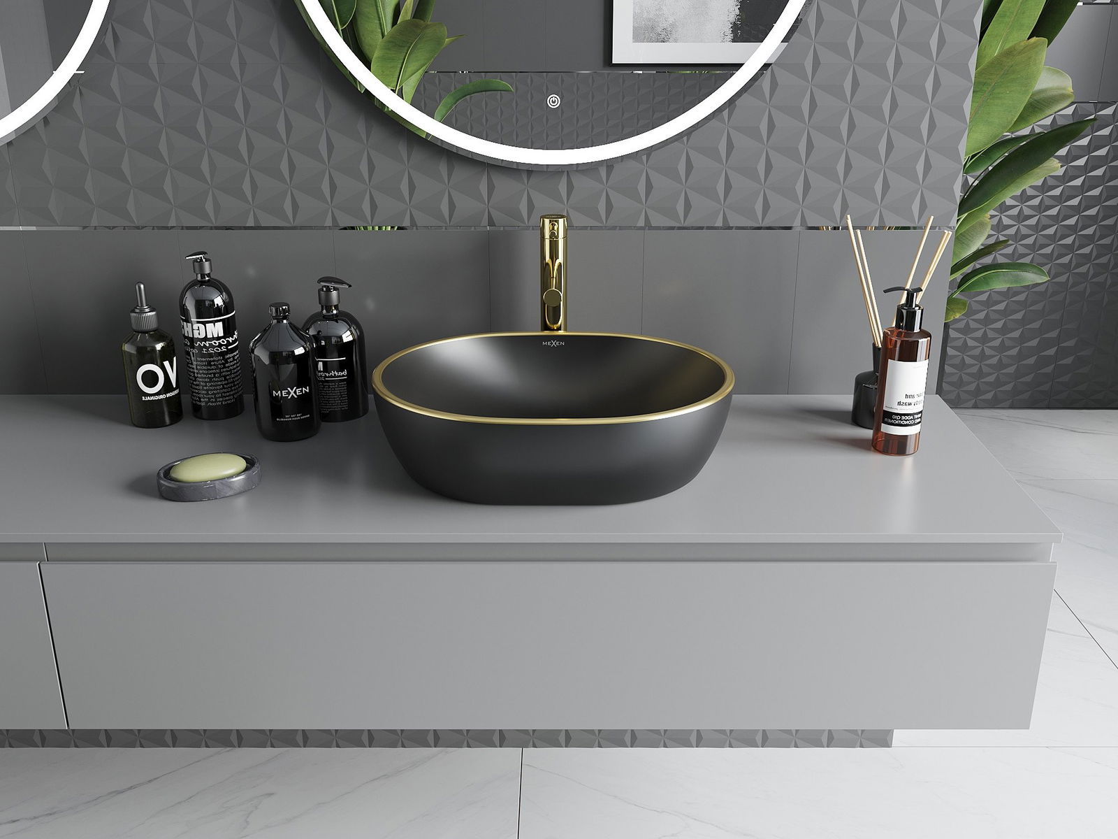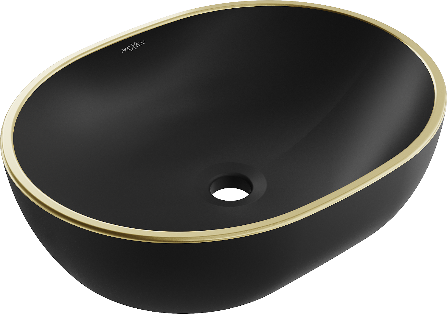 Mexen Viki est un élégant lavabo à poser aux dimensions de 48,5 x 35 cm, disponible dans un élégant mariage de noir mat avec un bord doré. Fabriqué en céramique sanitaire de haute qualité, il se distingue par une forme ovale et une surface brillante, ce qui lui confère un look moderne. L'absence de trous pour le robinet et de trop-plein crée un design minimaliste. Le revêtement protecteur assure une utilisation durable, et la fonctionnalité du lavabo le rend idéal pour toutes les salles de bains.