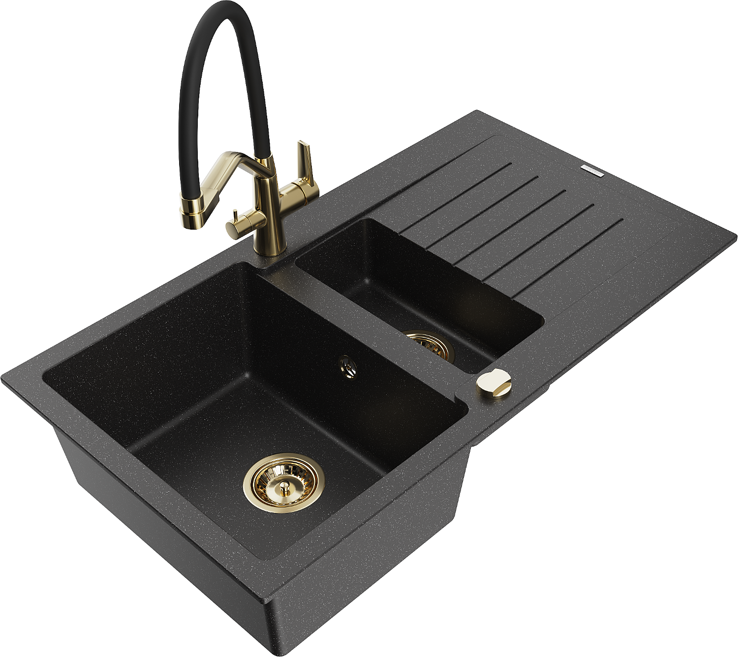 Mexen Matias évier en granit 1,5 bac avec égouttoir et robinet de cuisine Duo, noir/argent - 6502-73-671701-57-G