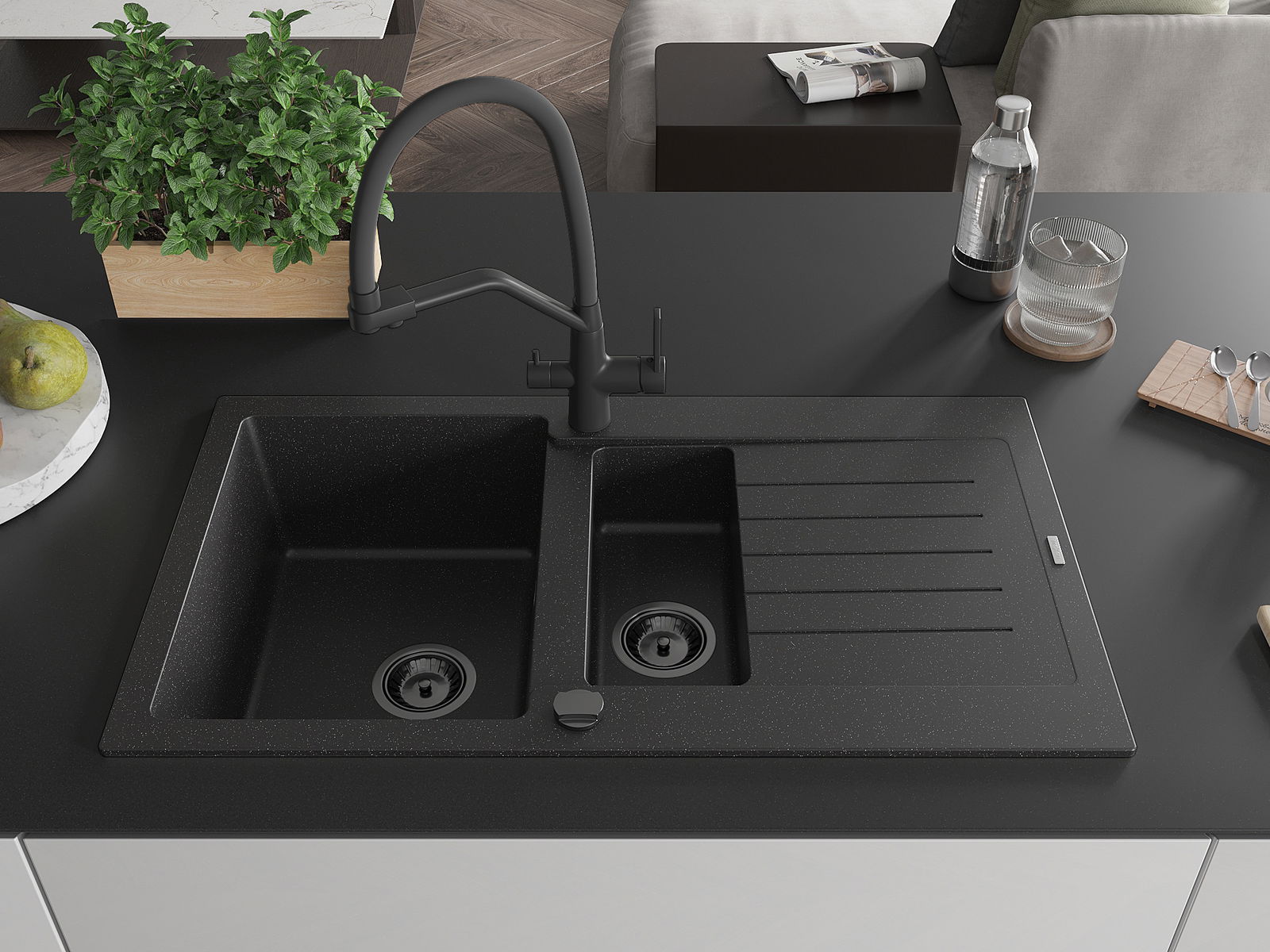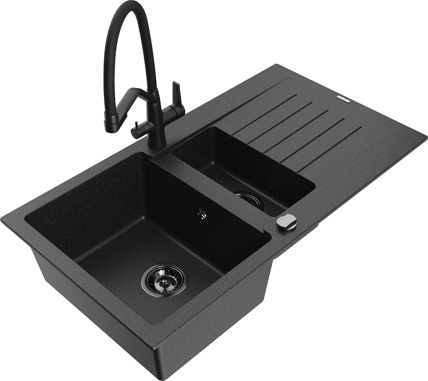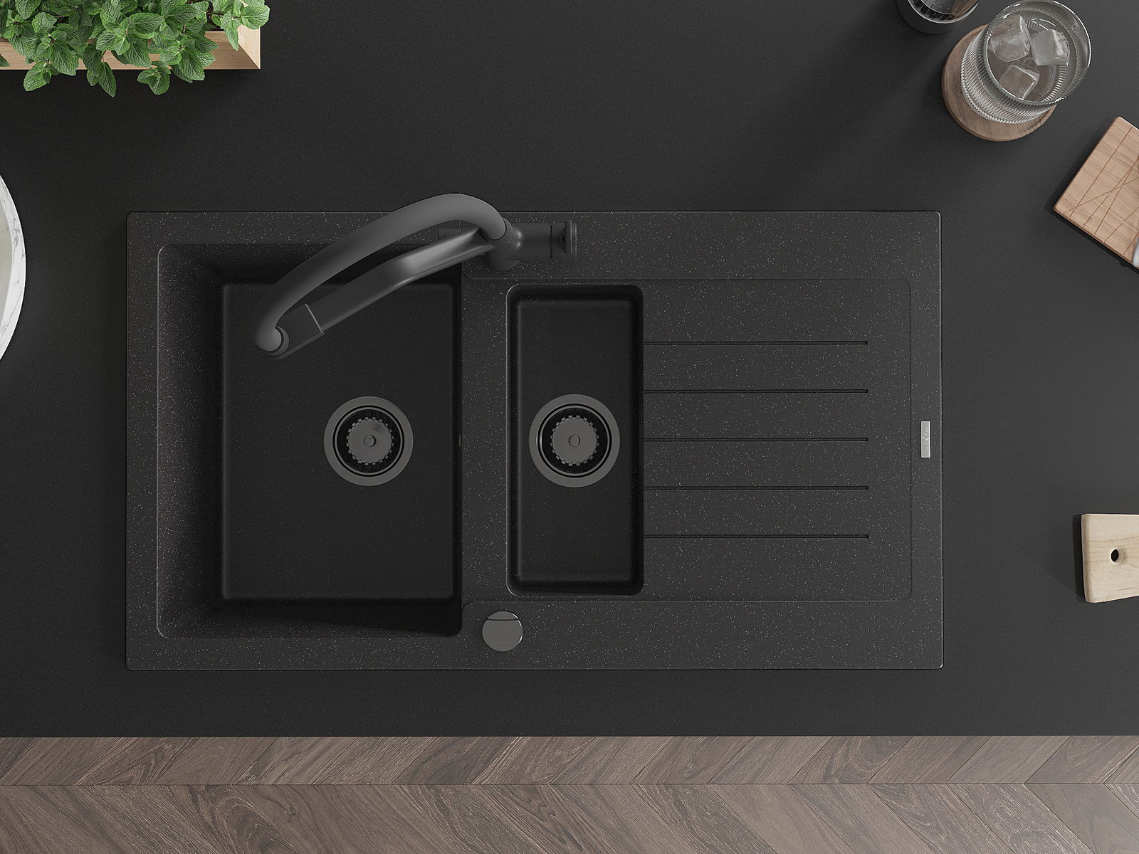 Mexen Matias évier en granit 1,5 bac avec égouttoir et mitigeur cuisine Duo, noir/argent - 6502-73-671701-70-B