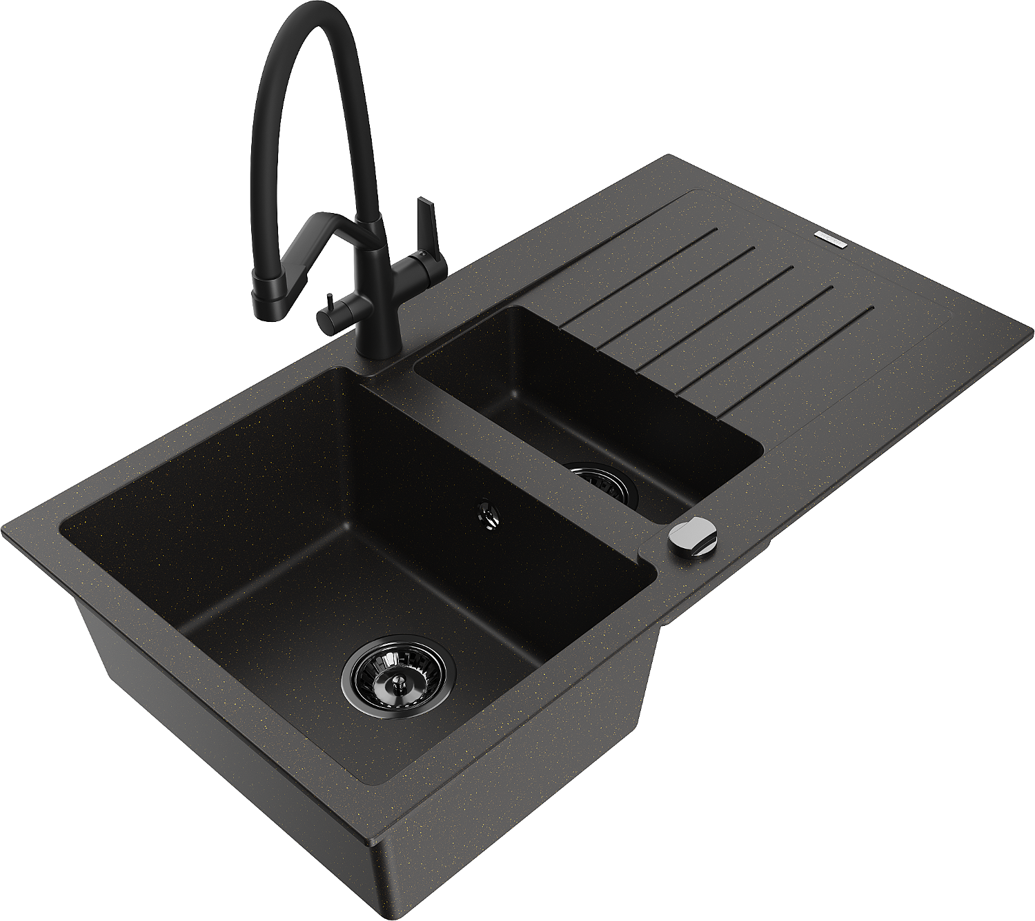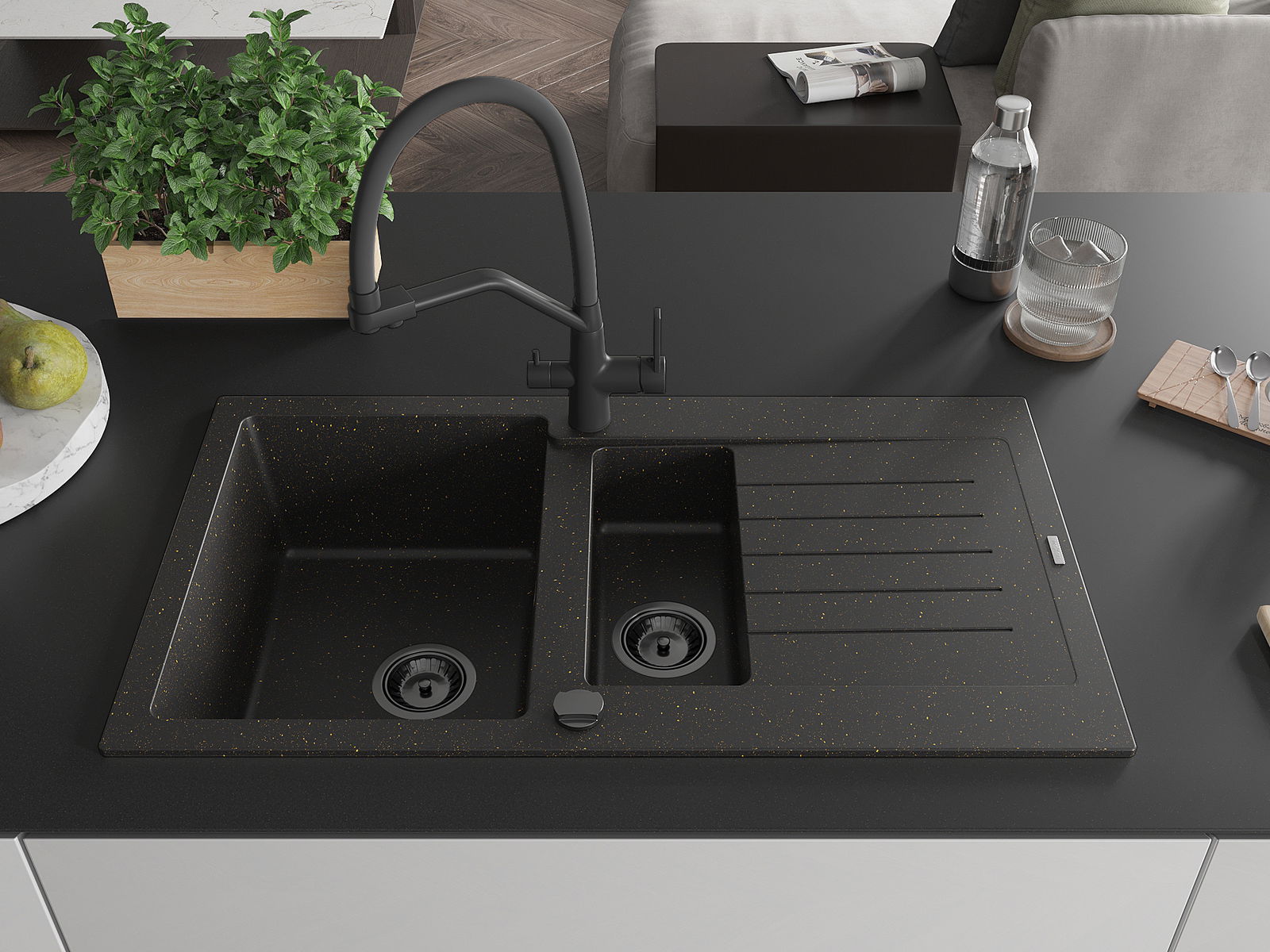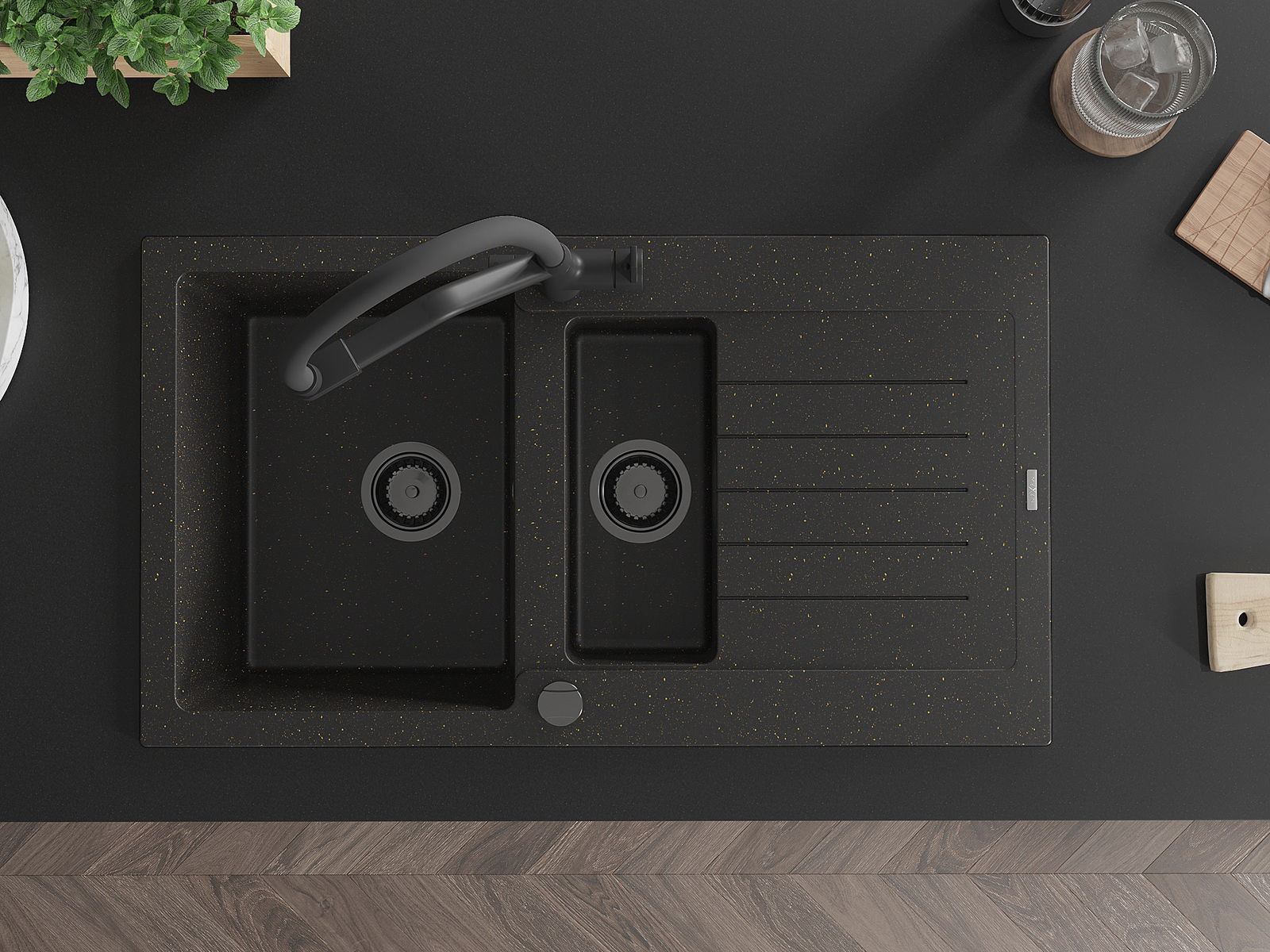Mexen Matias évier en granit 1,5 bac avec égouttoir et robinet de cuisine Duo, noir/métal doré - 6502-75-671701-70-B