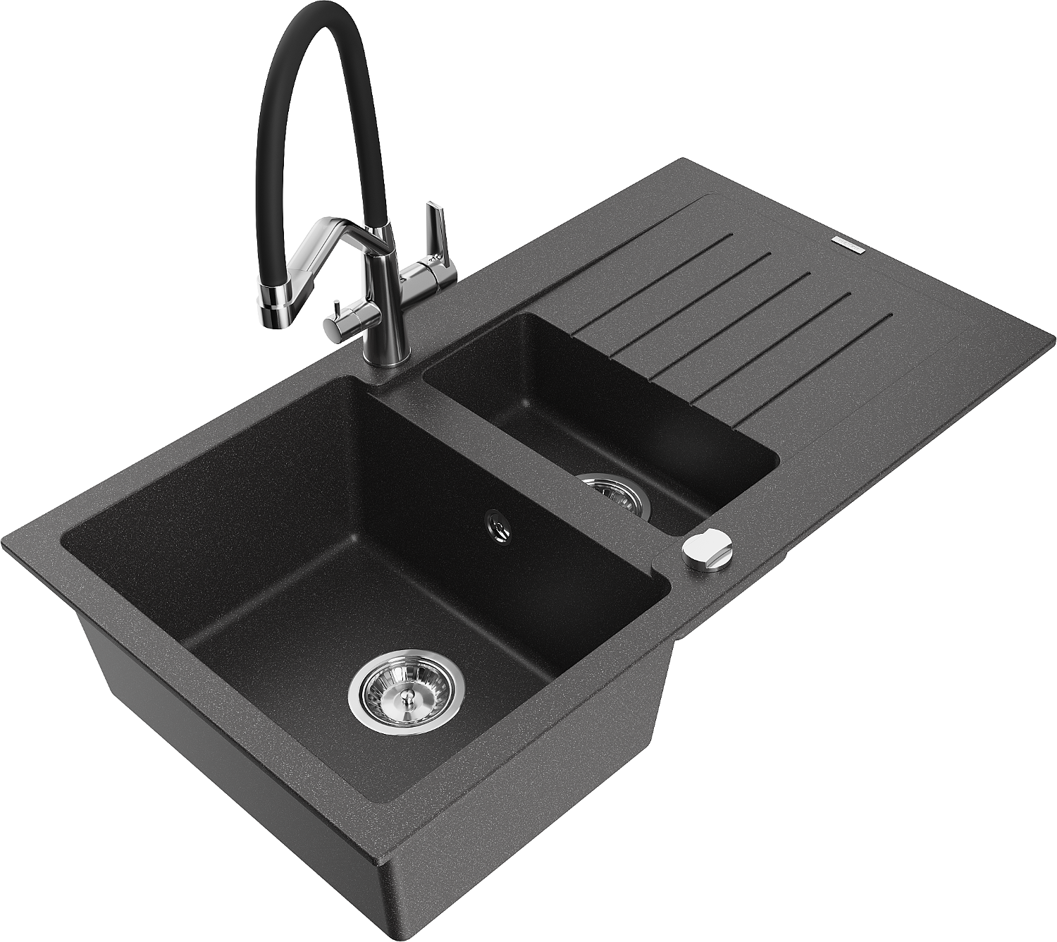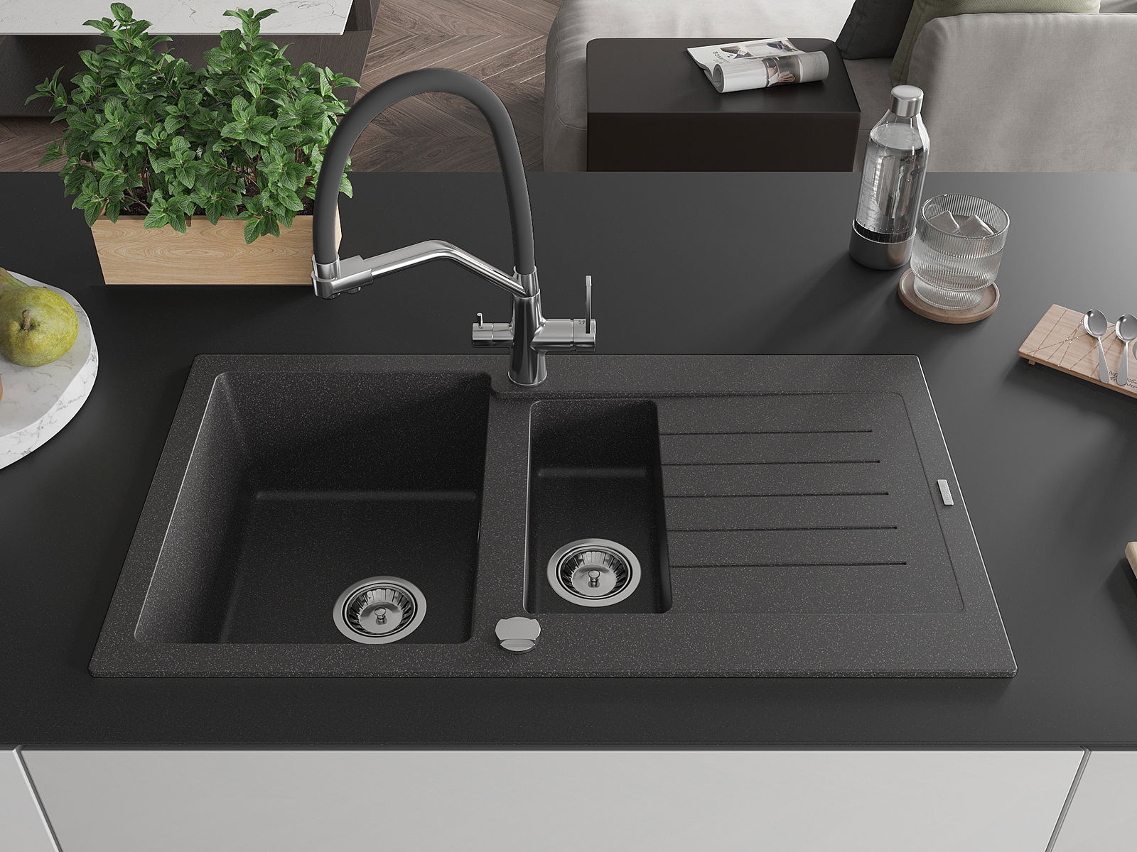 Mexen Matias évier en granit 1,5 bac avec égouttoir et mitigeur de cuisine Duo, noir moucheté - 6502-76-671701-07