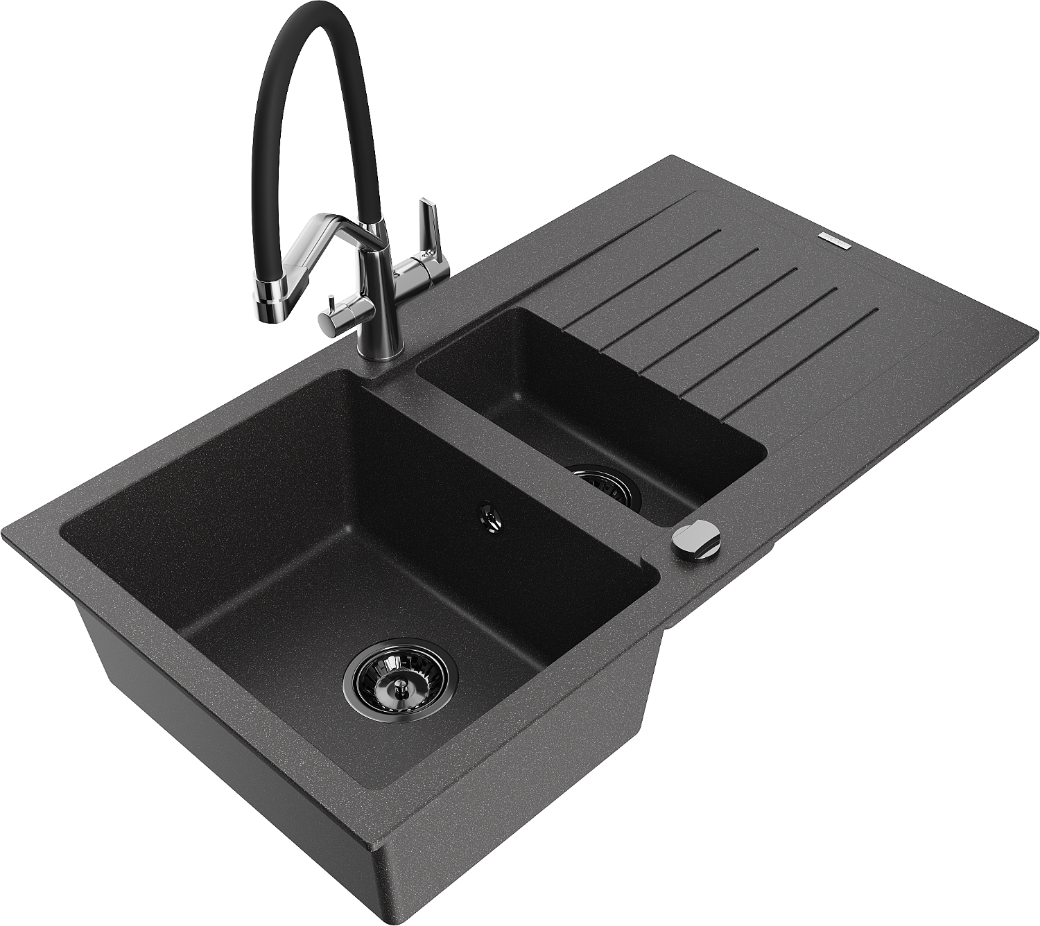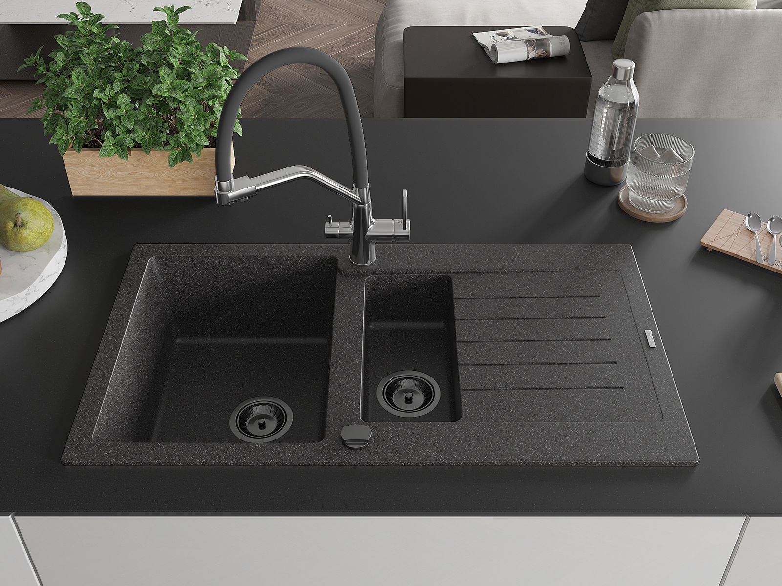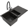 Mexen Matias évier en granit 1,5 bac avec égouttoir et robinet de cuisine Duo, noir moucheté - 6502-76-671701-07-B