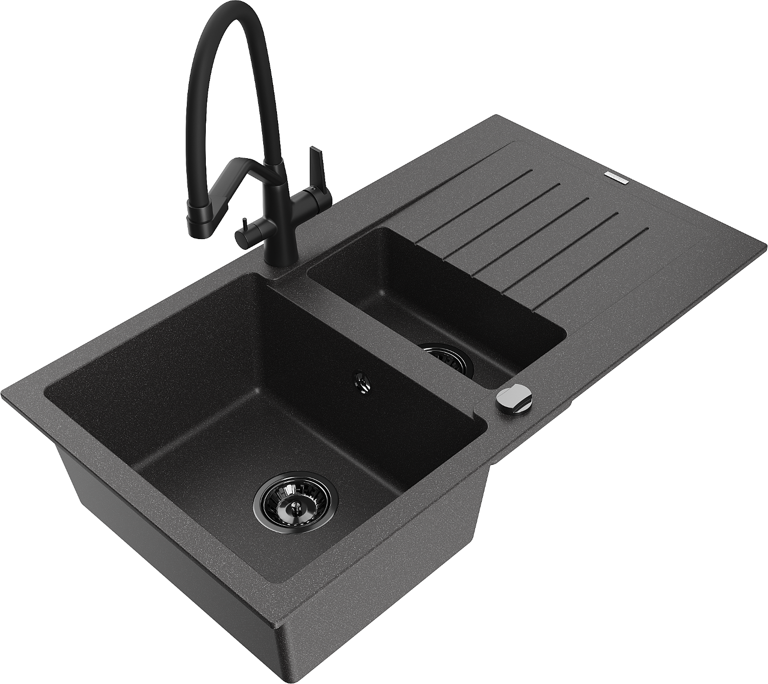 Mexen Matias évier en granit 1,5 bac avec égouttoir et mitigeur de cuisine Duo, noir moucheté - 6502-76-671701-70-B