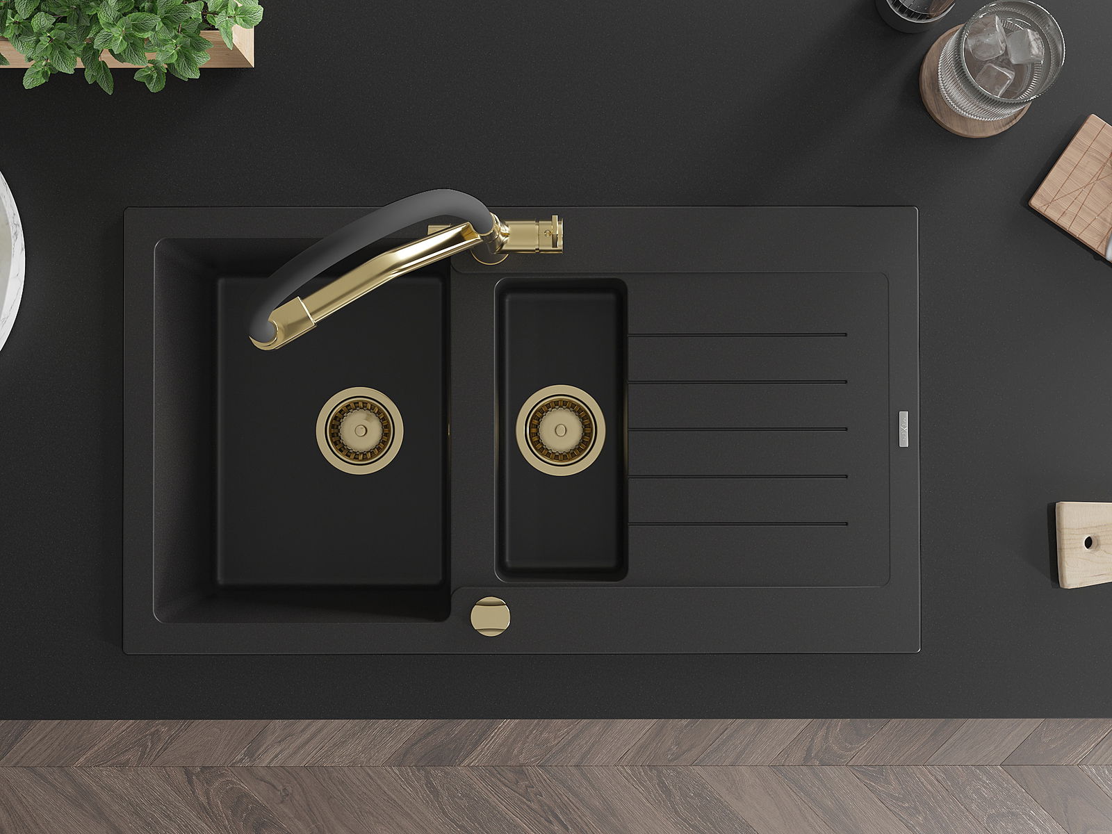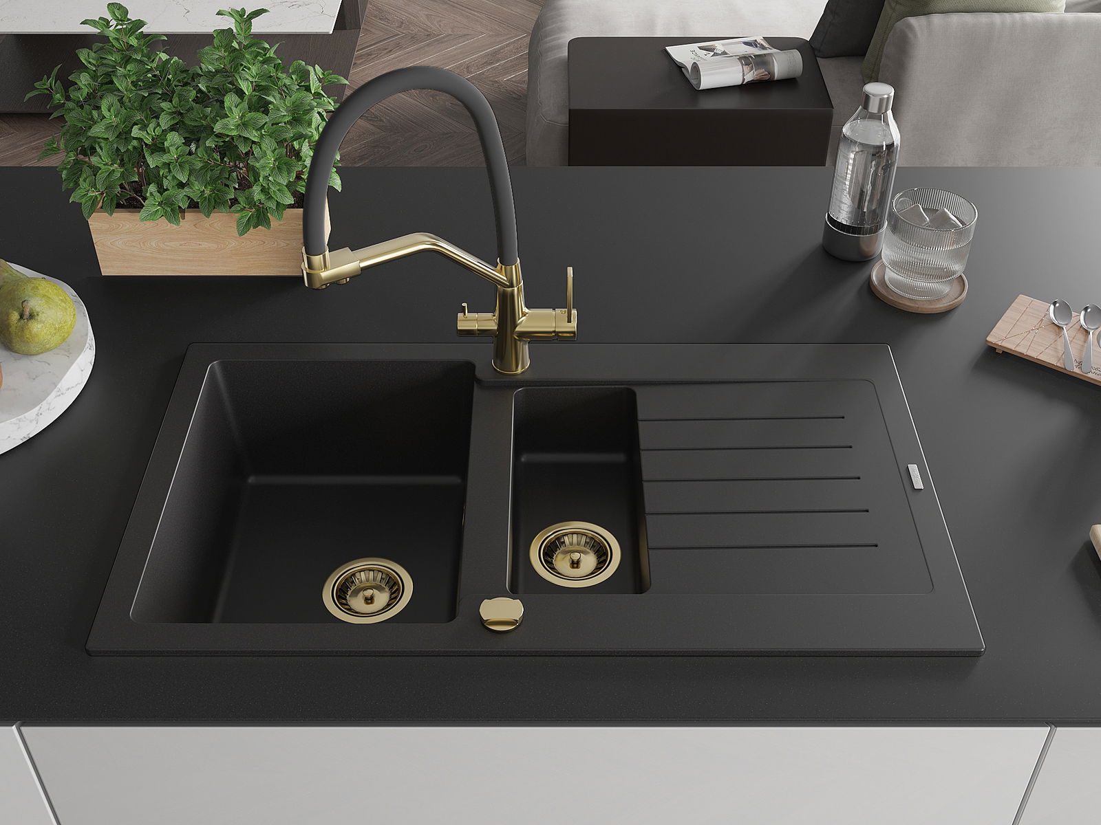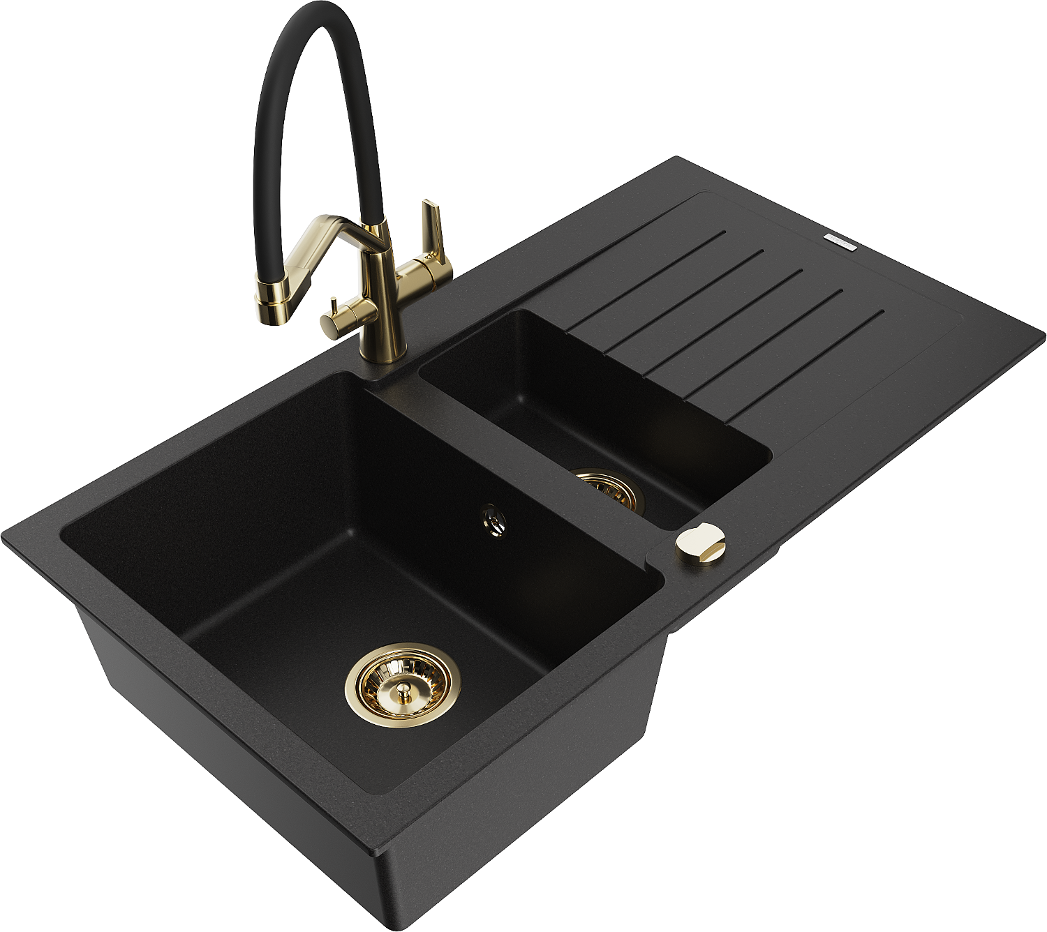 Mexen Matias évier en granit 1,5 bac avec égouttoir et robinet de cuisine Duo, noir - 6502-77-671701-57-G