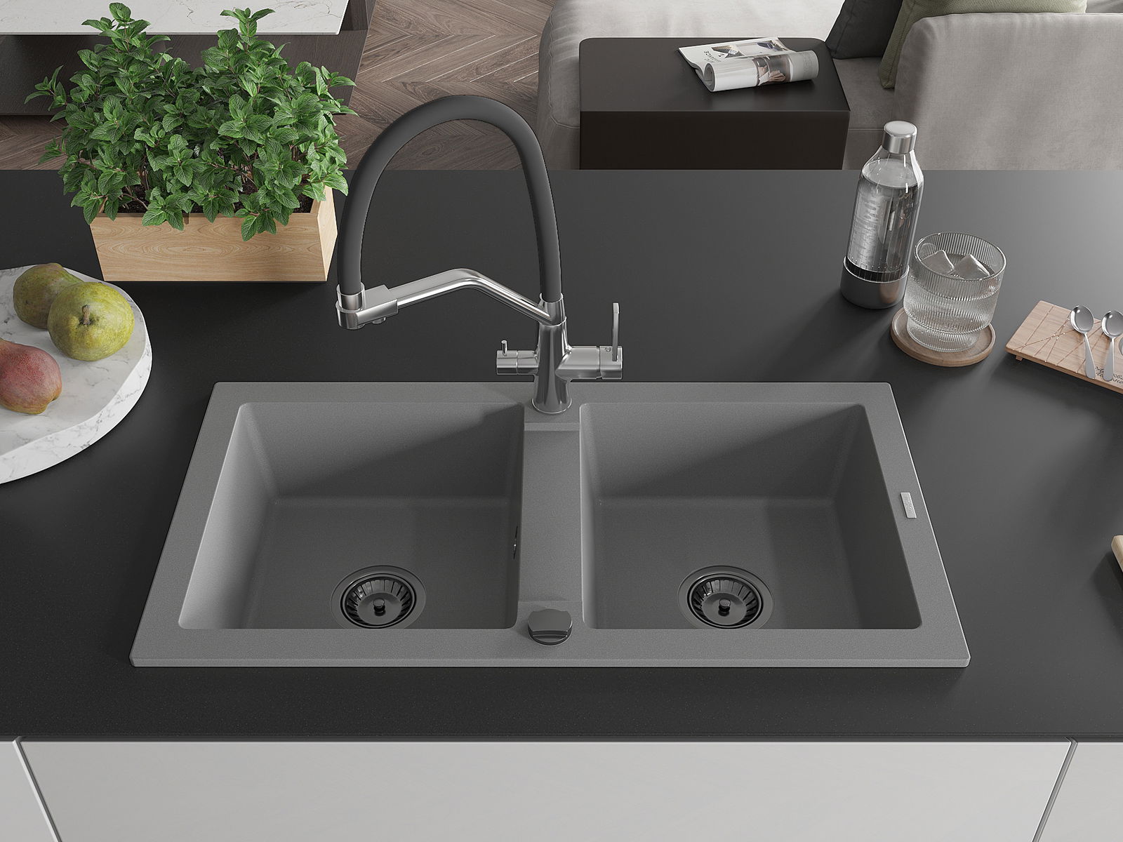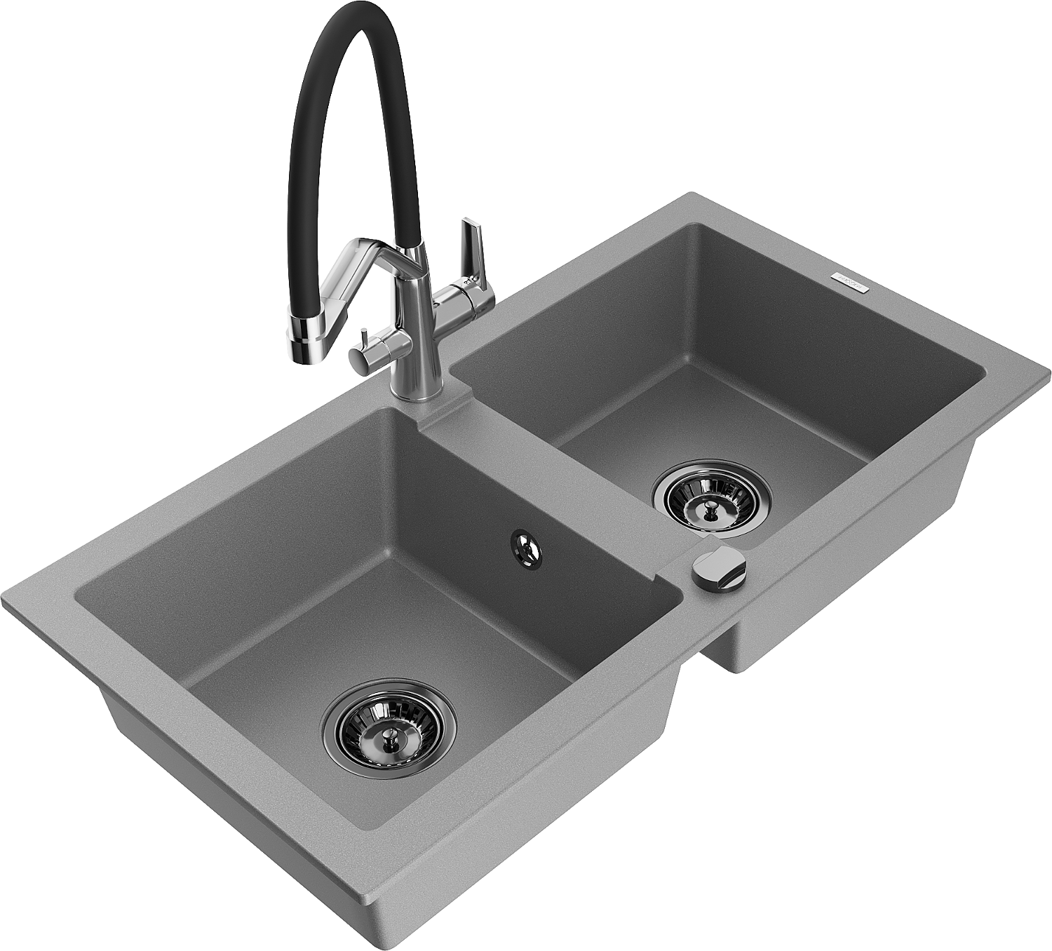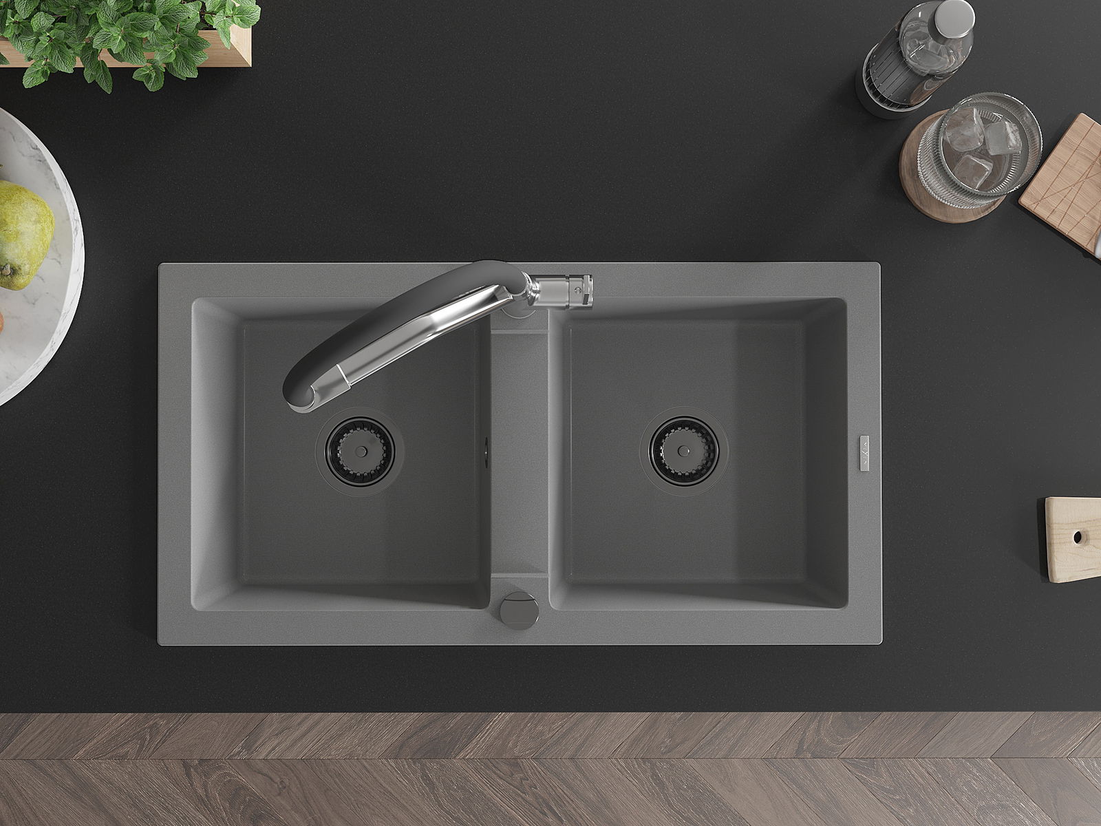 Mexen Mario évier en granit à 2 bacs avec robinet de cuisine Duo, gris - 6504-71-671701-07-B