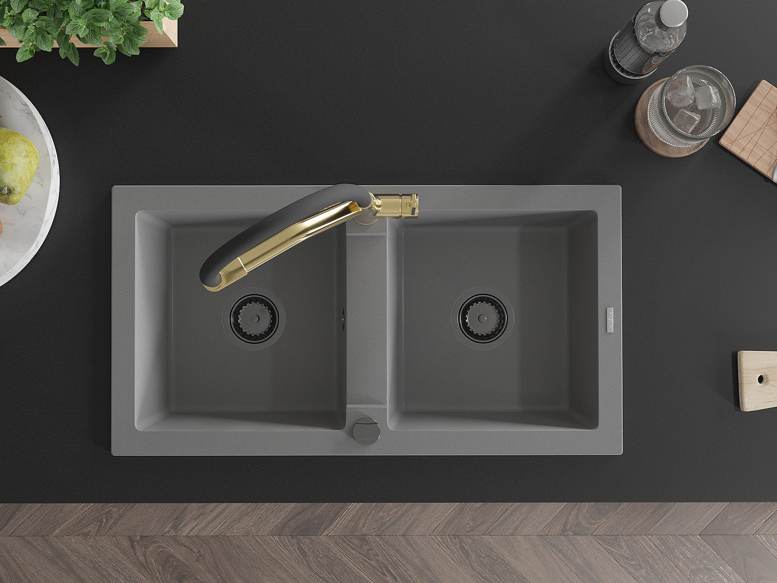 Mexen Mario évier en granit 2 bacs avec robinet de cuisine Duo, gris - 6504-71-671701-57-B