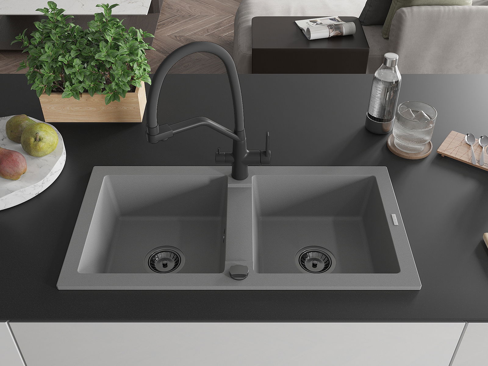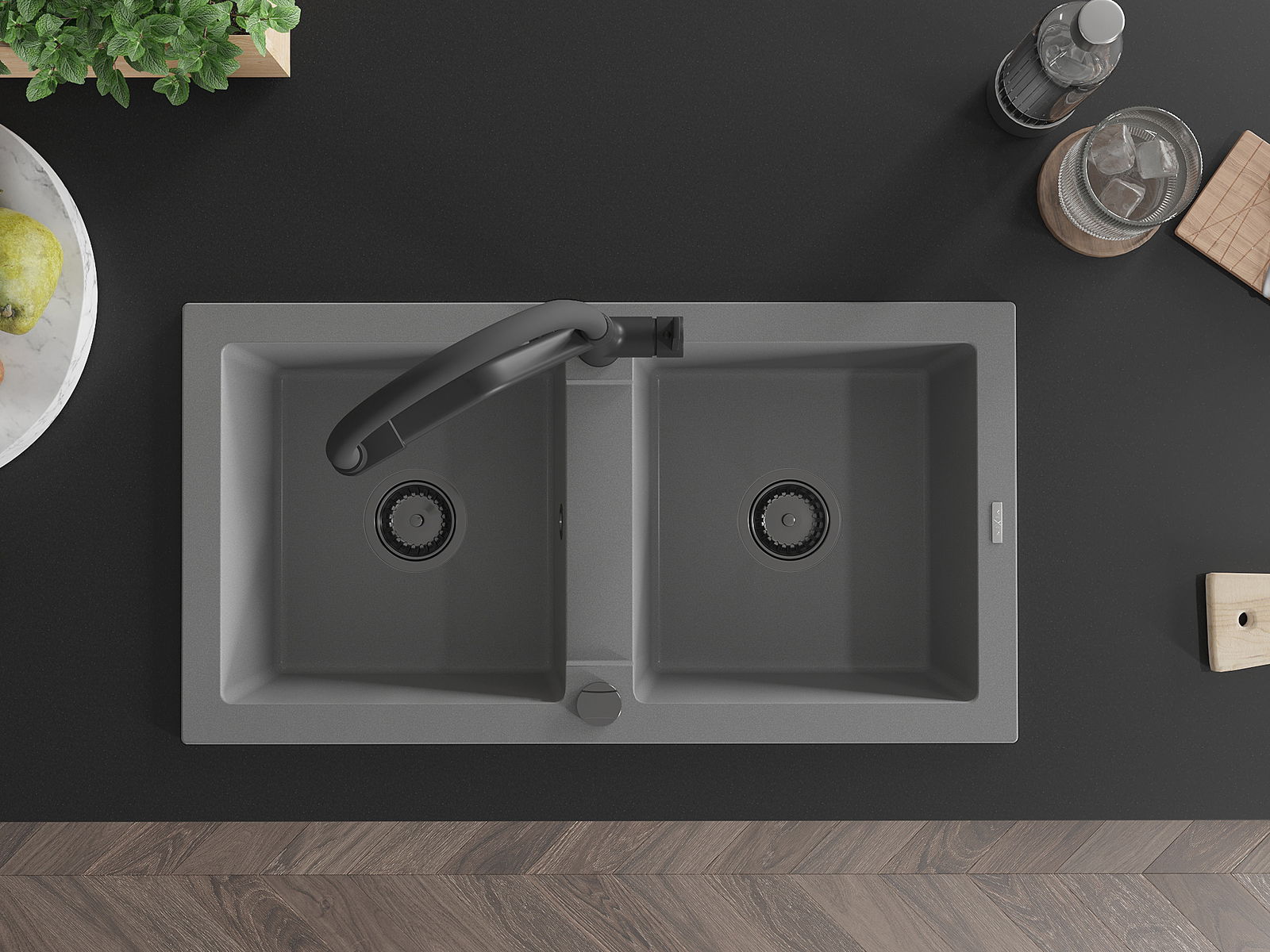 Mexen Mario évier en granit 2-bassins avec robinet de cuisine Duo, gris - 6504-71-671701-70-B