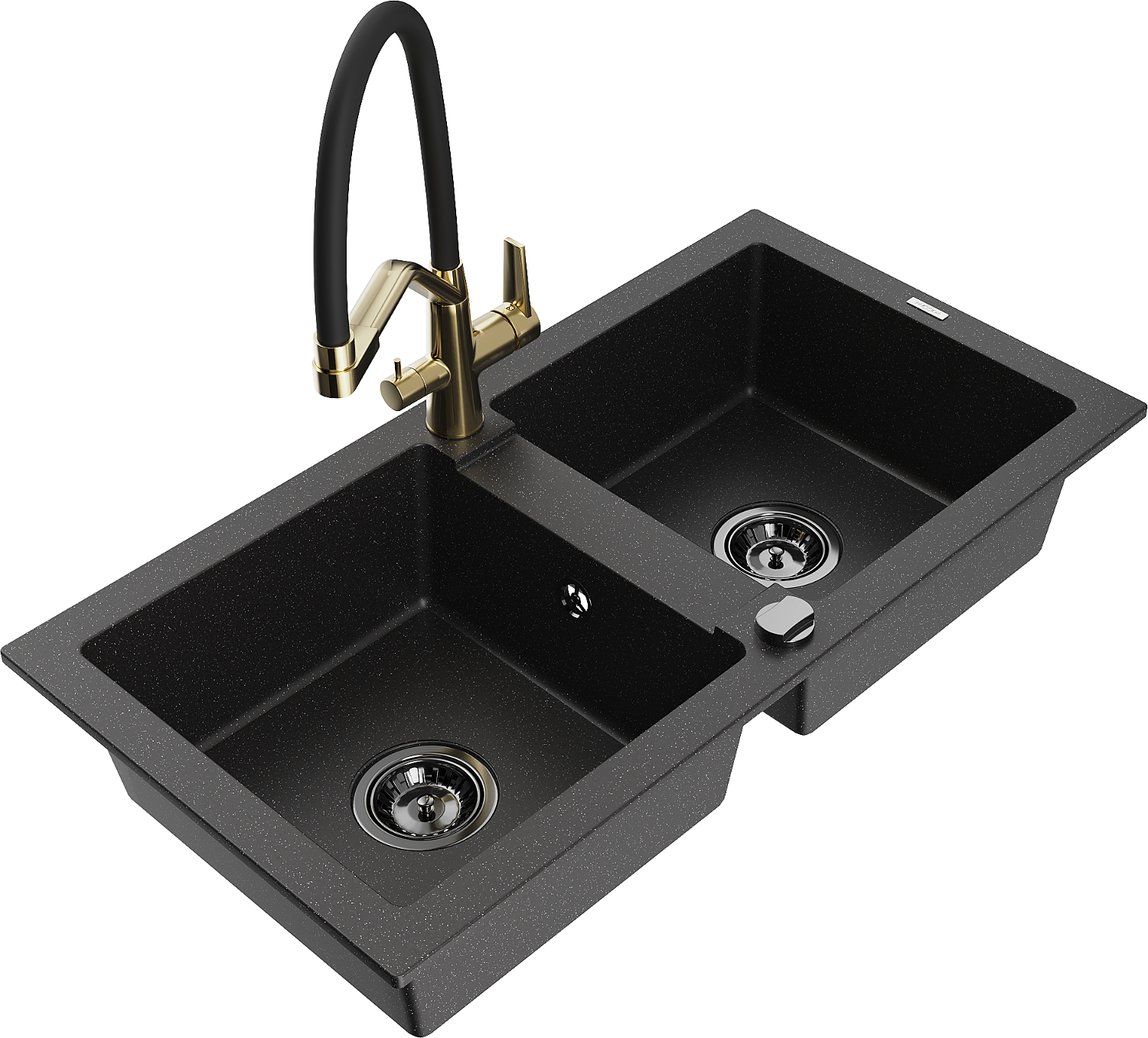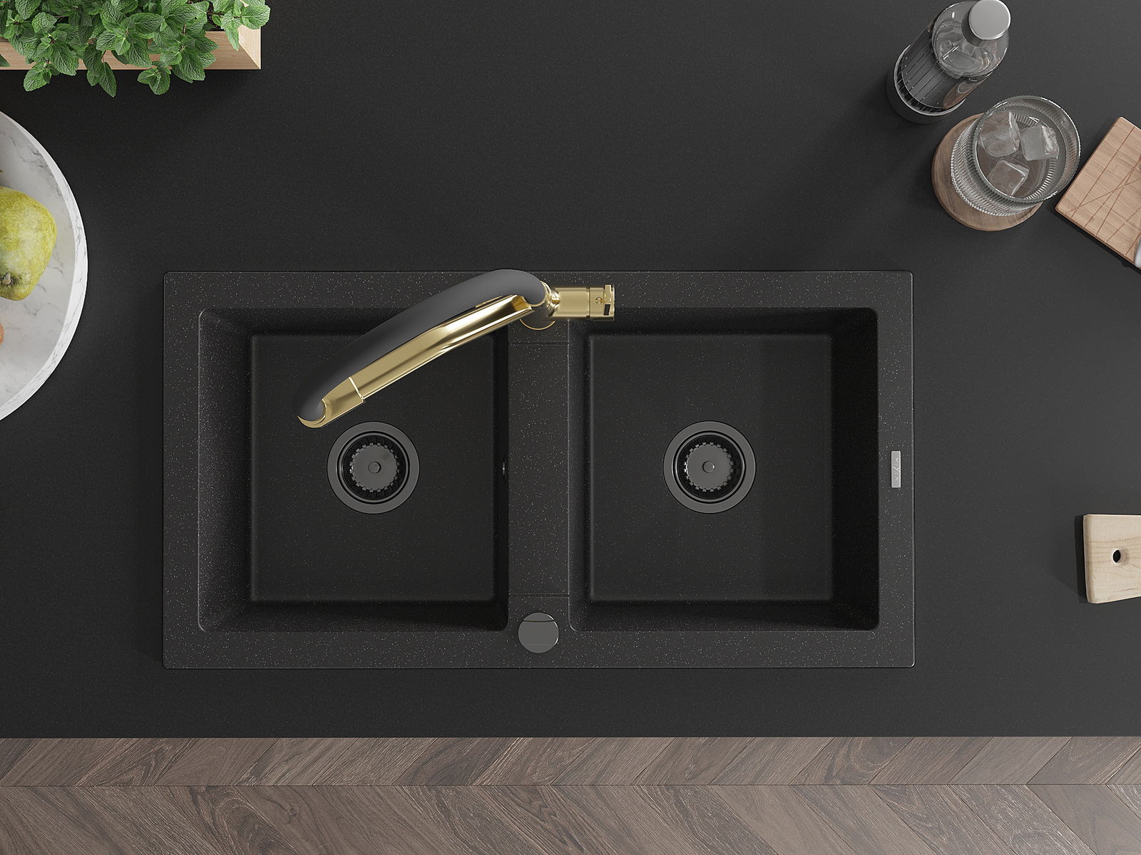 Mexen Mario évier de cuisine en granit à 2 bacs avec robinet de cuisine Duo, noir/métallique argenté - 6504-73-671701-57-B
