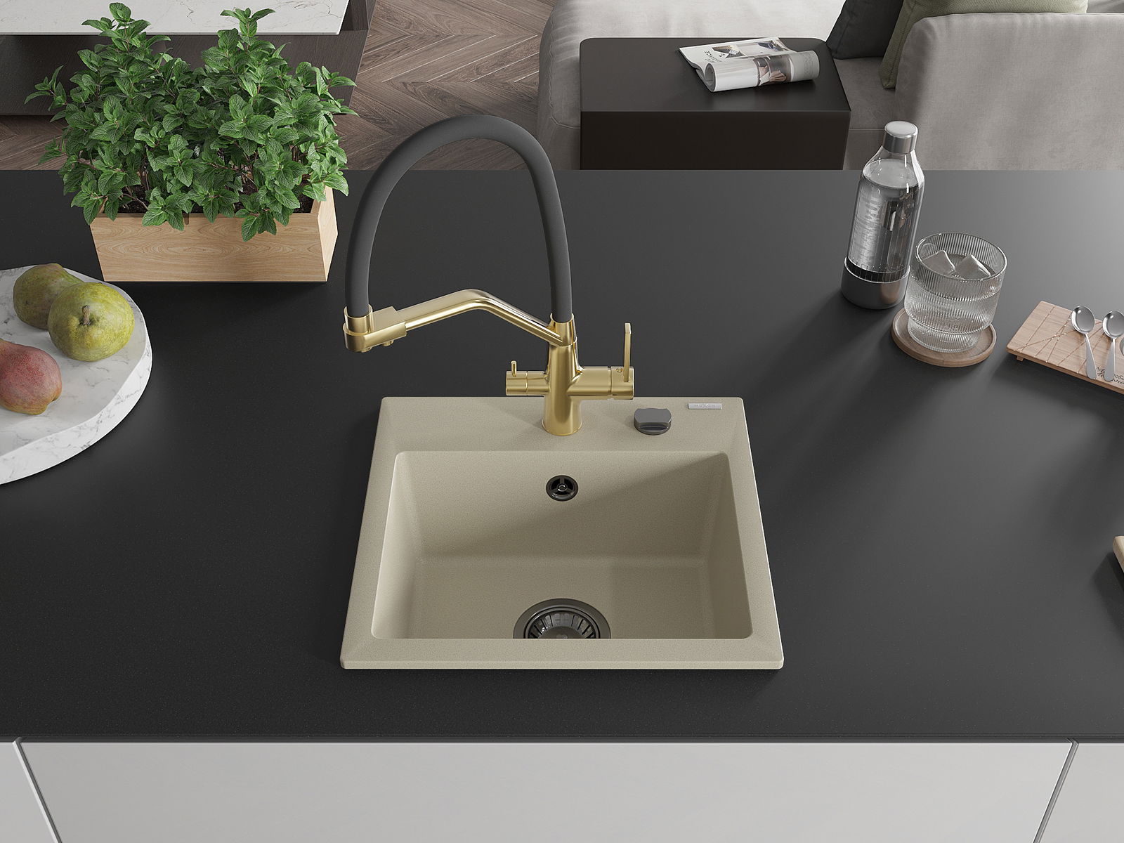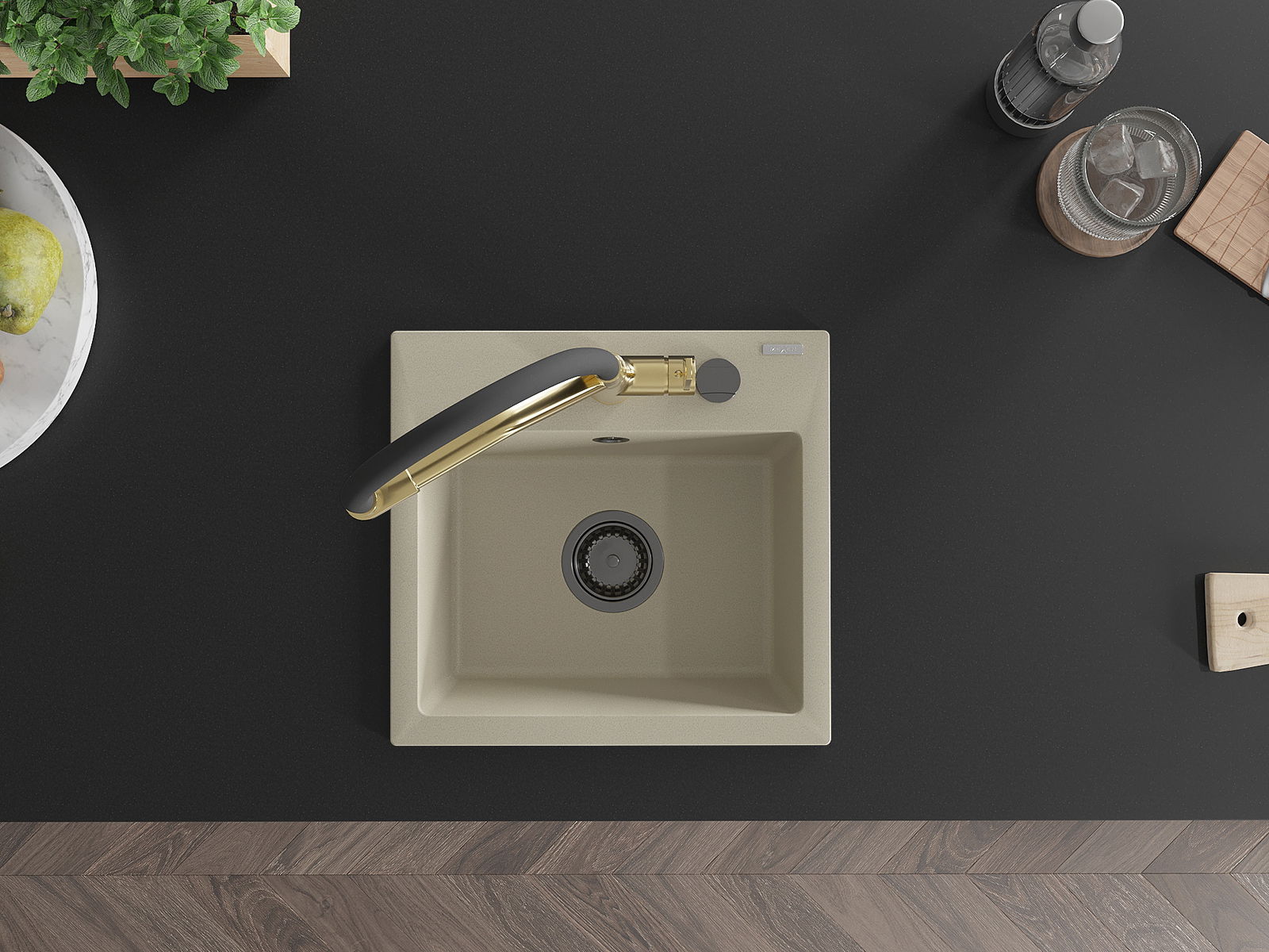 L'évier a un trou sous-meulé de 35 mm de diamètre à percer soi-même. Il peut être utilisé, entre autres, pour installer un distributeur de liquide, ce qui éliminera la présence de bouteilles en plastique dans la cuisine et lui donnera une finition élégante.