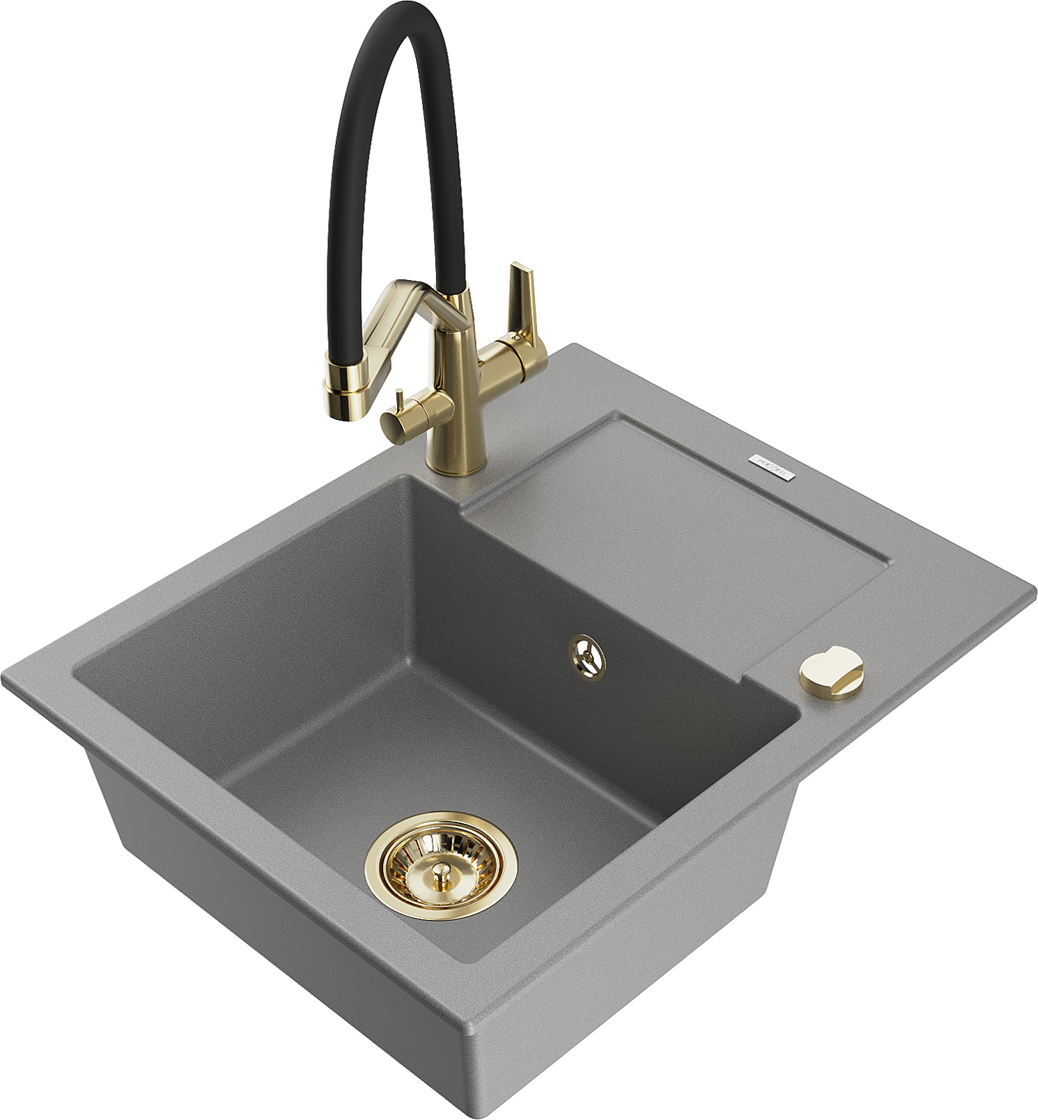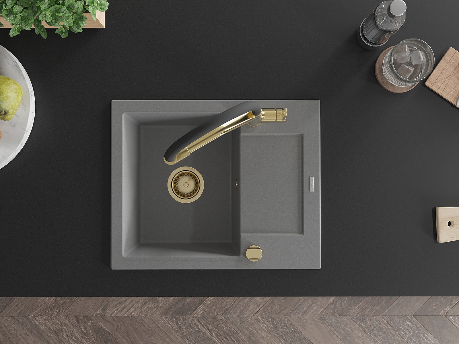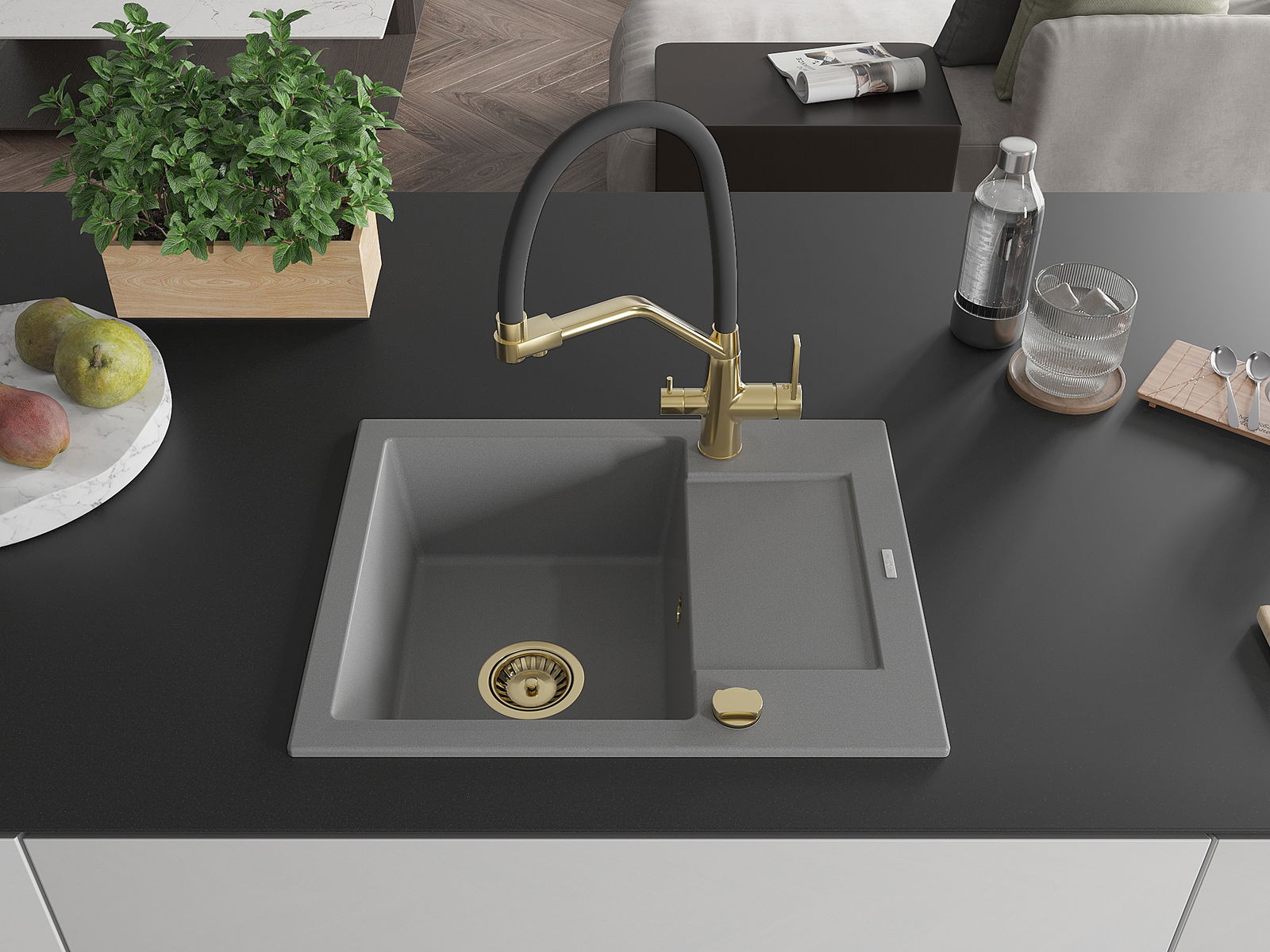 Mexen Enzo évier en granit 1 bassin avec égouttoir et robinet de cuisine Duo, gris - 6506-71-671701-57-G