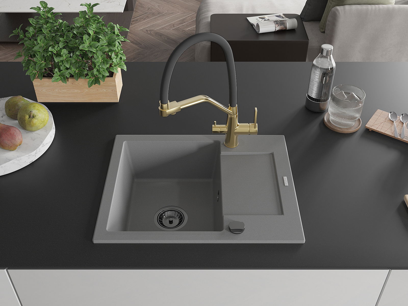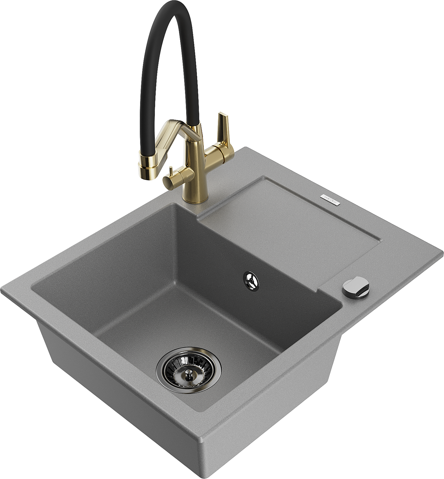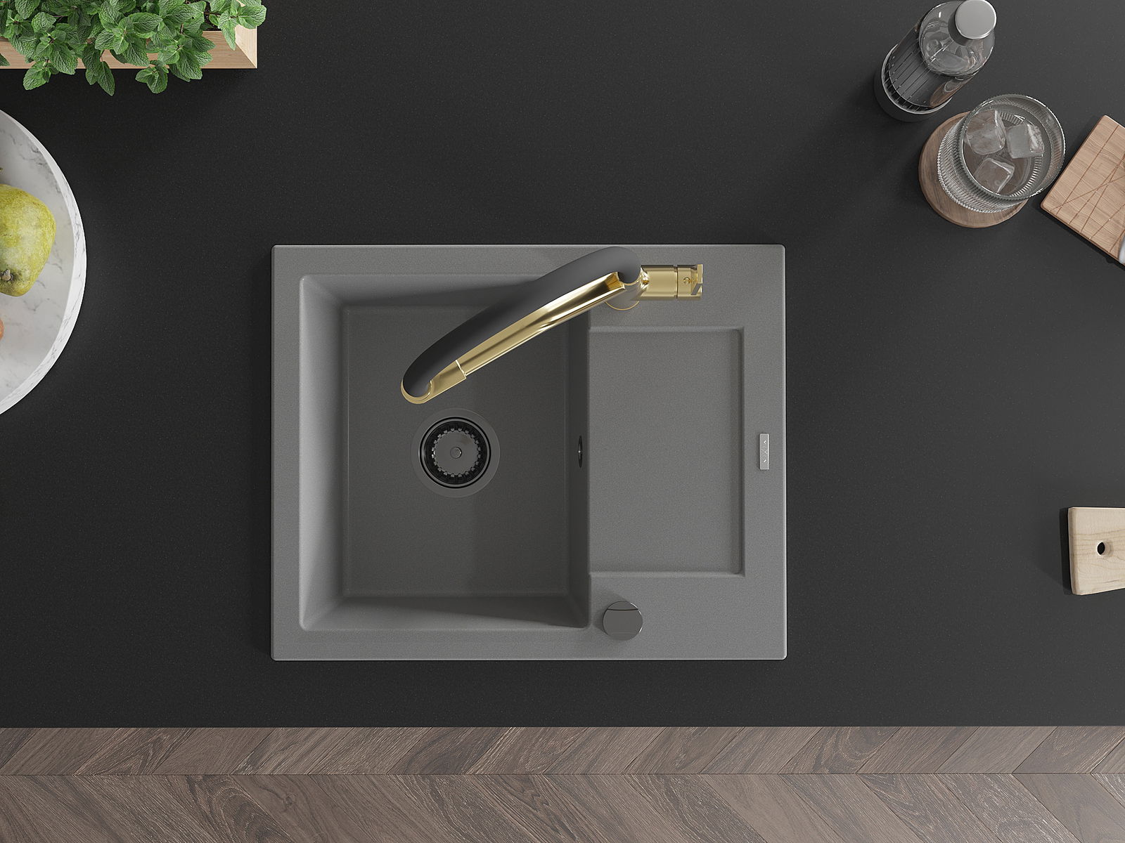 Mexen Enzo évier en granit à 1 bac avec égouttoir et robinet de cuisine Duo, gris - 6506-71-671701-57-B