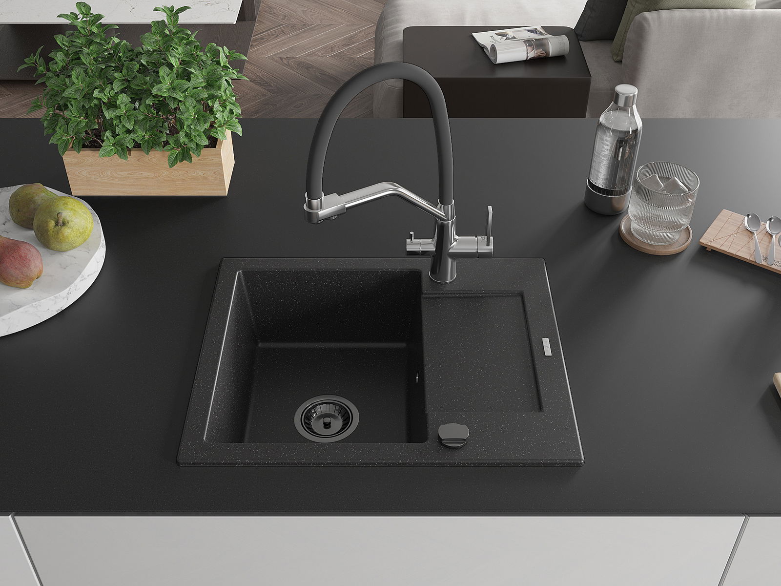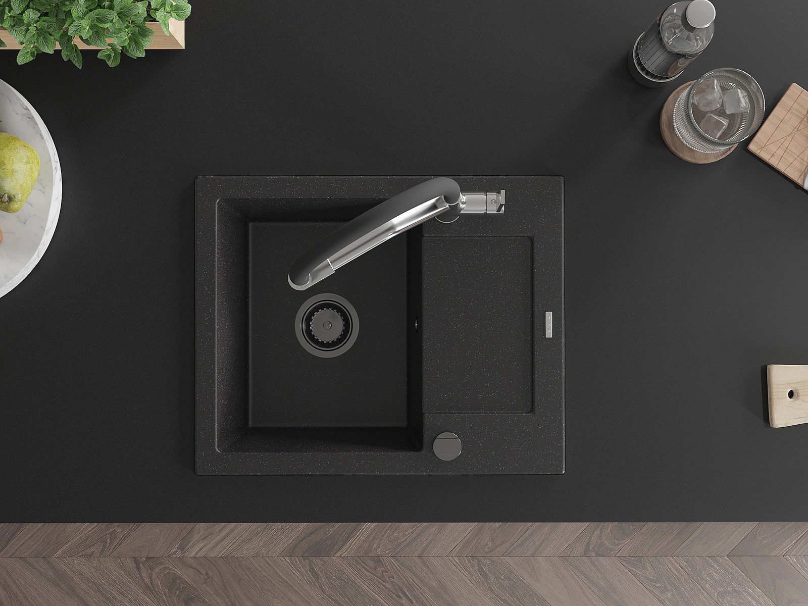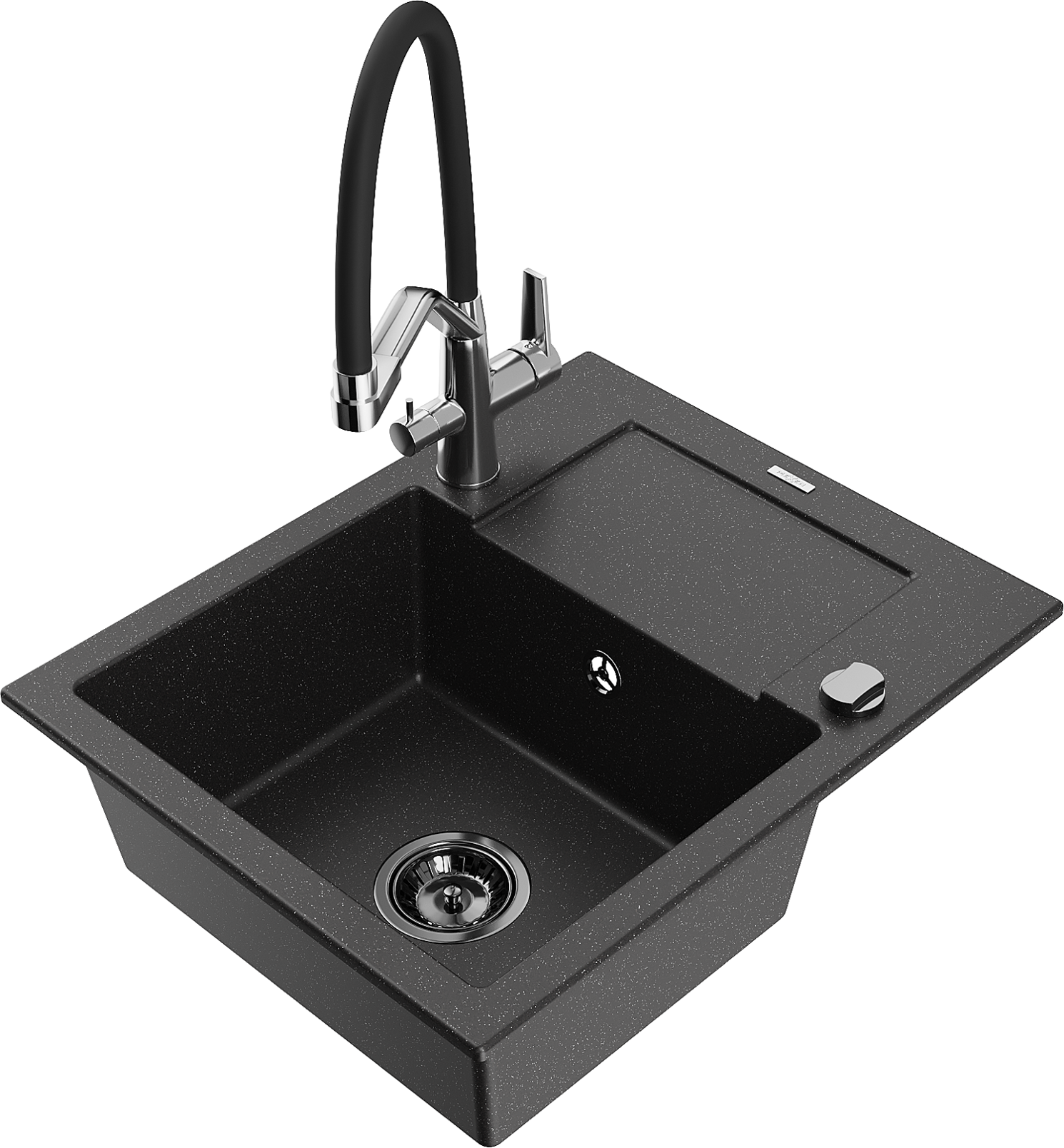 Mexen Enzo évier en granit à 1 bac avec égouttoir et robinet de cuisine Duo, noir / métallique argenté