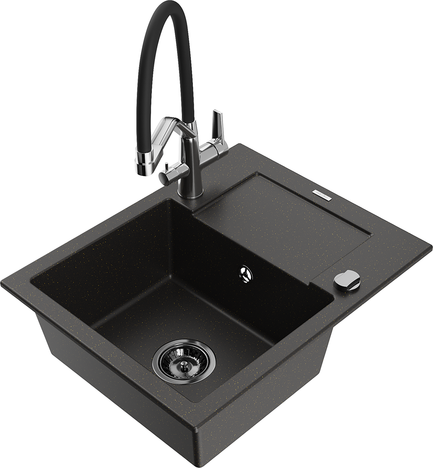 Mexen Enzo évier en granit 1 bac avec égouttoir et robinet de cuisine Duo, noir/or métallique - 6506-75-671701-07-B