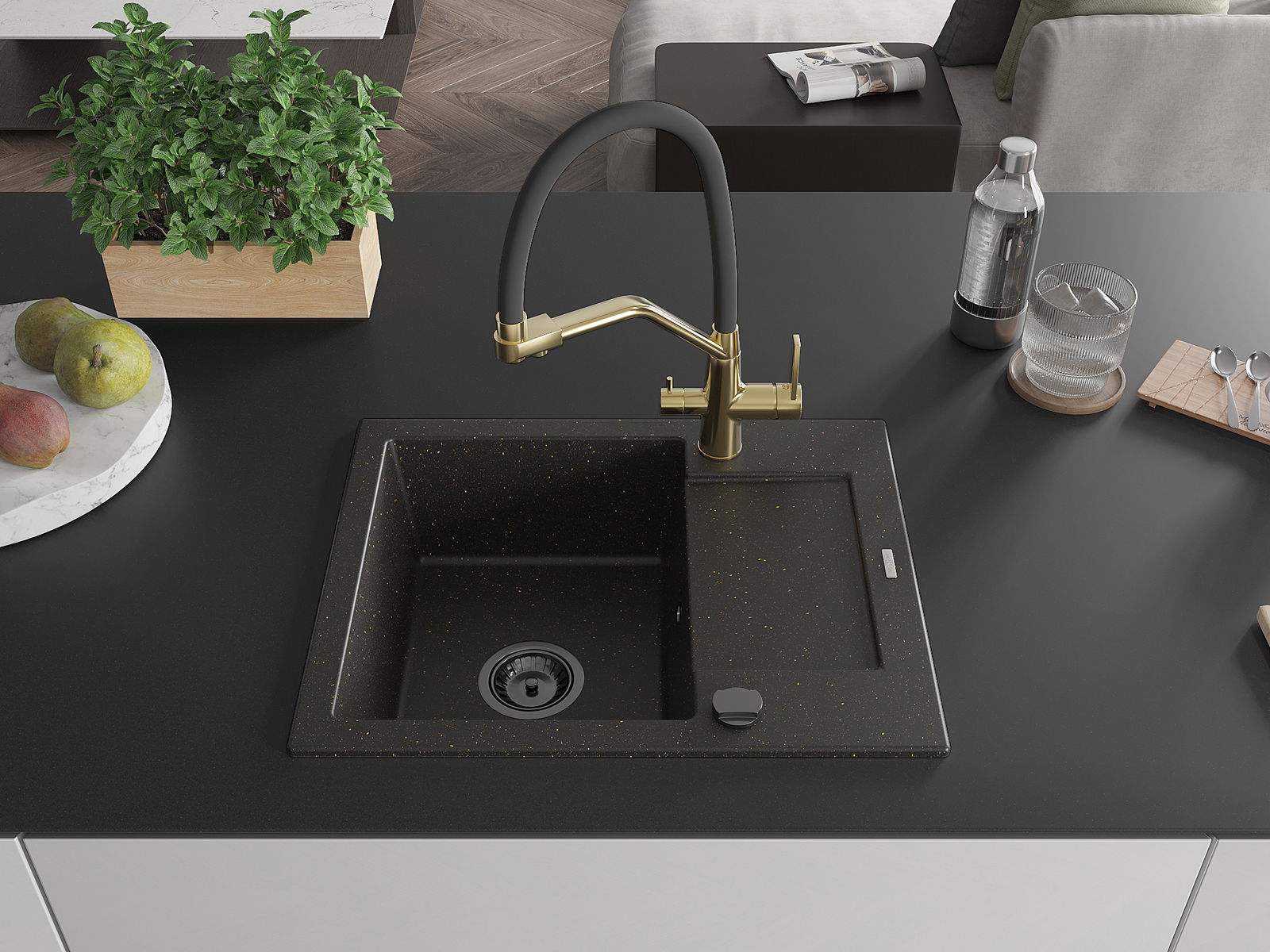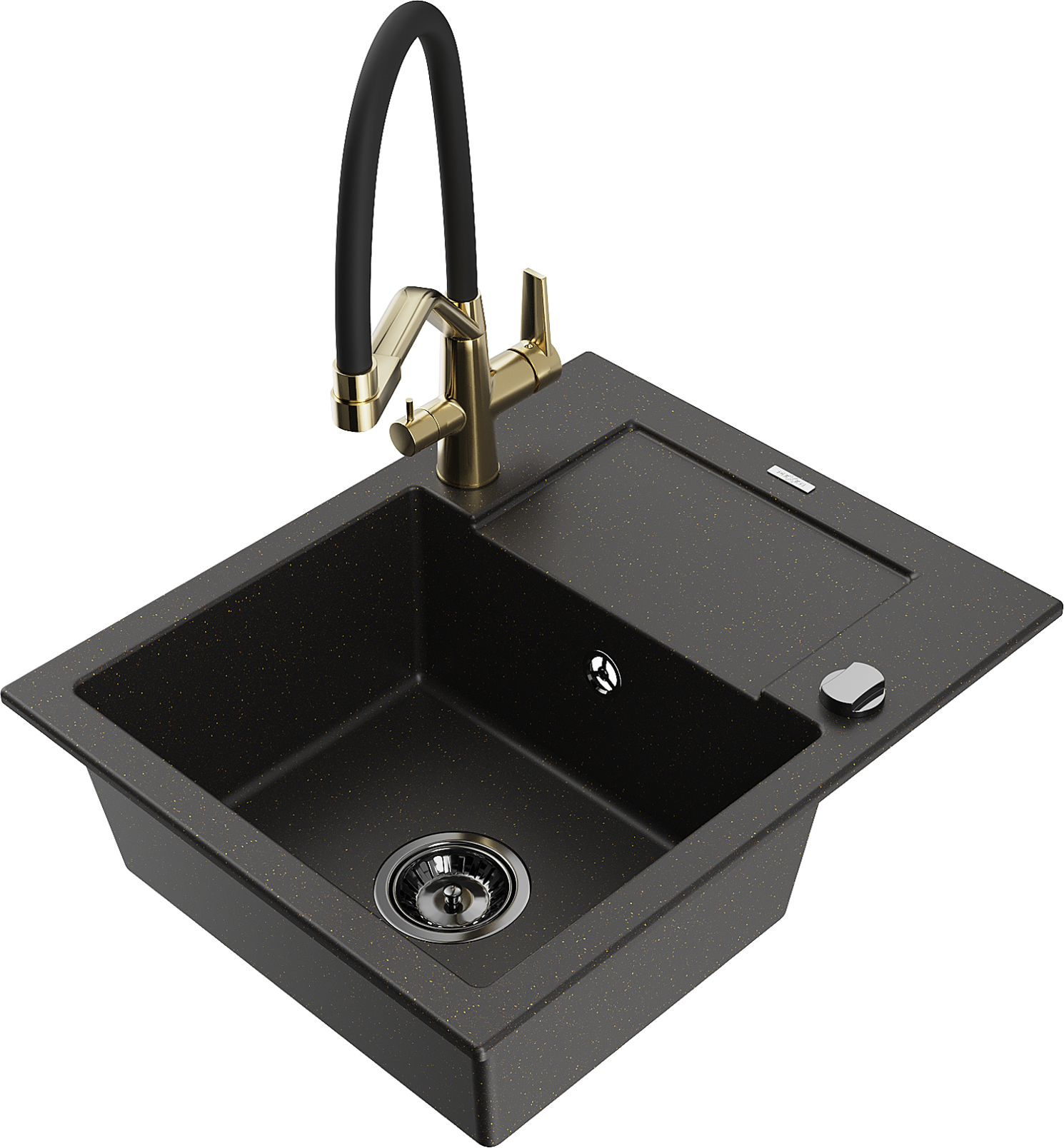 Mexen Enzo évier en granit 1 bac avec égouttoir et robinet de cuisine Duo, noir/métallique doré - 6506-75-671701-57-B