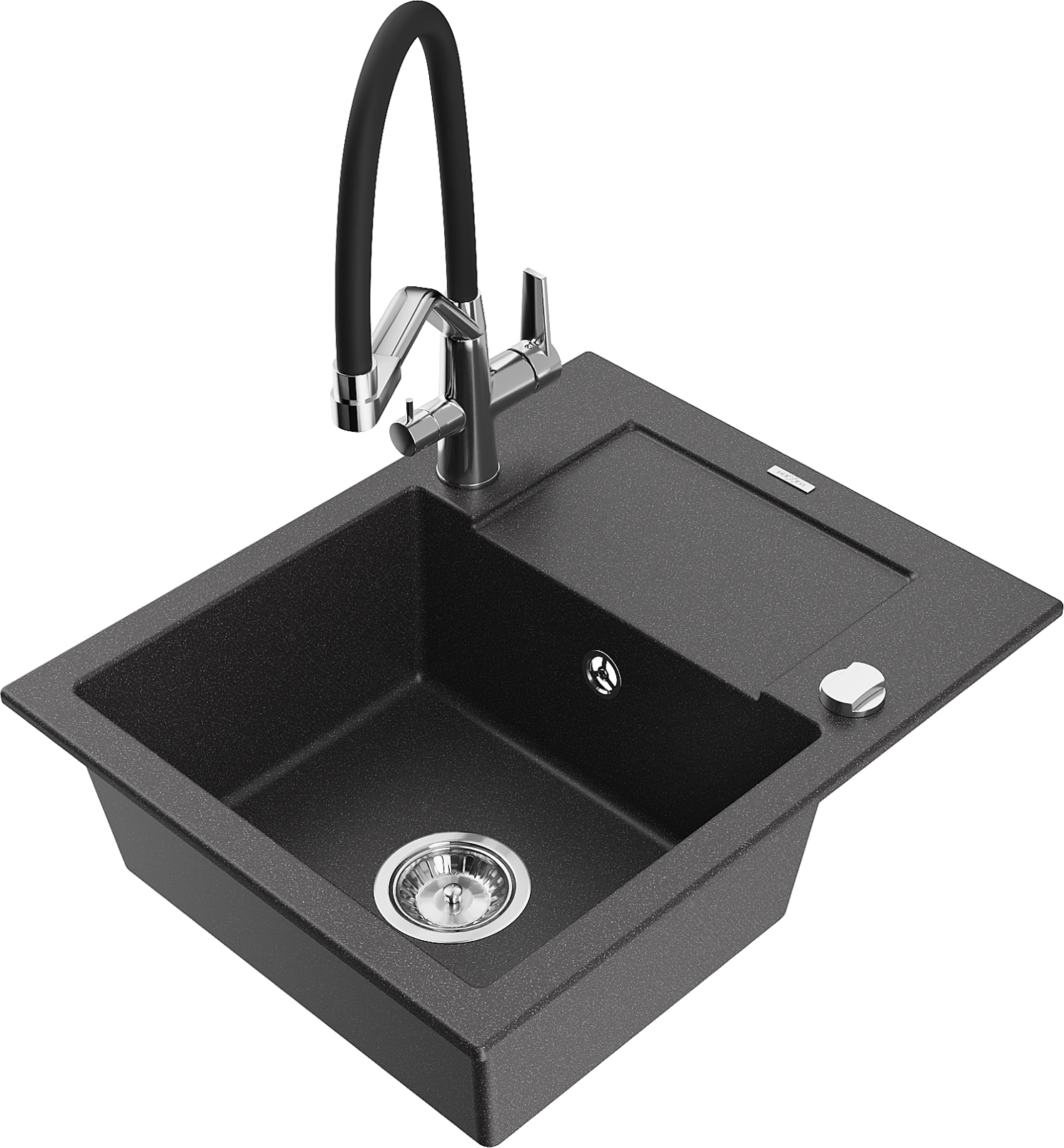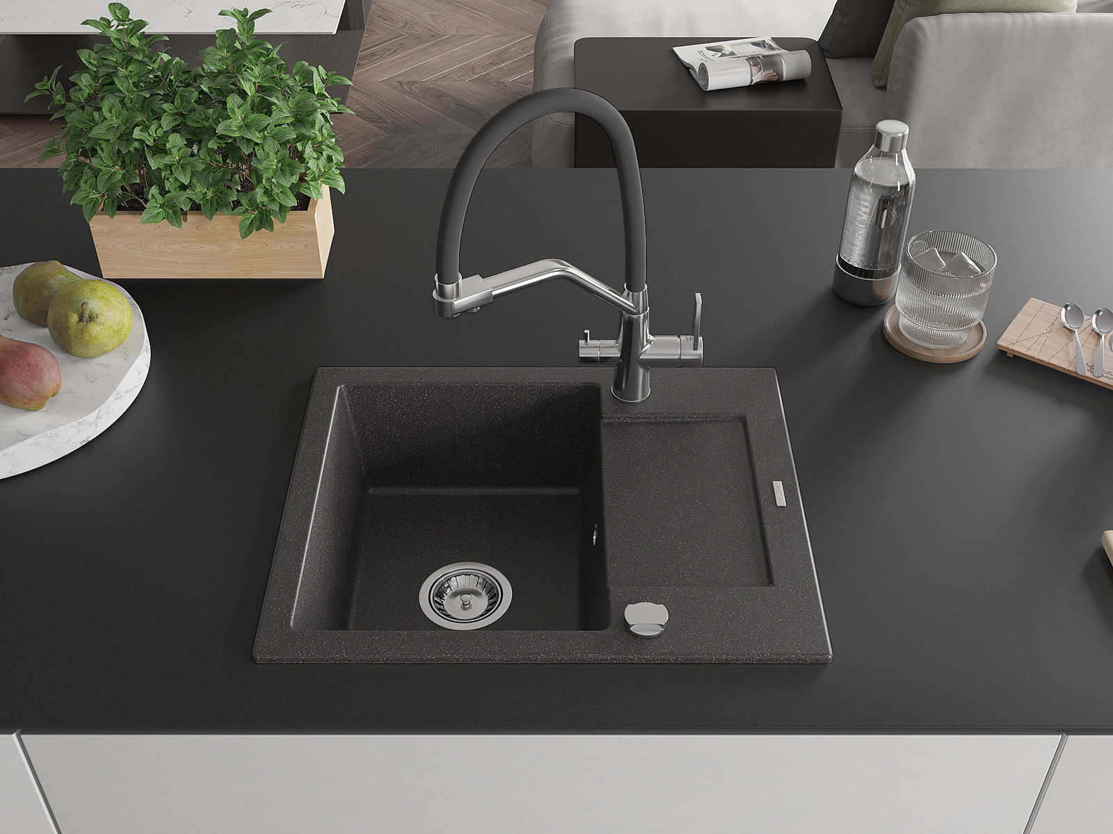 Mexen Enzo évier en granit 1 bac avec égouttoir et robinet de cuisine Duo, noir moucheté - 6506-76-671701-07