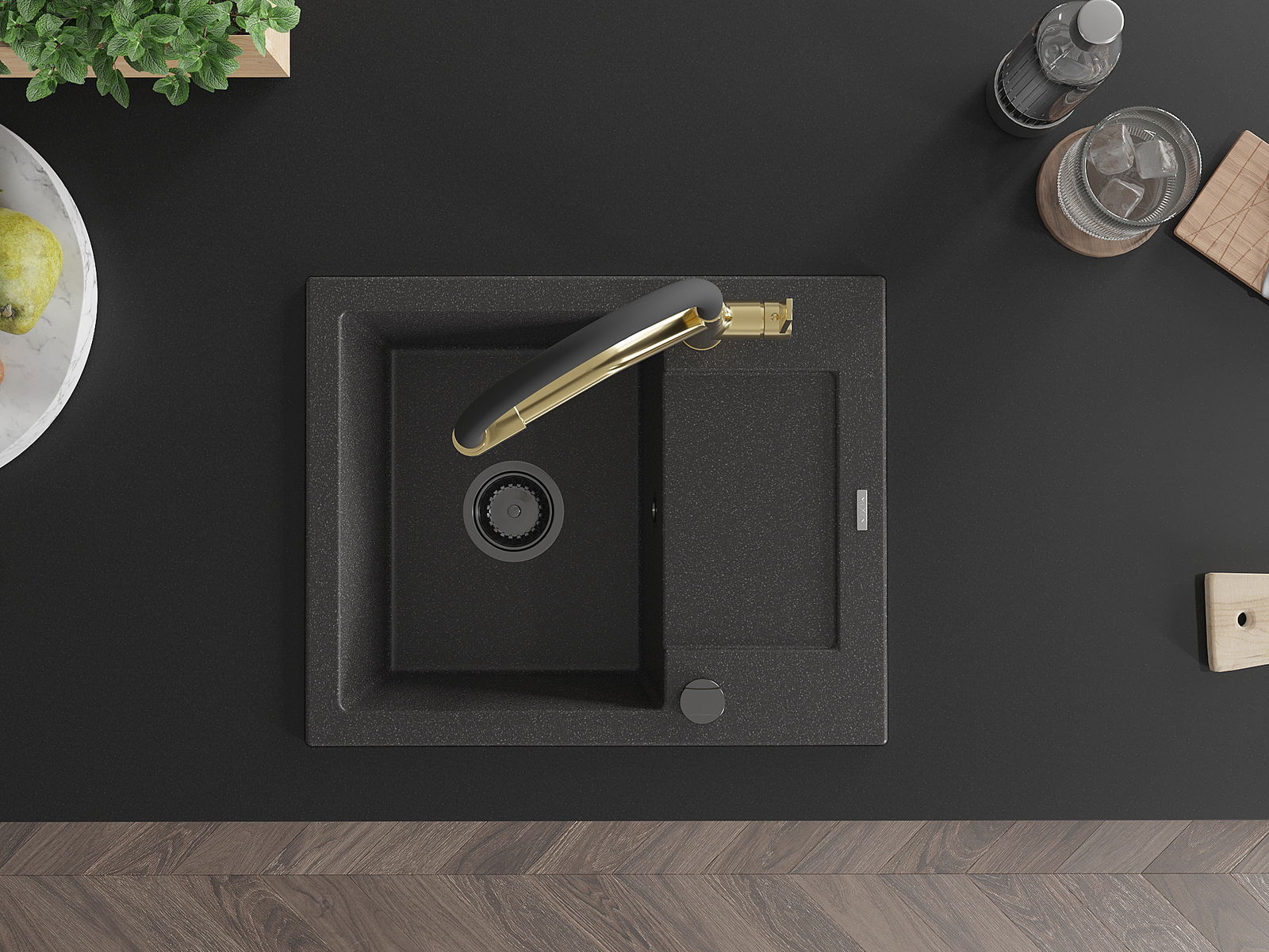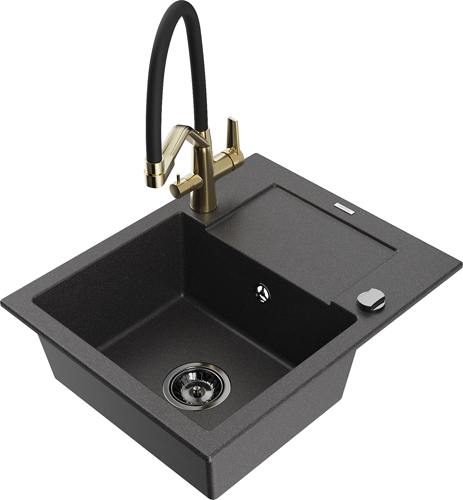 Mexen Enzo évier en granit à 1 bac avec égouttoir et robinet de cuisine Duo, noir moucheté - 6506-76-671701-57-B