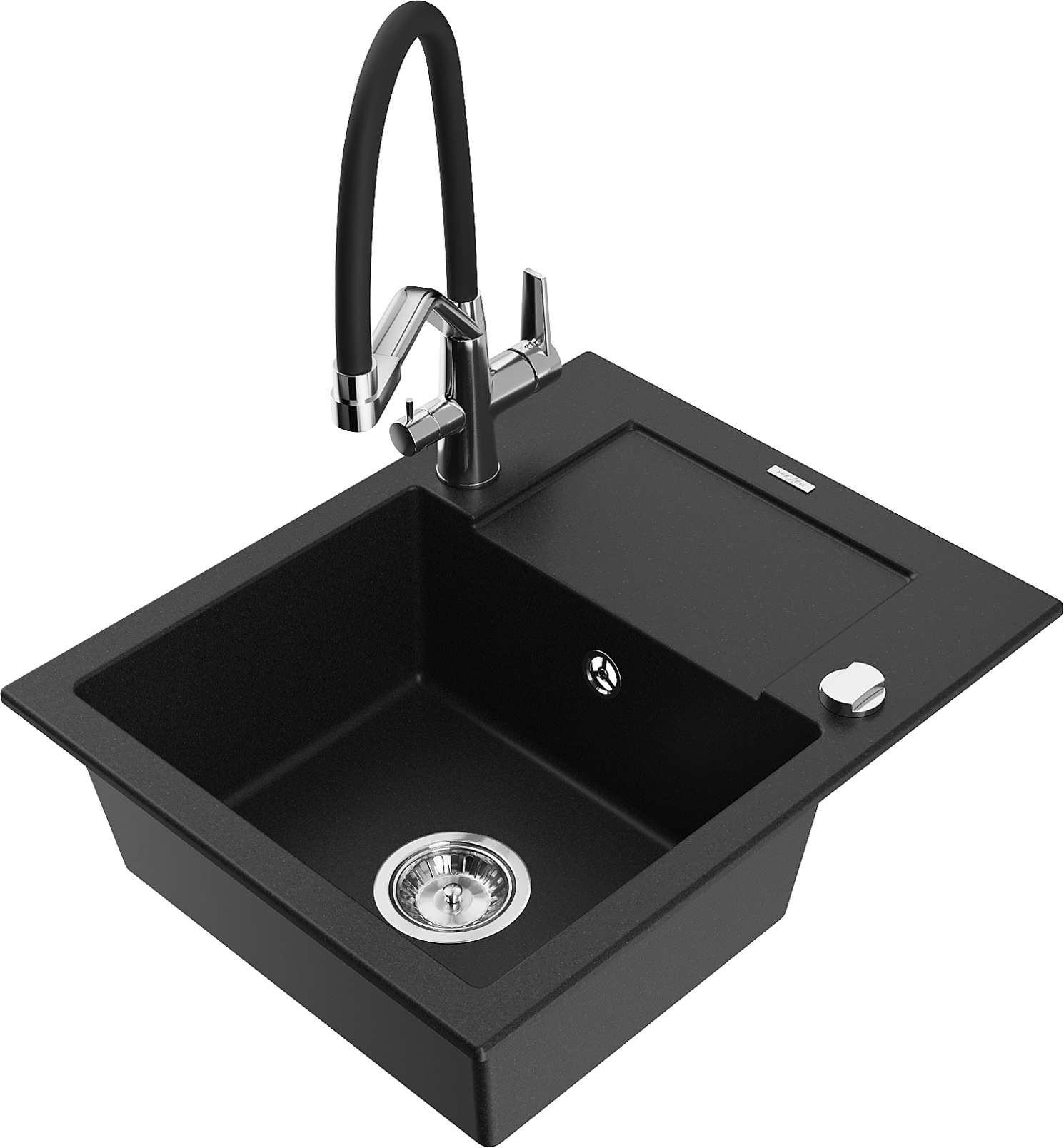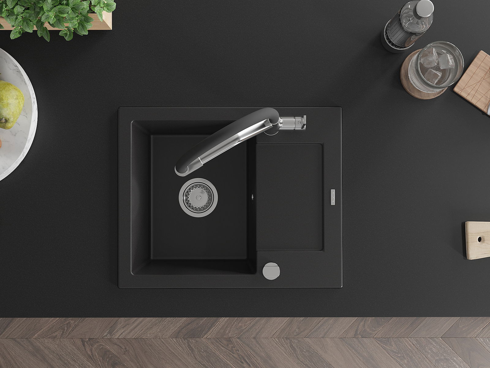 Mexen Enzo évier en granit à 1 bac avec égouttoir et robinet de cuisine Duo, noir - 6506-77-671701-07