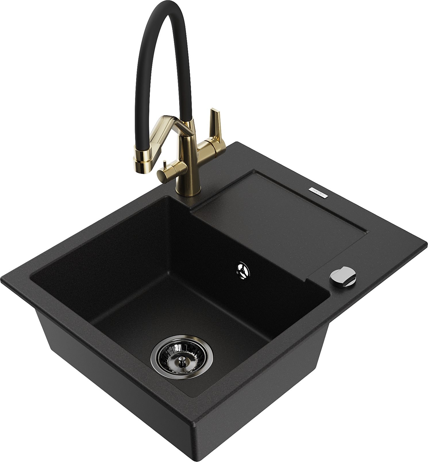 Mexen Enzo évier en granit à 1 bac avec égouttoir et robinet de cuisine Duo, noir - 6506-77-671701-57-B
