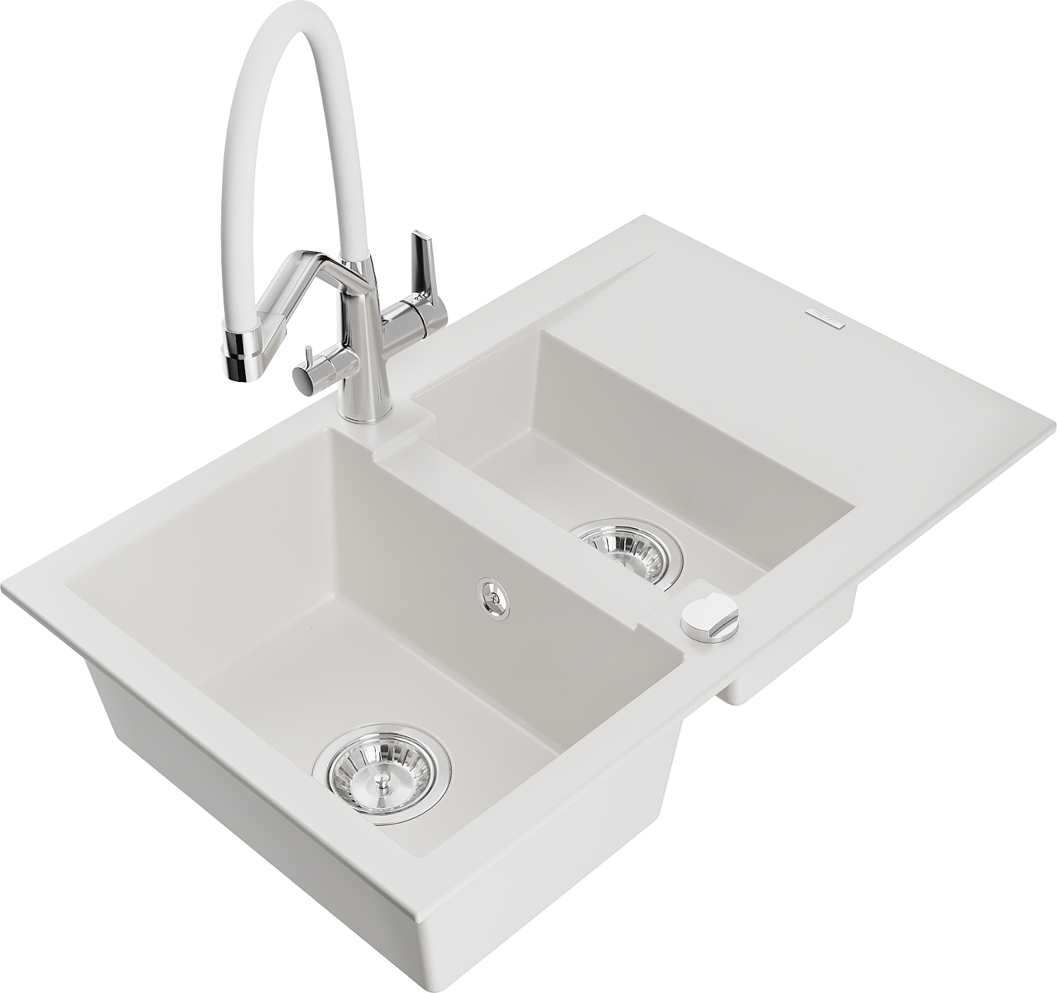 Mexen Gaspar évier granit 1,5 bac avec égouttoir et robinet de cuisine Duo, blanc - 6507-20-671701-02