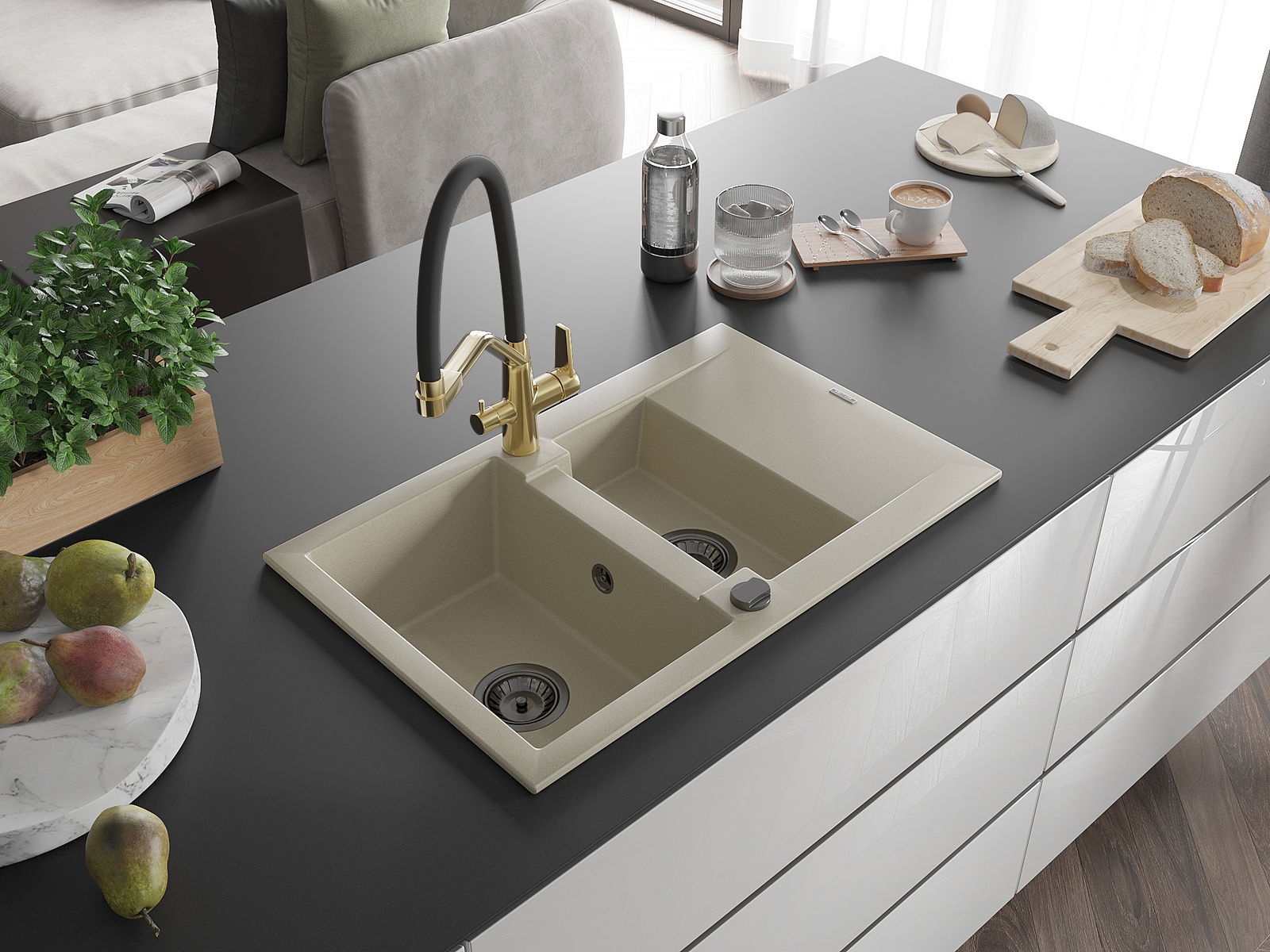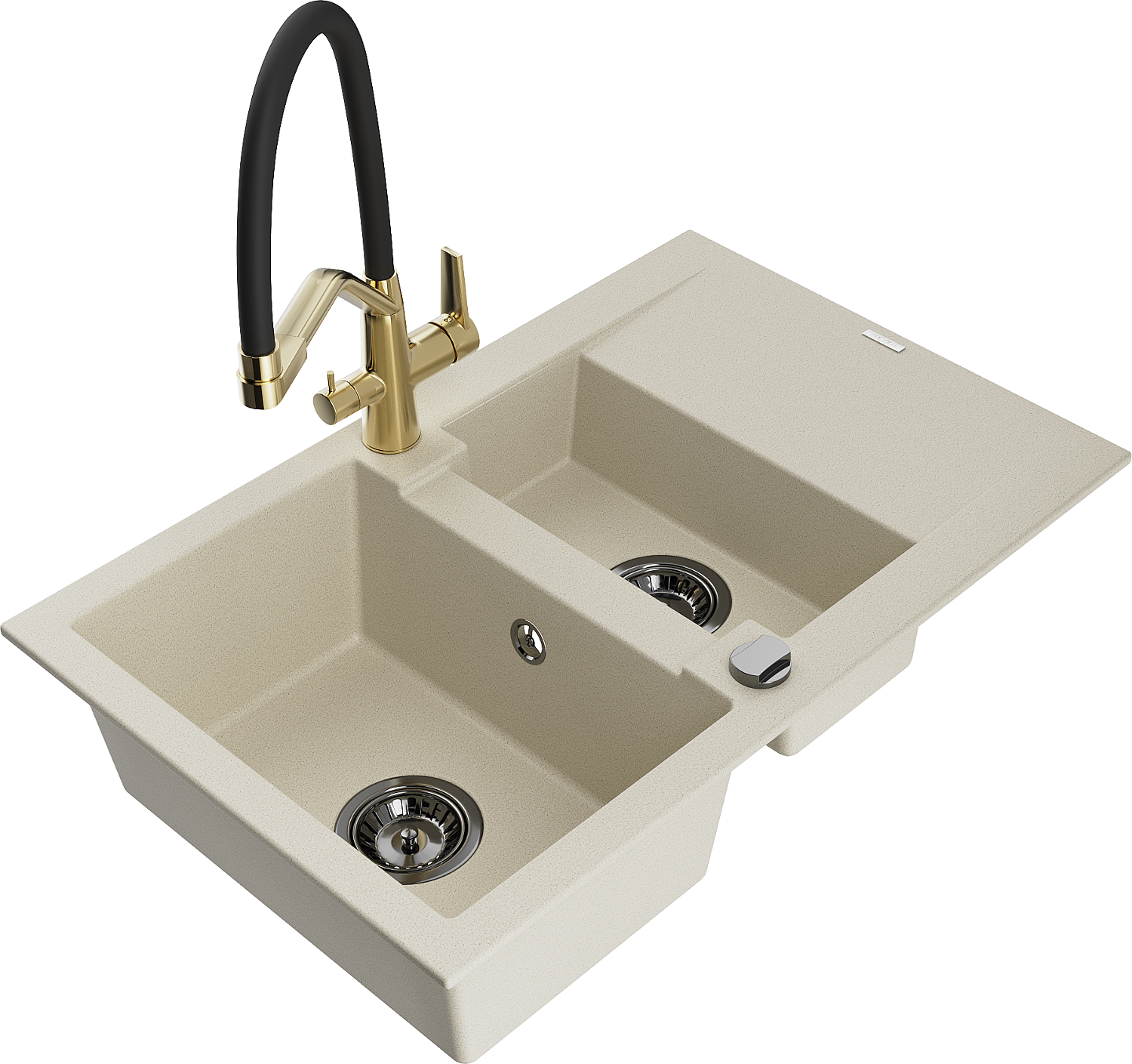 Mexen Gaspar évier en granit 1,5 bac avec égouttoir et robinet de cuisine Duo, beige - 6507-69-671701-57-B