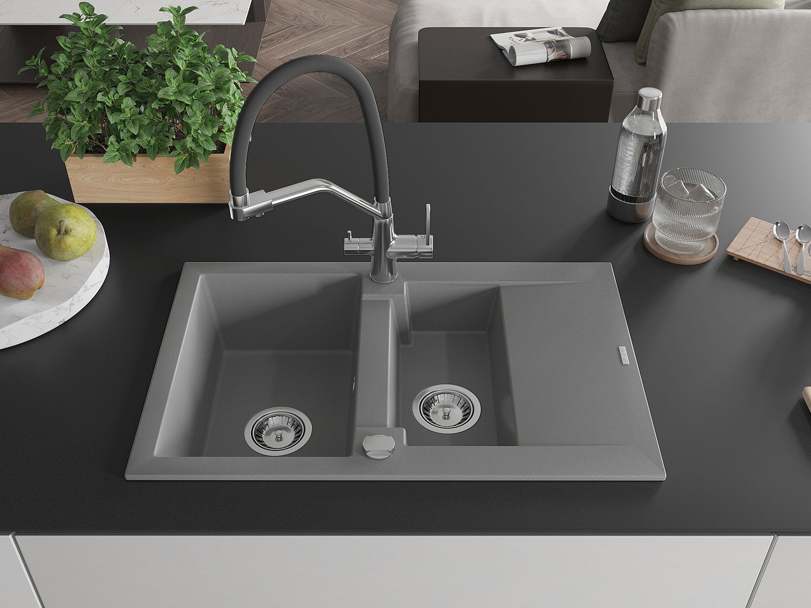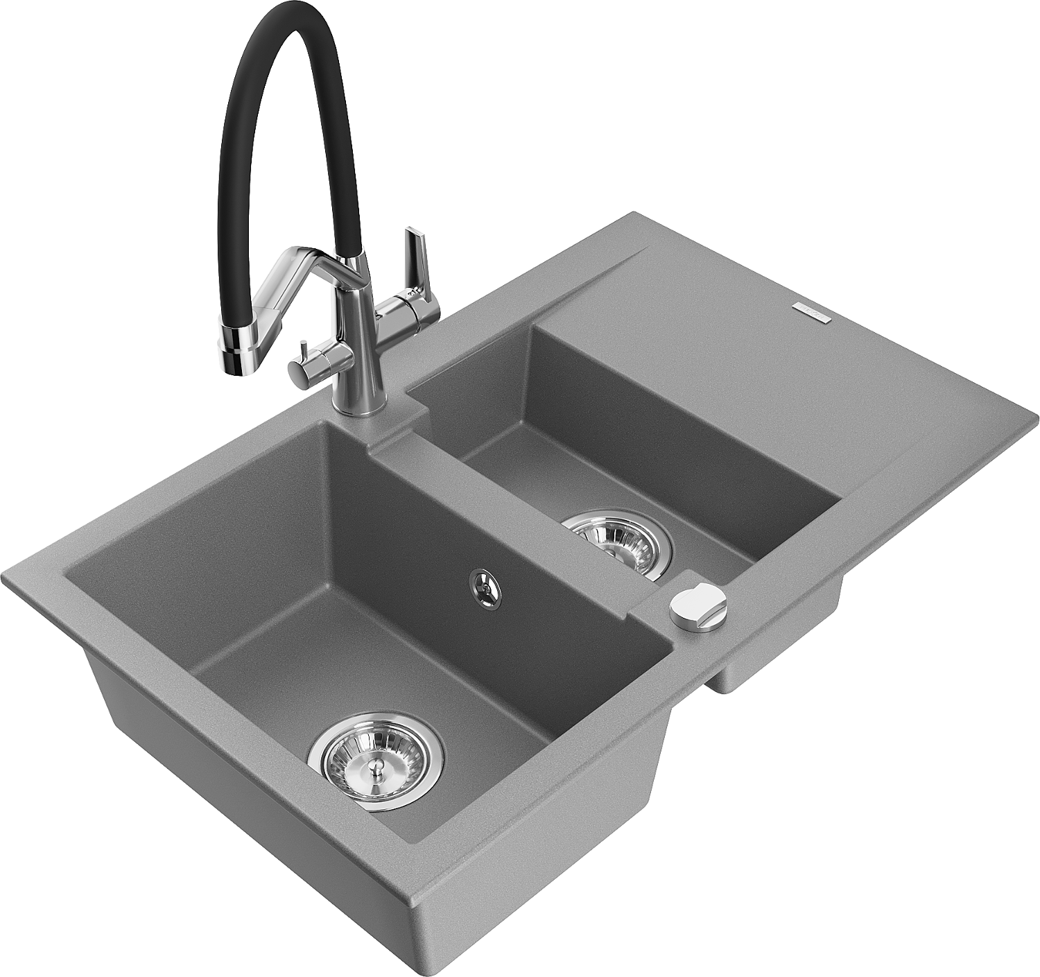 Mexen Gaspar évier en granit 1,5 bac avec égouttoir et robinet de cuisine Duo, gris - 6507-71-671701-07