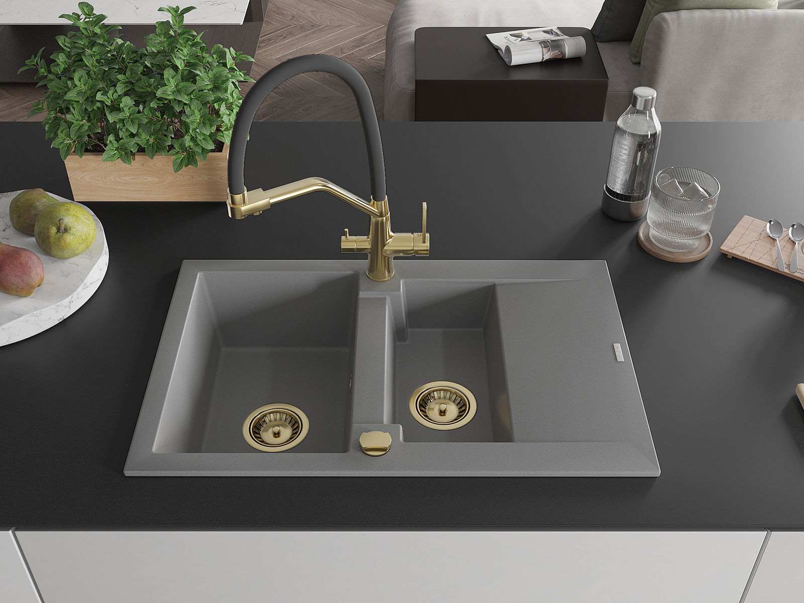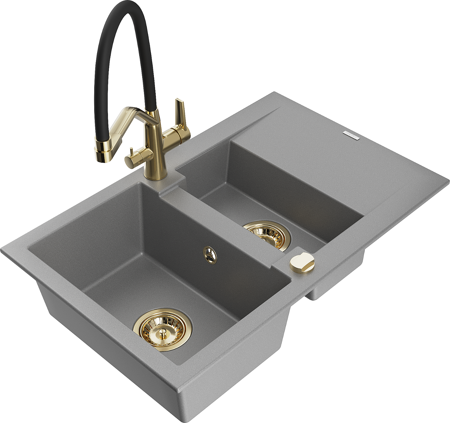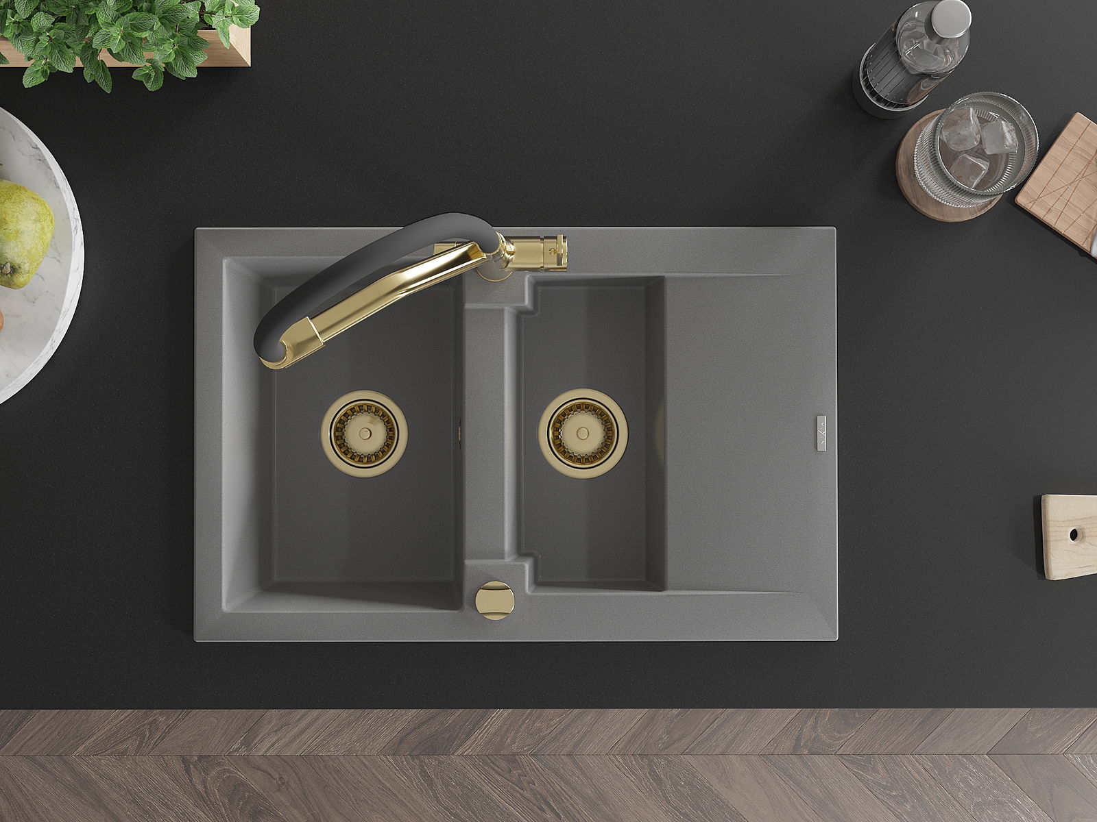 Mexen Gaspar évier en granit 1,5 bac avec égouttoir et robinet de cuisine Duo, gris - 6507-71-671701-57-G