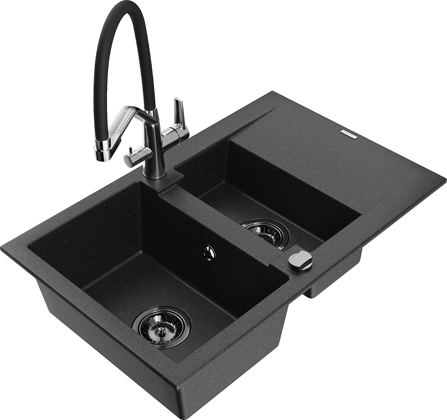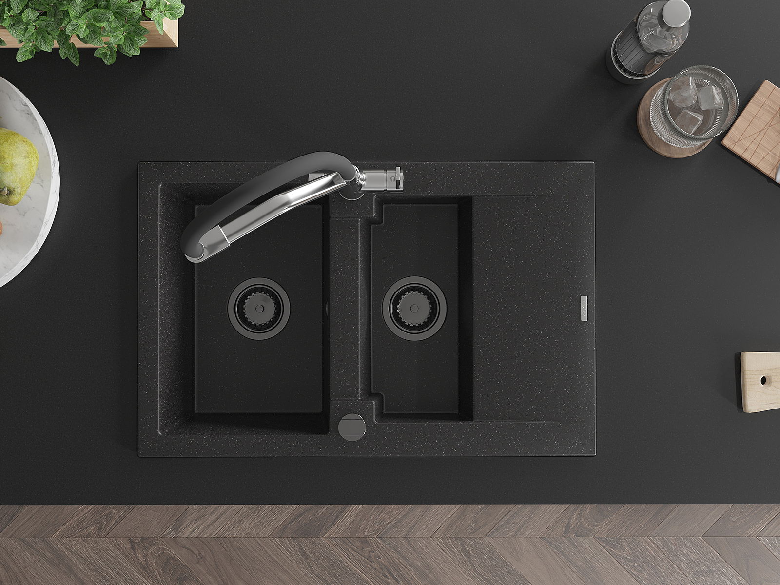 Mexen Gaspar évier en granit 1,5 bac avec égouttoir et robinet de cuisine Duo, noir/argenté - 6507-73-671701-07-B